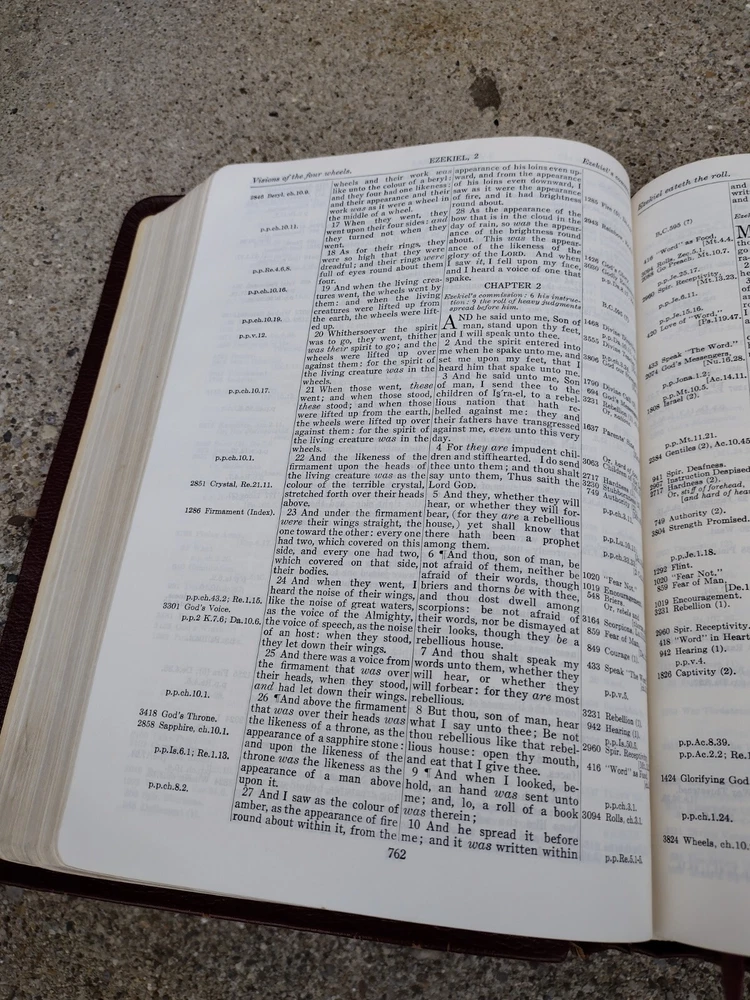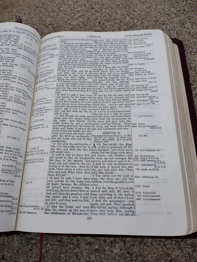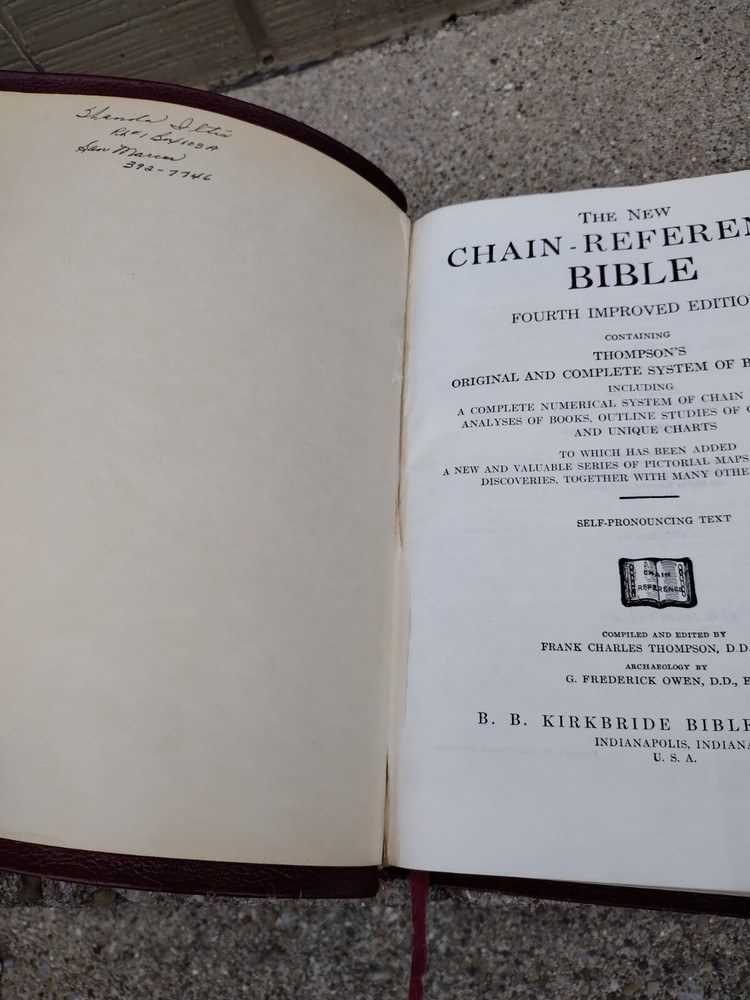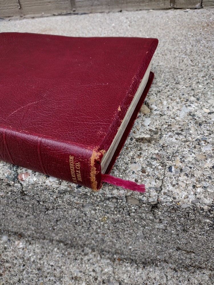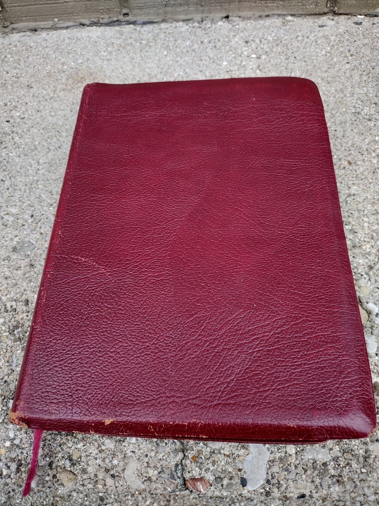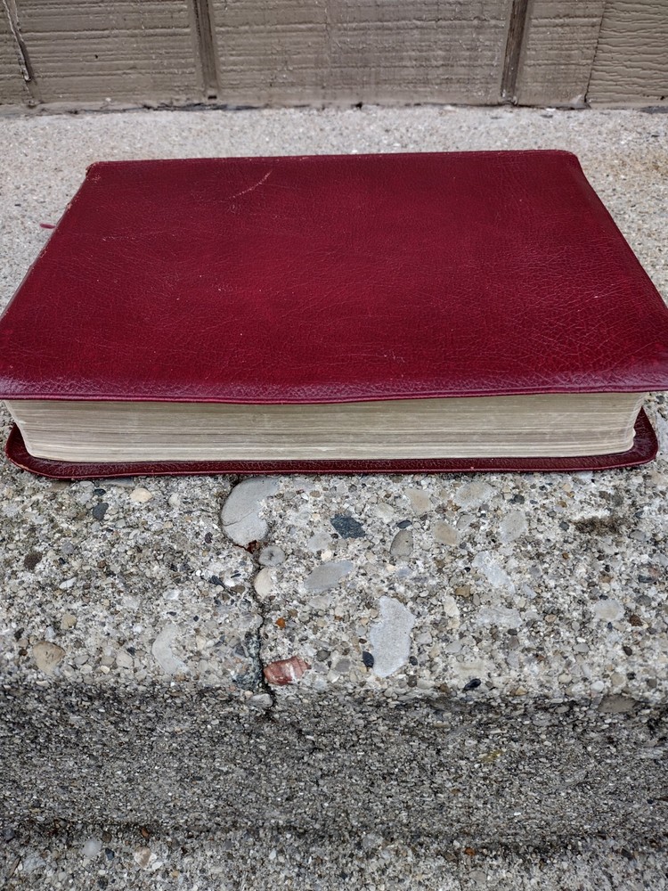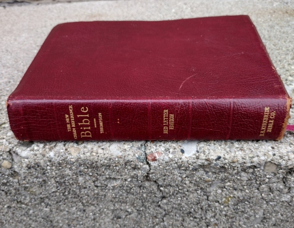 A good, solid reading/study copy! The Bible has been read, and the pages are overall good with some crinkles and creases and some limited writing/underlinig. The covers have some wear and scuffs. It appears that a title page or two have been pulled out. The words of Christ are in red leather. The covers are "Deluxe Leather Nylon Sewed." The book is a 57th reprint published in 1964 and is.a King James Version. It's definitely more of a reading/study copy than a collectible one, but it's a great resource at a nice price!