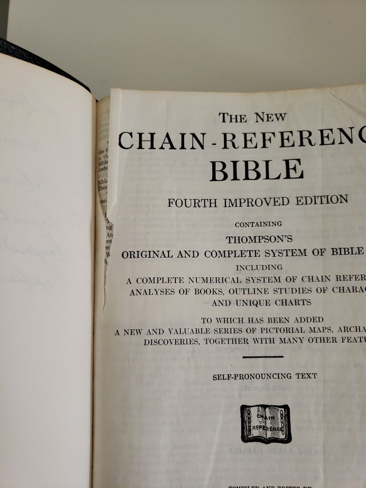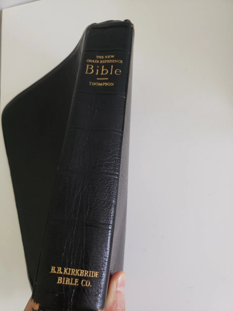 The New Chain Reference Bible Thompson 4th Improved Edition B.B. Kirkbride 1964. 55th Reprint Handwriting on front page( show in picture) One page teared. Aged discoloration. Deluxe Leather Nylon Sewed.