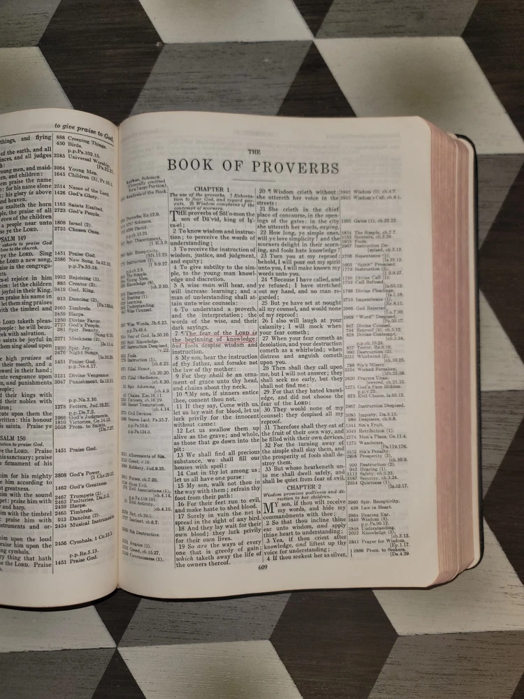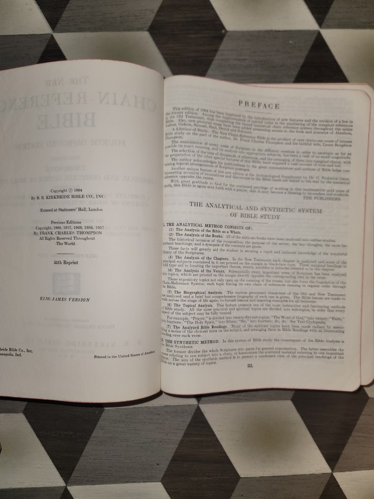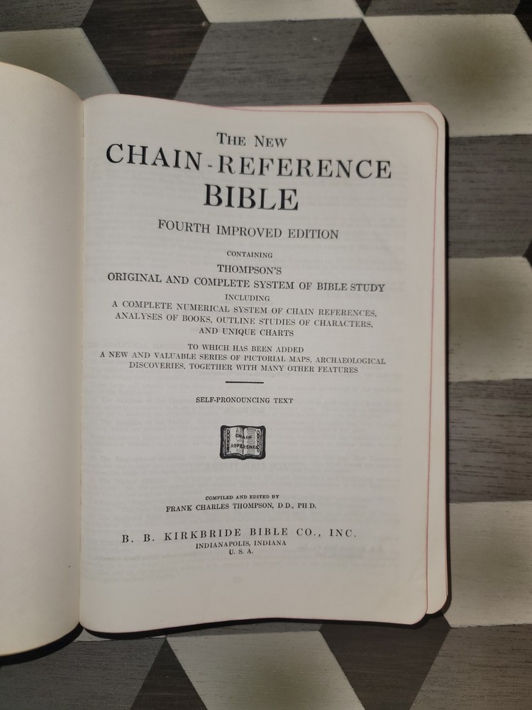 Very good condition for age, minimal highlighting, small hand written verse in the back cover pages, see photos Dive into the realm of faith with "The New Chain Reference Bible" by B.B. Kirkbride, 4th Improved Edition, a timeless treasure for both adults and young adults seeking a deeper understanding of religion and spirituality. Published in 1964, this leather-bound prayerbook is a testament to enduring spiritual literature, featuring a Self Pronouncing Text that aids in pronunciation and comprehension of biblical passages. The Bible is encased in imported Morocco nylon sewed leather, offering a dignified and durable cover that has withstood the test of time. With its focus on religious and spiritual genre, it is an essential addition to any collection, providing a nonfiction narrative that explores the richness of religion and beliefs. This vintage piece, crafted in the United States, is a testament to the enduring nature of faith and the human spirit.