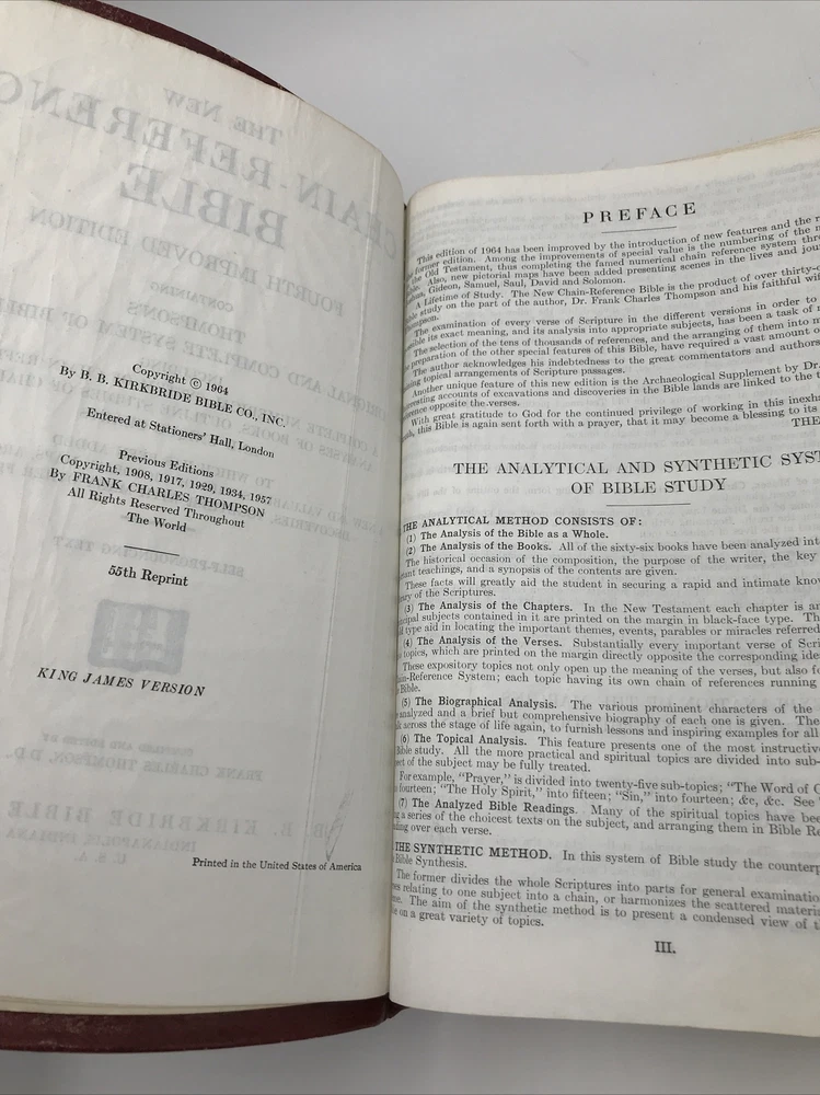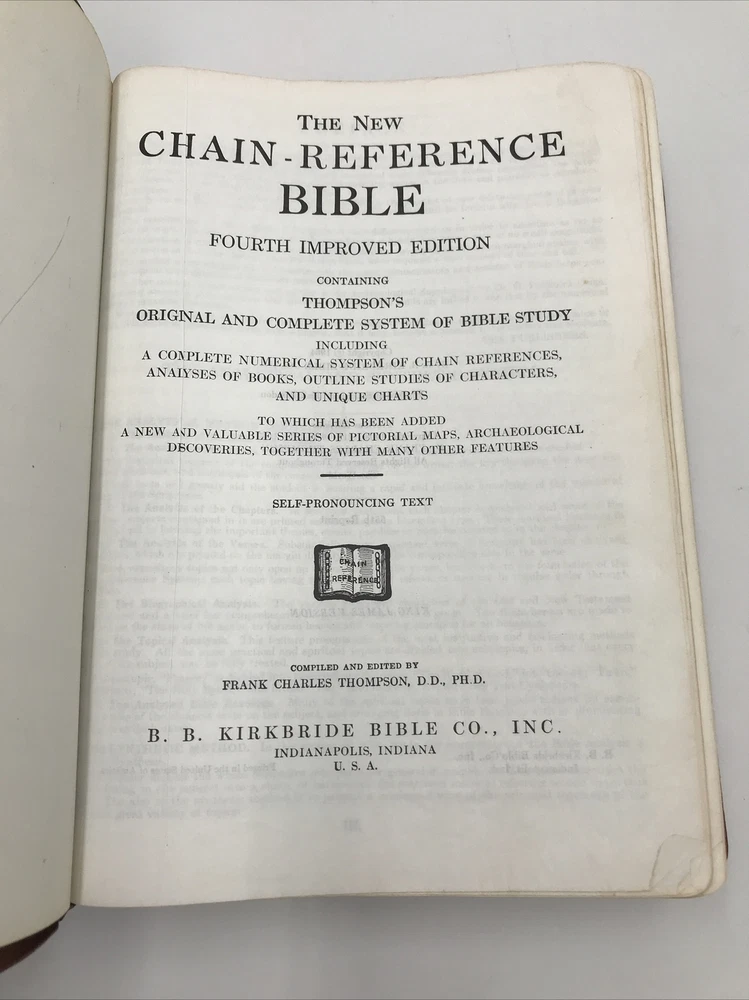 The New Chain Reference Bible - Thompson BB Kirkbride Bible Co. 1964 Leather. Condition is "Acceptable". Shipped with USPS Media Mail....