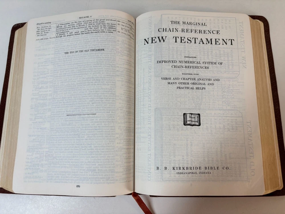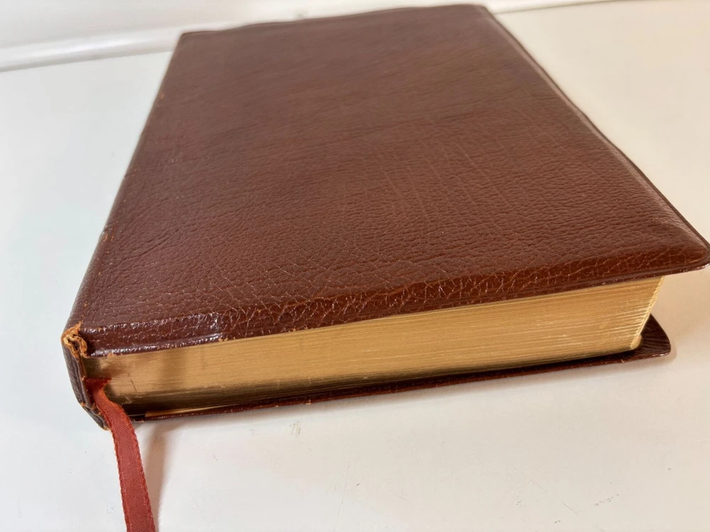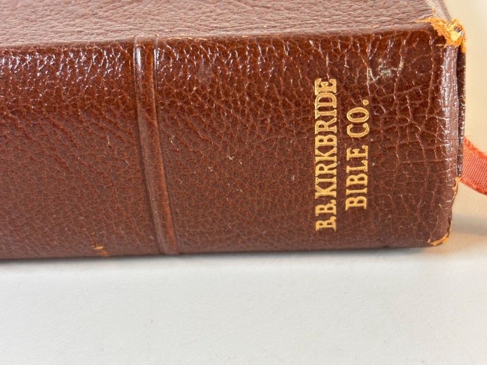 • Leather-bound cover with gold embossed lettering • Includes Thompson's numerical chain reference system • Contains maps, outlines, and analytical tools • Printed by B.B. Kirkbride Bible Co., 1964 • 55th reprint edition • Includes Old and New Testaments • Ribbon page marker for convenience • Easy-to-read layout and font Minor scuffs on spine edges, otherwise in good condition. Measurements: 9.5 x 7 x 1.5 inches.