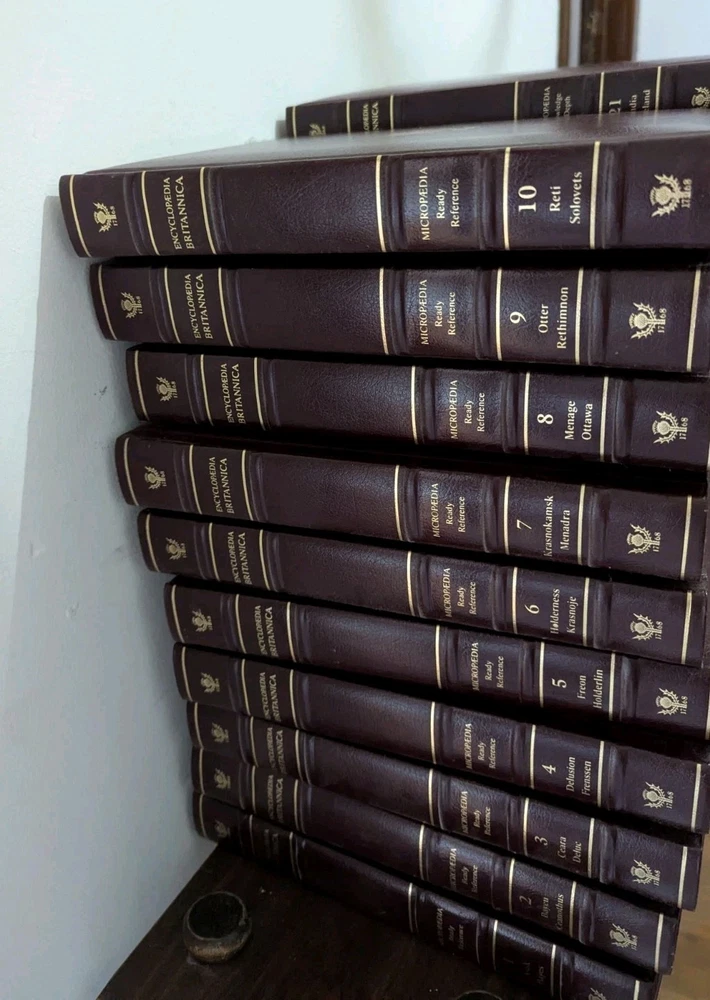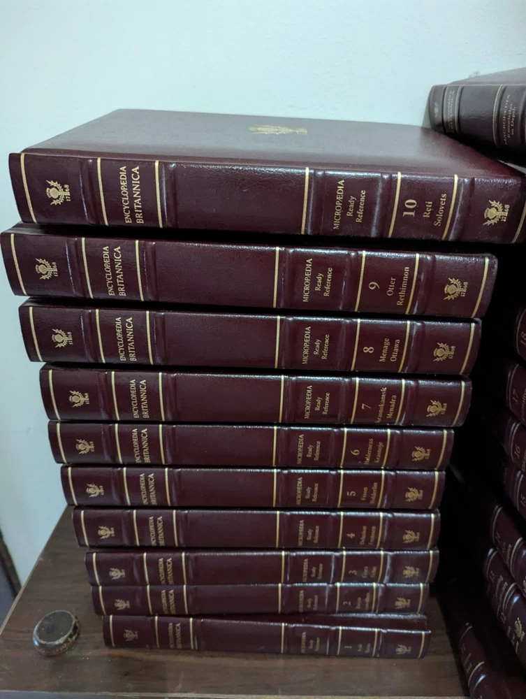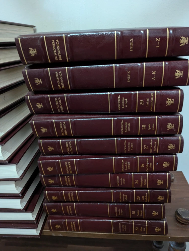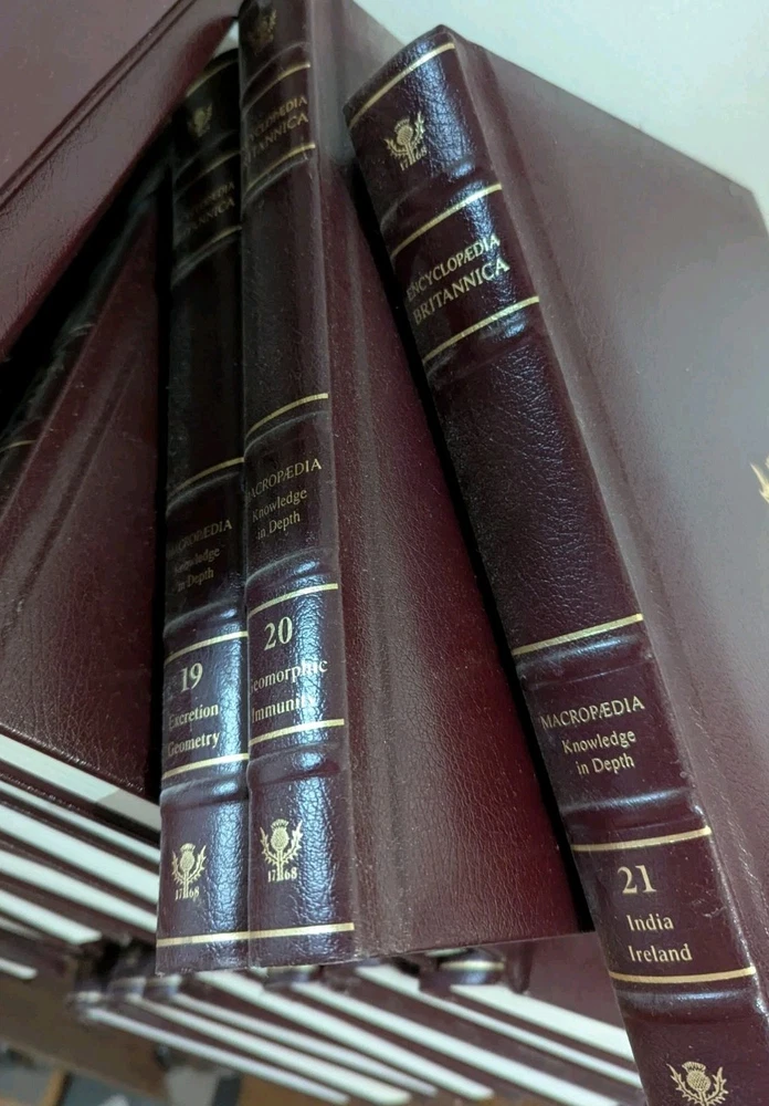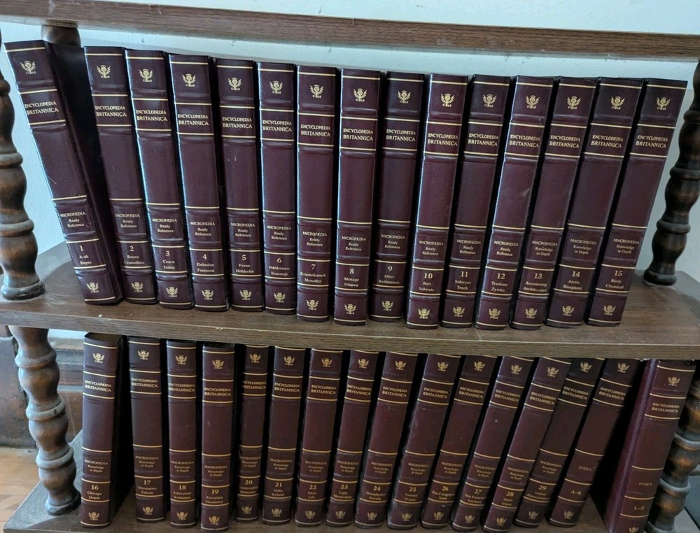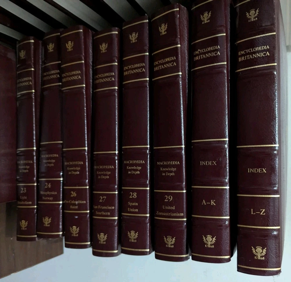 The New Encyclopedia Britannica 15th Edition Padded Brown Leather 31 Volume. 29 volumes of encyclopedia and 2 indexes. I'm not sure how many are supposed to be in the set. They are in amazing condition, although kind of dusty. They haven't been used much if at all. They've been collecting dust for decades and the leather is in amazing condition as well. The shelf does not come with the books. It is the 15th set and the range of printings in the 15th edition is many years. I believe the printing date was 1993. If you have any questions please ask. Sold as is.