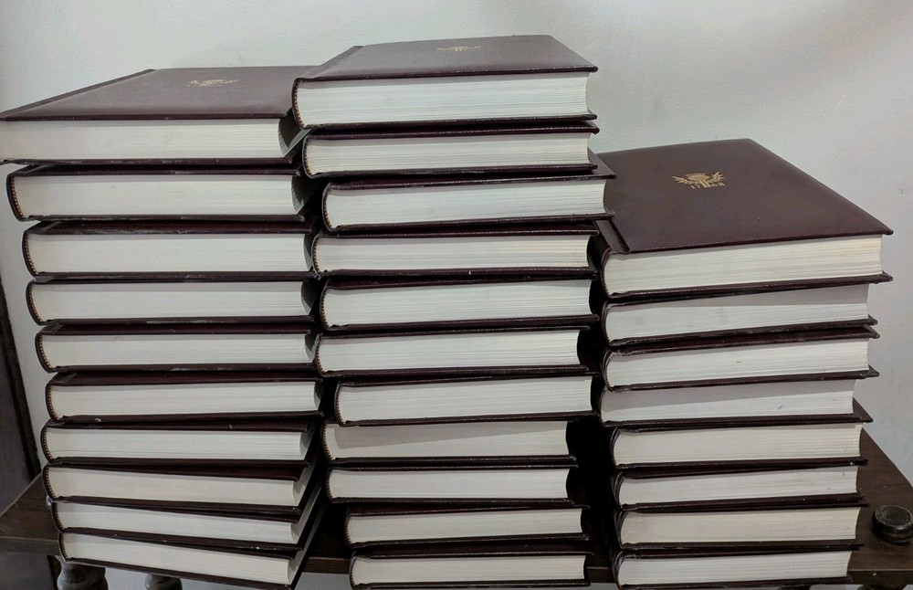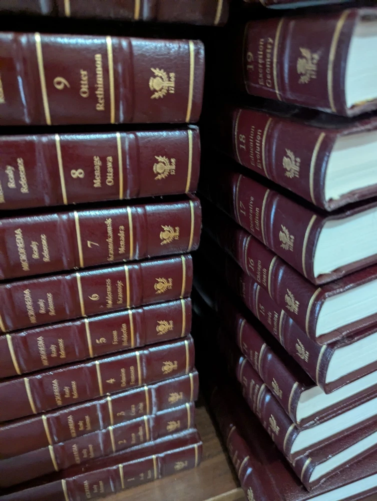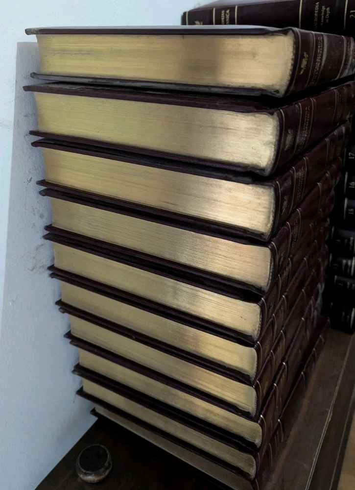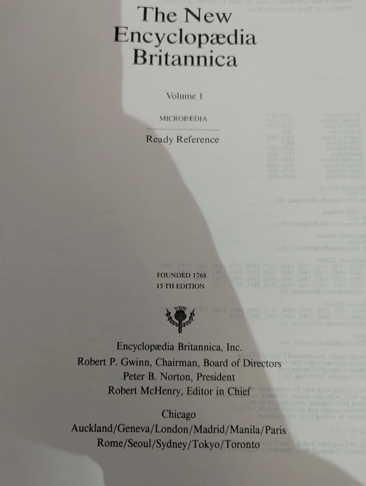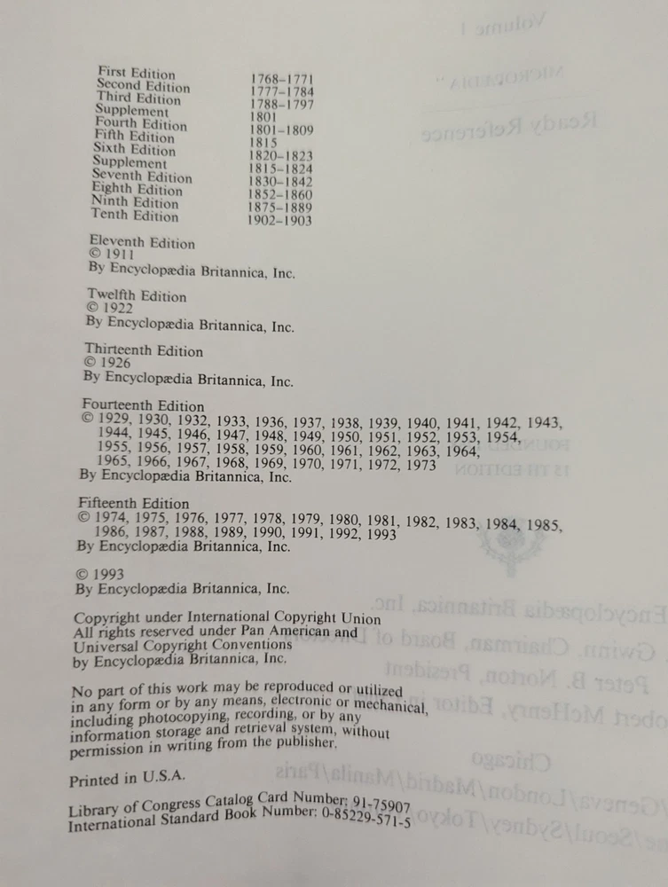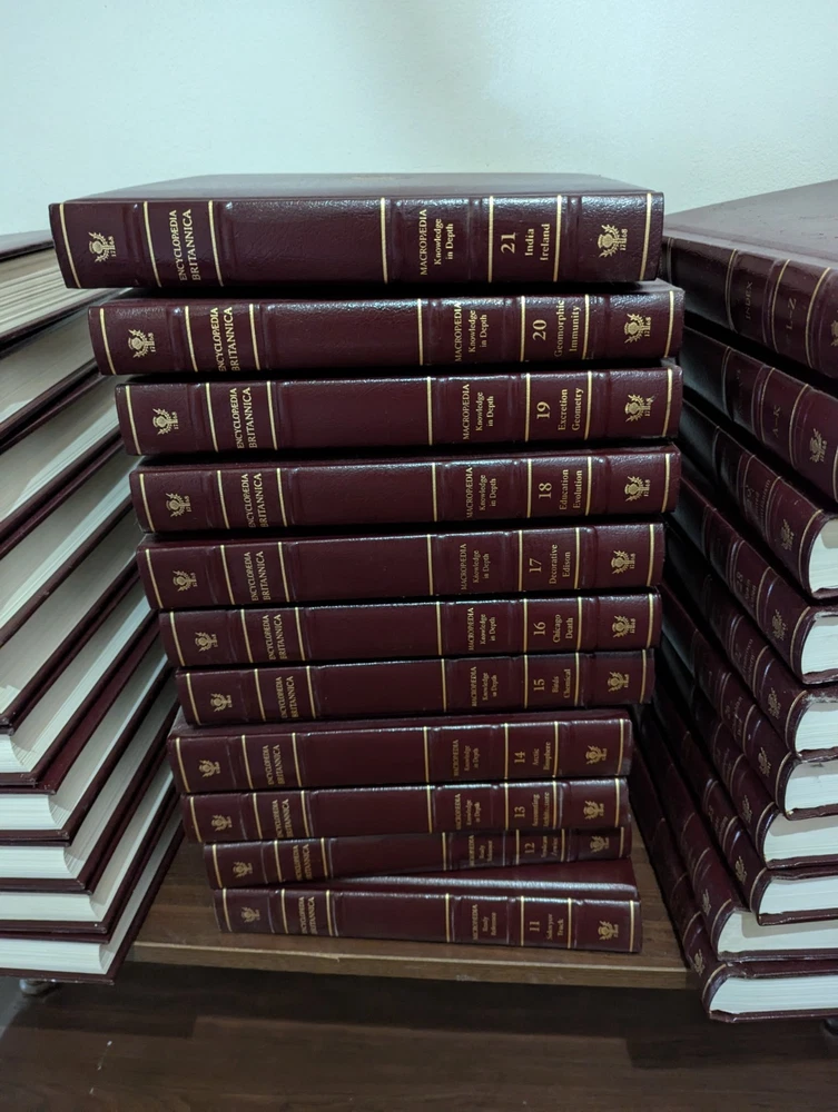 The New Encyclopedia Britannica 15th Edition Padded Brown Leather 31 Volume. 29 volumes of encyclopedia and 2 indexes. I'm not sure how many are supposed to be in the set. They are in amazing condition, although kind of dusty. They haven't been used much if at all. They've been collecting dust for decades and the leather is in amazing condition as well. The shelf does not come with the books. It is the 15th set and the range of printings in the 15th edition is many years. I believe the printing date was 1993. If you have any questions please ask. Sold as is.