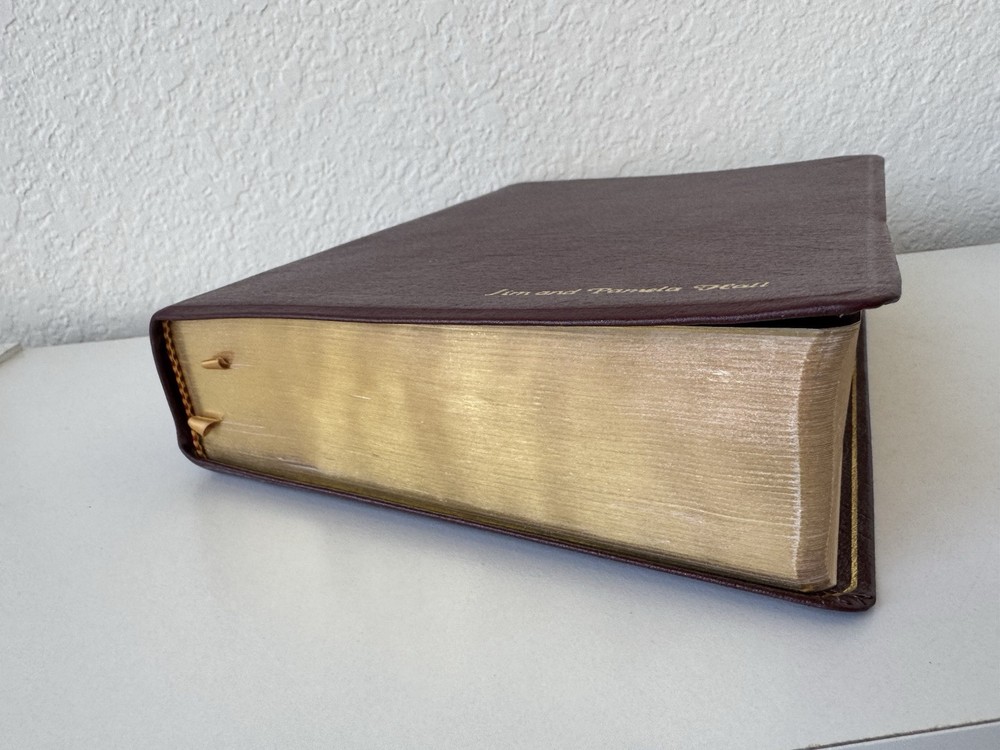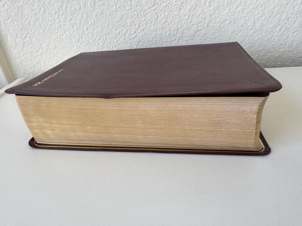 Please see all photos for most accurate description to the leather binding as well as the pages inside You can see there are a few small issues here and there so please focus on the photos There is no writing inside and there is no odors to this Bible Will be shipped next business day bubble wrapped in a box thank you BBLBX