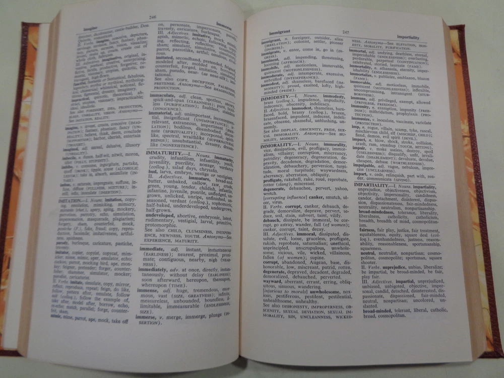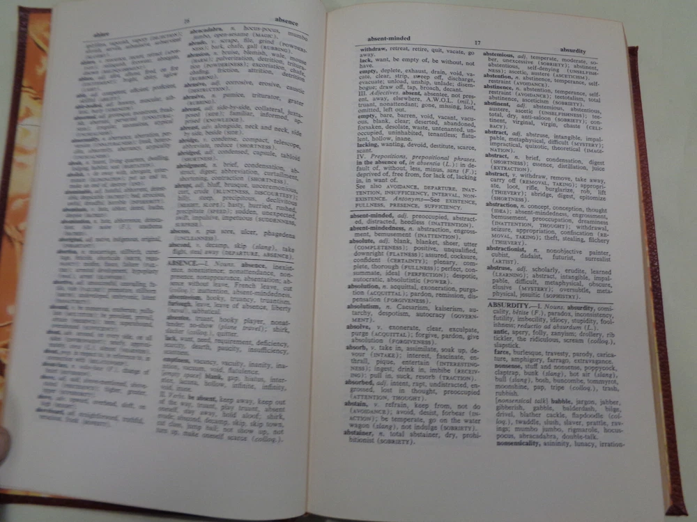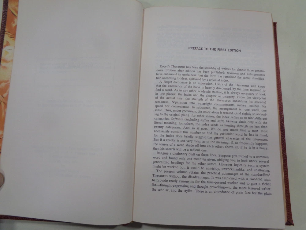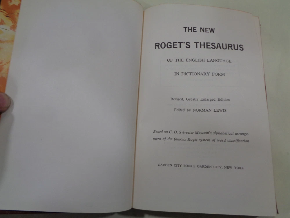 The New Roget’s Thesaurus 1961 Leather AMSCO Edition Promotional The New Roget’s Thesaurus The book features a unique look at the world of reference with lots of interesting information and exhaustive research, plenty of biographical details and neat stories, book is out of print. The book is a special leather-bound edition from the American Mineral Spirits Company(AMSCO), displays very nicely. Copyright-1961 Pages: 552 pages Publisher: Garden City Books The book measures approx. 9 ½ by 6 ½ inches. The cover is nice and clean with some slight wear and rubbing, overall nice condition. The spine end is nice with some light wear and scuffing. The boards and corners are nice with some minor denting and wear. The hinges and binding are tight and strong. The pages are bright and clean, book is nice and clean. Shipping weight is 5 pounds Inventory: 0123ZC013