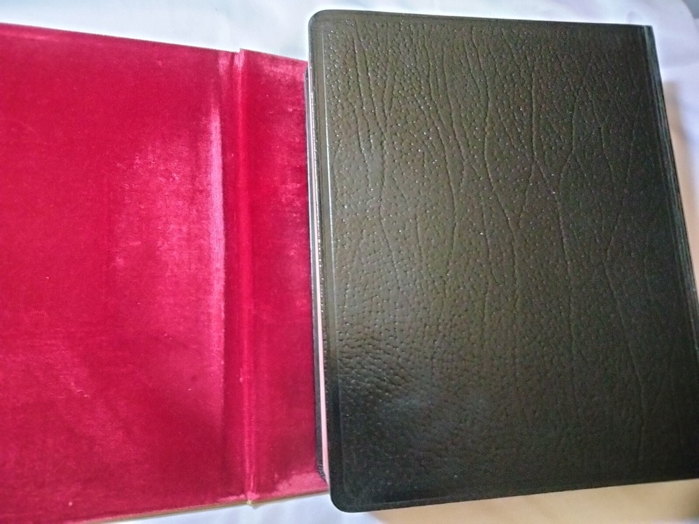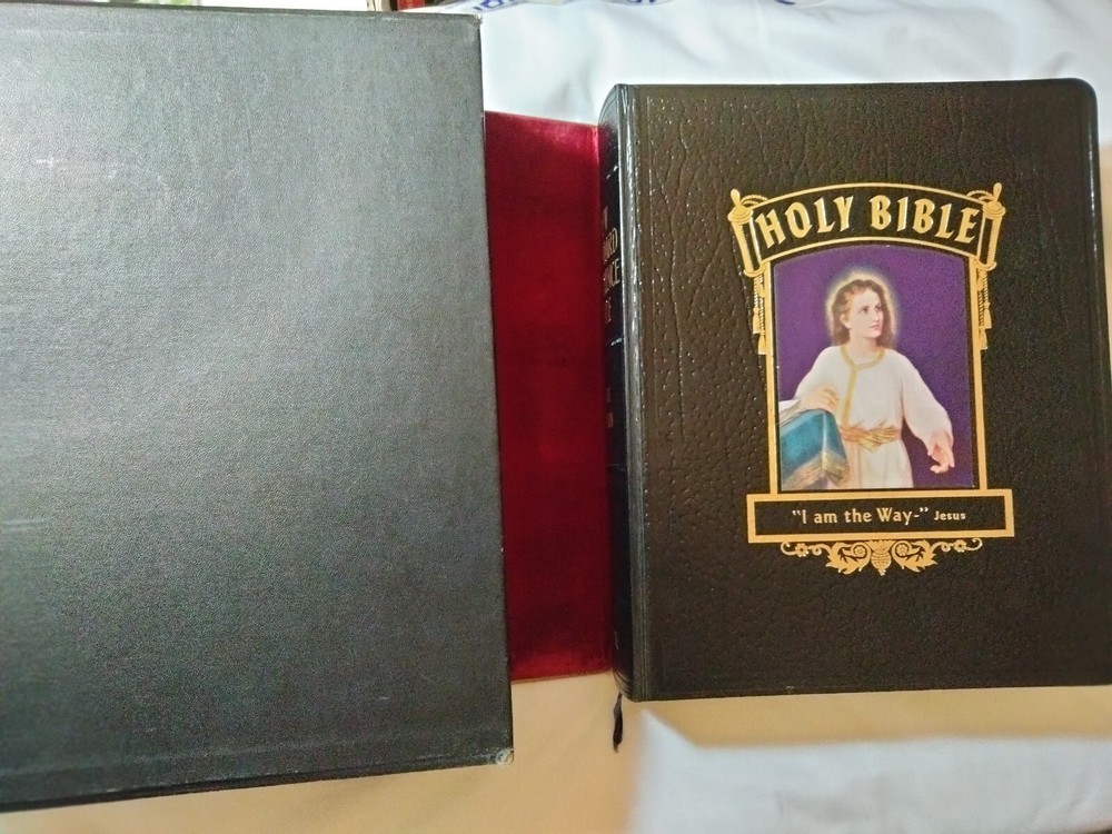 comes with slip cover and protective cover -- Bible in nice shape / former owner's info at front / minor marks in book - if any writing it is minimal / shelf-wear / wear on slip cover