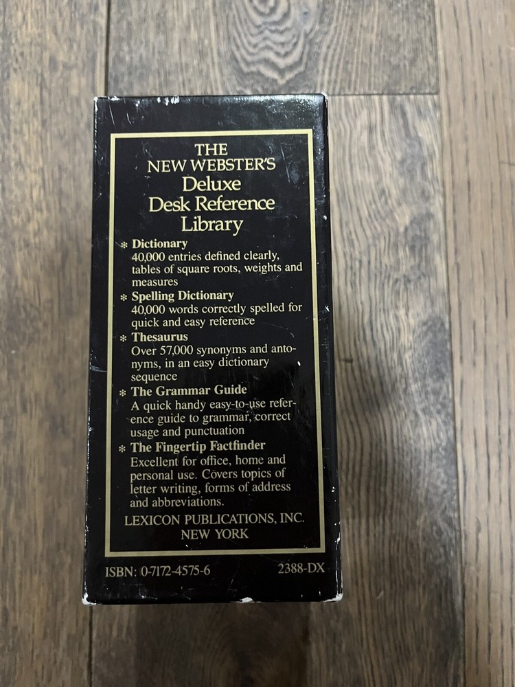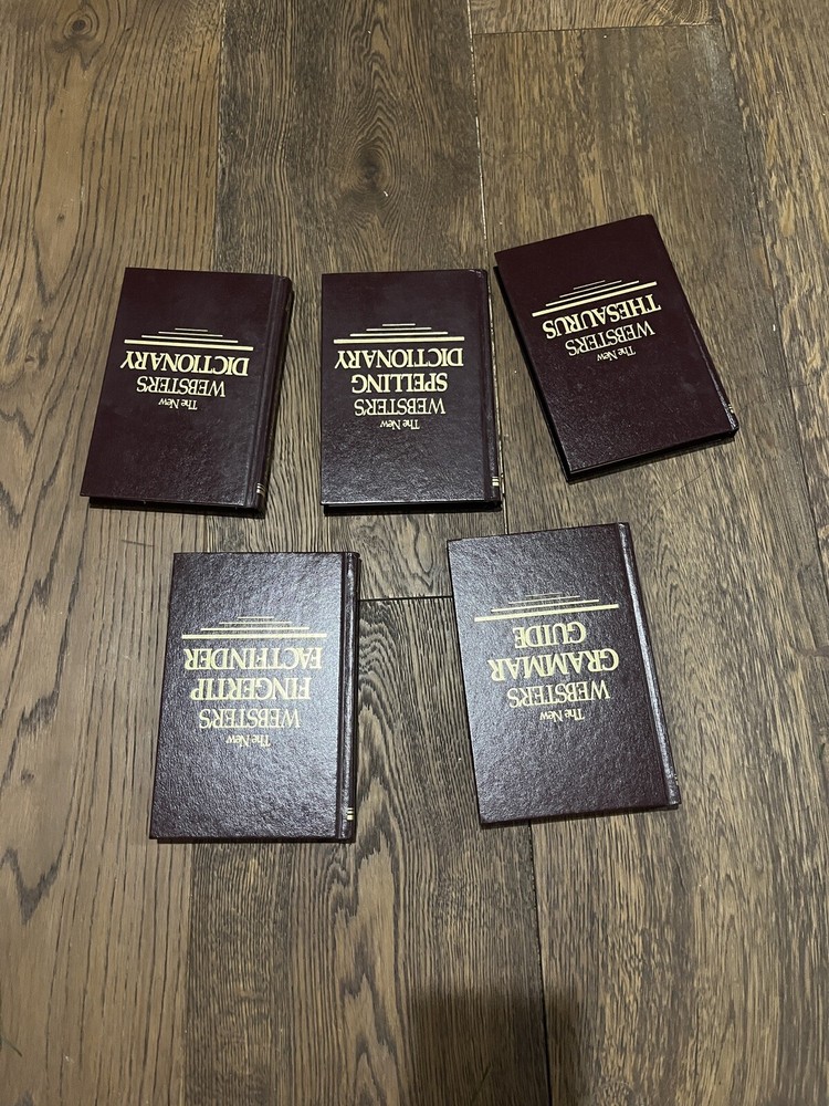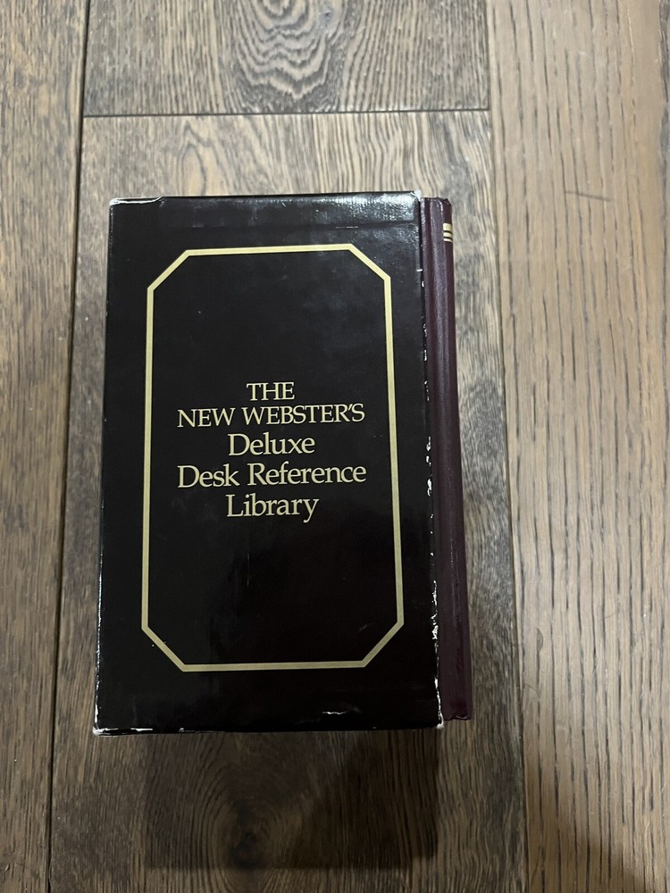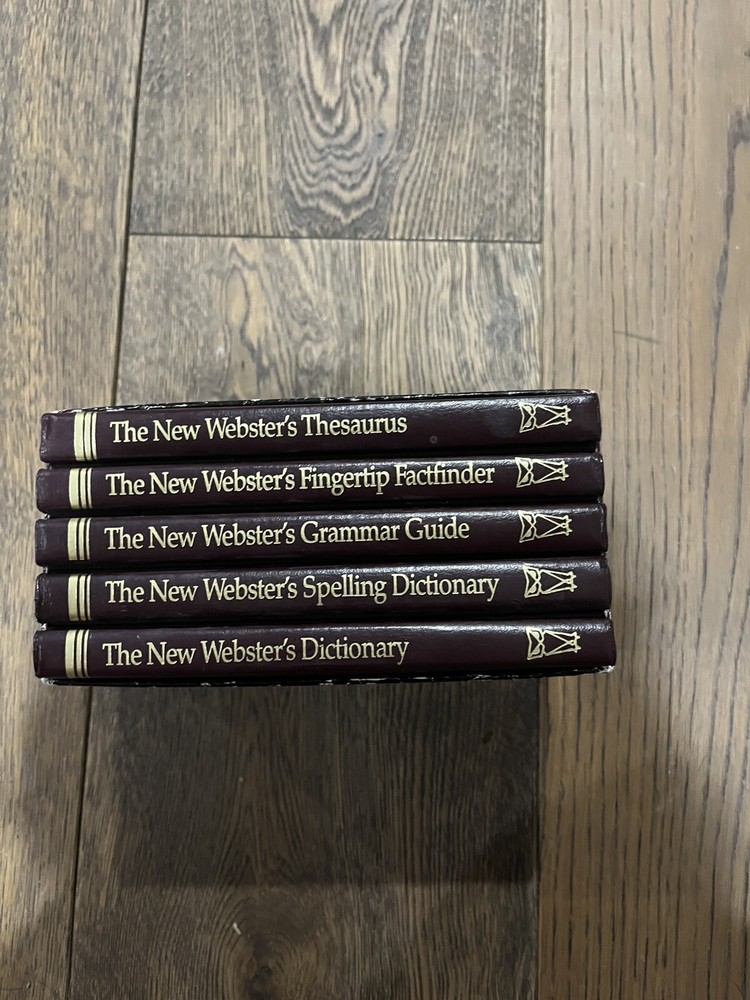 The New Webster's Deluxe Desk Reference Library 5 Book Slipcase Set Grammar 1986/1987 Books do have a name plate on the inside cover. Can likely be removed ....