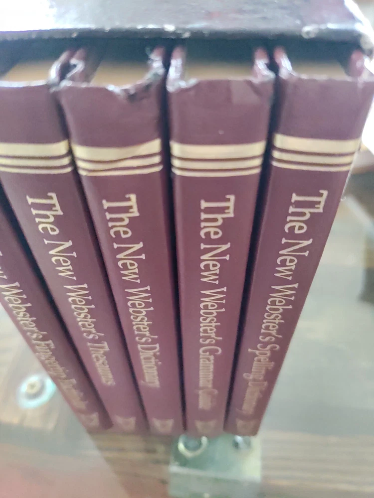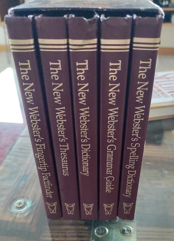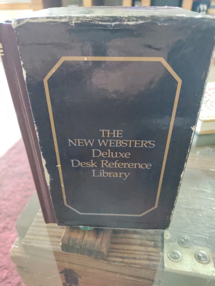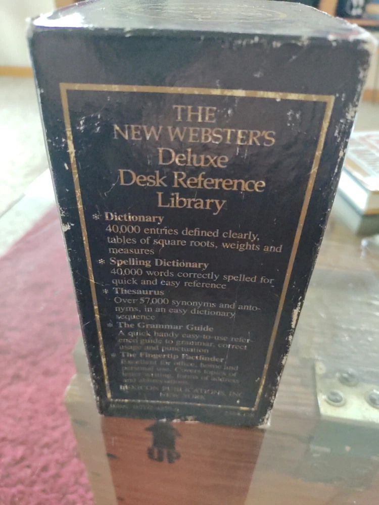 The New Webster's Deluxe Desk Reference Library Leather Hardcover Dictionary. Box has some wear. A couple.of the books have minor damage on top cover. Please see pictures for condition.