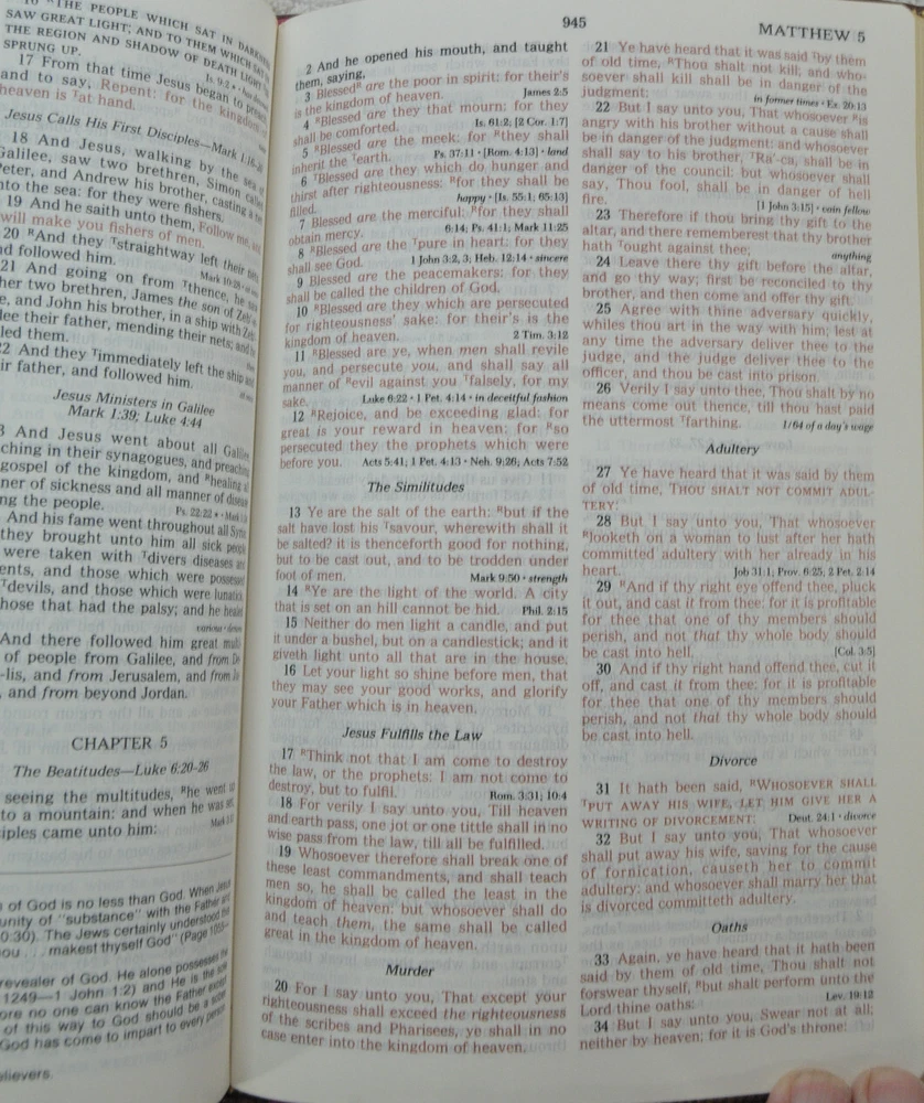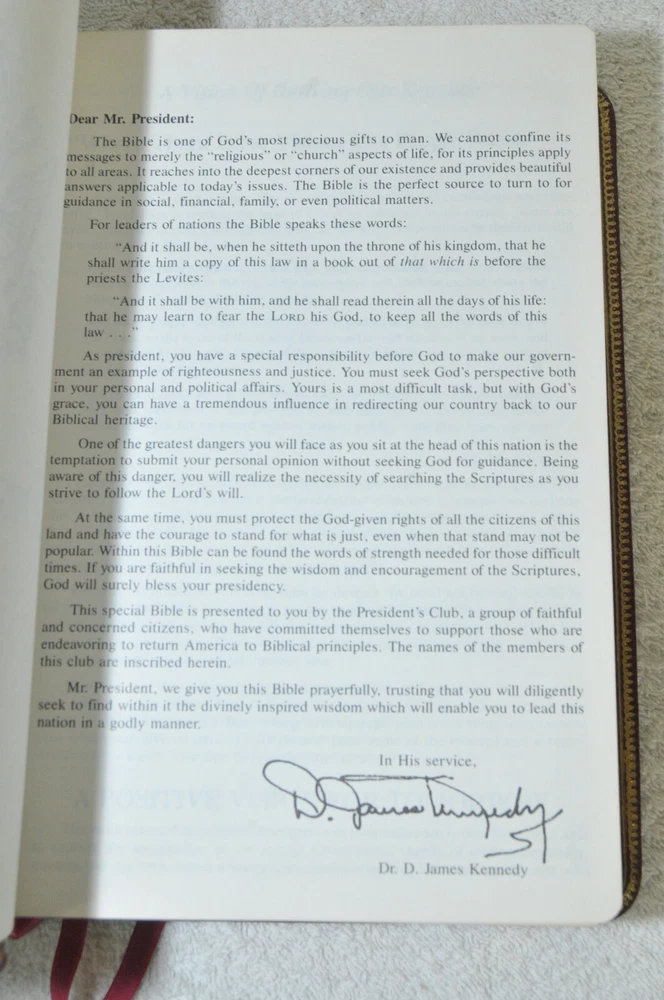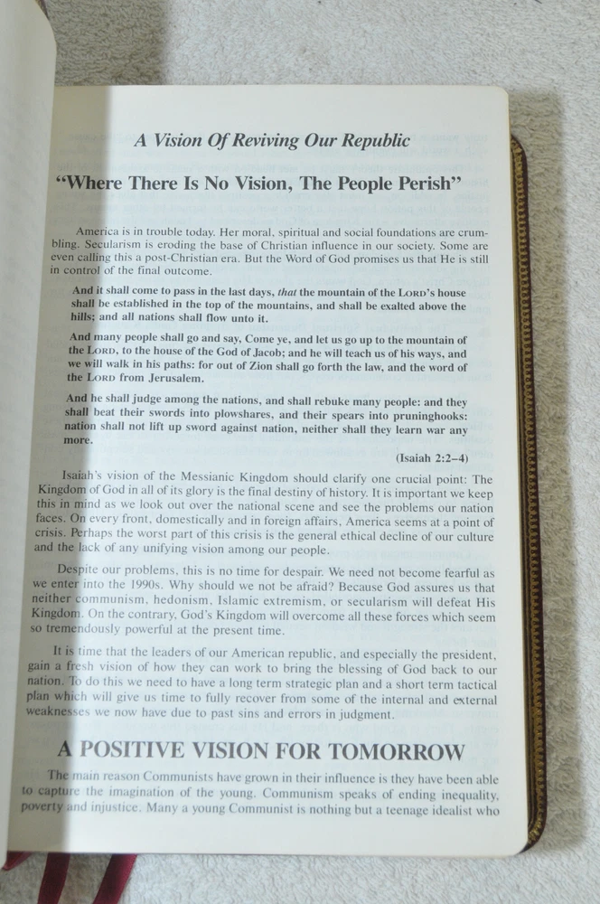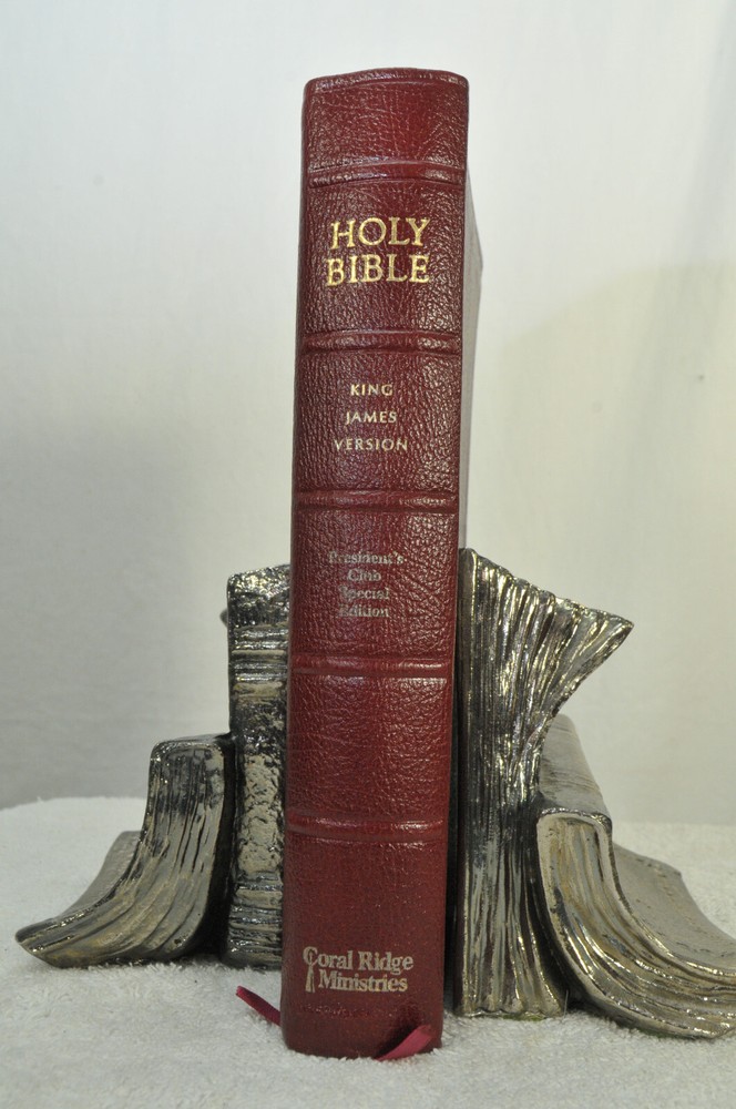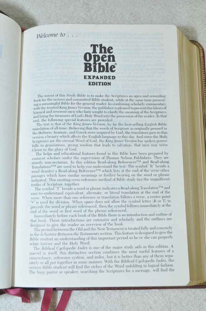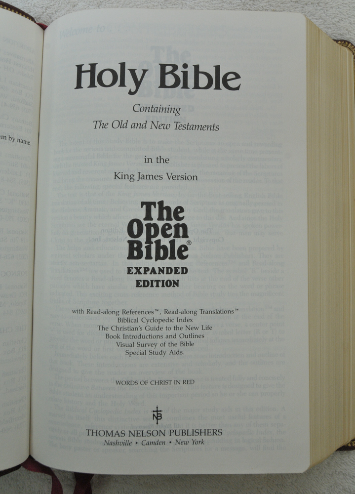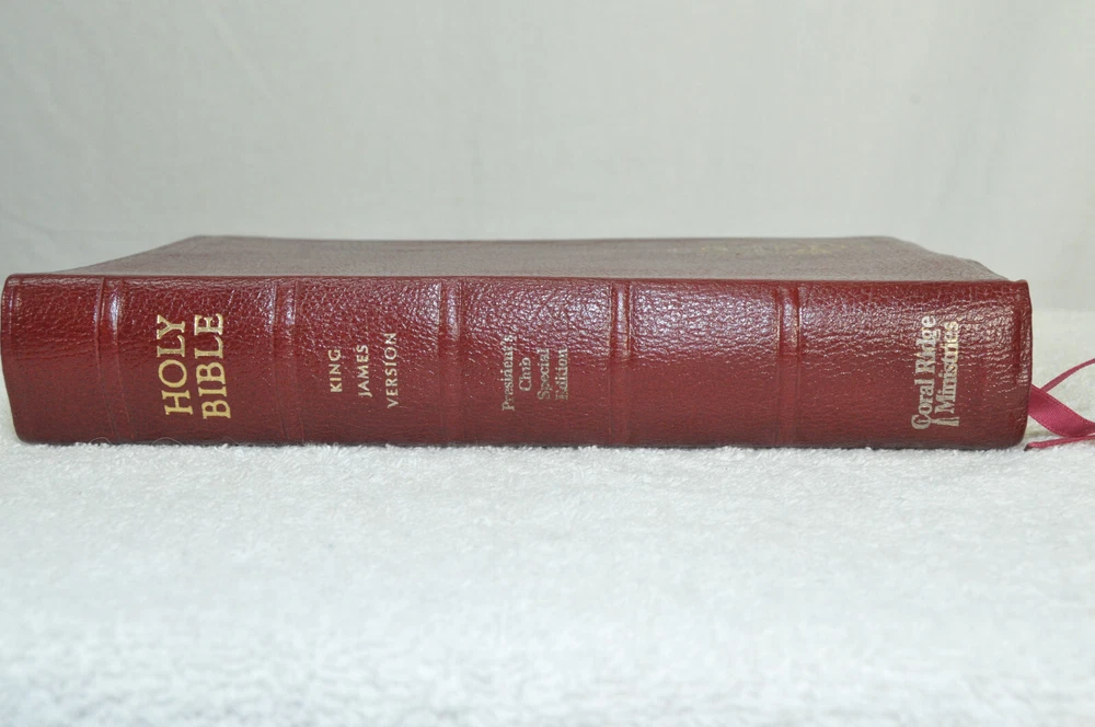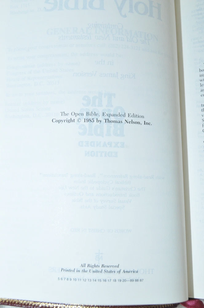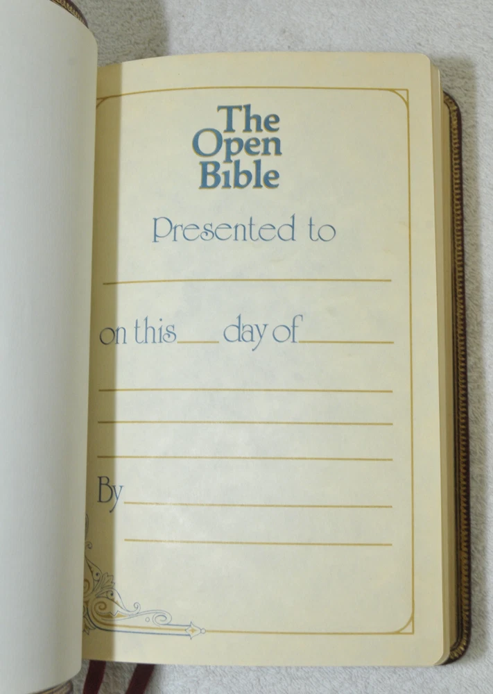 The Open Bible Expanded Edition King James Version. Copyright 1988. Genuine Leather Bound President's Club Special Edition by Coral Ridge Ministries Burgundy Cover. Published by Thomas Nelson Publishing in the USA. This is a Red Letter Edition. The Bible contains such helps, as the Biblical Cyclopedic Index, Concordance and Maps. It is a beautiful Bible in Like New condition. Just as the early pages stated "A Vision of Reviving Our Republic" this Bible would serve a Spiritual Warrior for Many years to come, if they take reasonable care of this Bible. Hopefully A Bible like this was preserved these 37 years, waiting for the right Spiritual Warrior for Such A Time As This In Our Country's History. Like new condition. No wear on cover. No hand writing, highlighting, or underlining inside this Bible. No creased, nor dogeared pages in this Bible. Please see all photos for details and condition.