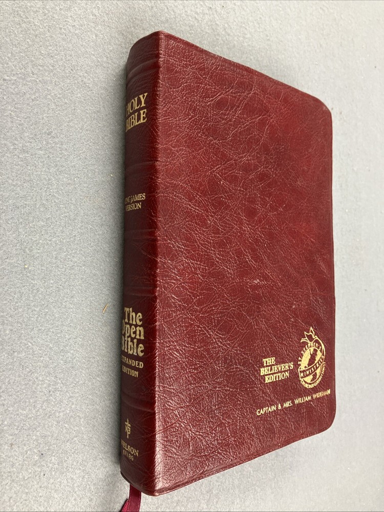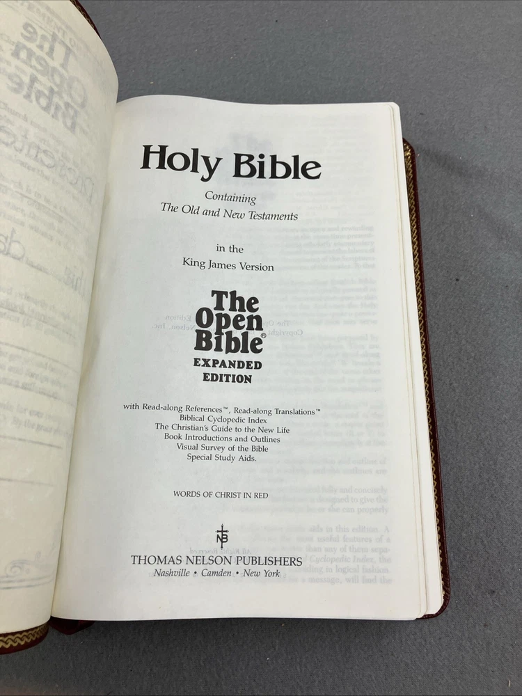 The Open Bible Expanded Edition Walk Thru Edition Genuine Leather Nelson NKJV VERY GOOD CONDITION -- CLEAN COPY/NO MARKINGS ON THE INSIDE (see pics) *Item will be protected well for shipping and comes with a tracking number for confirmation.* I ship out items every day so expect a quick delivery!