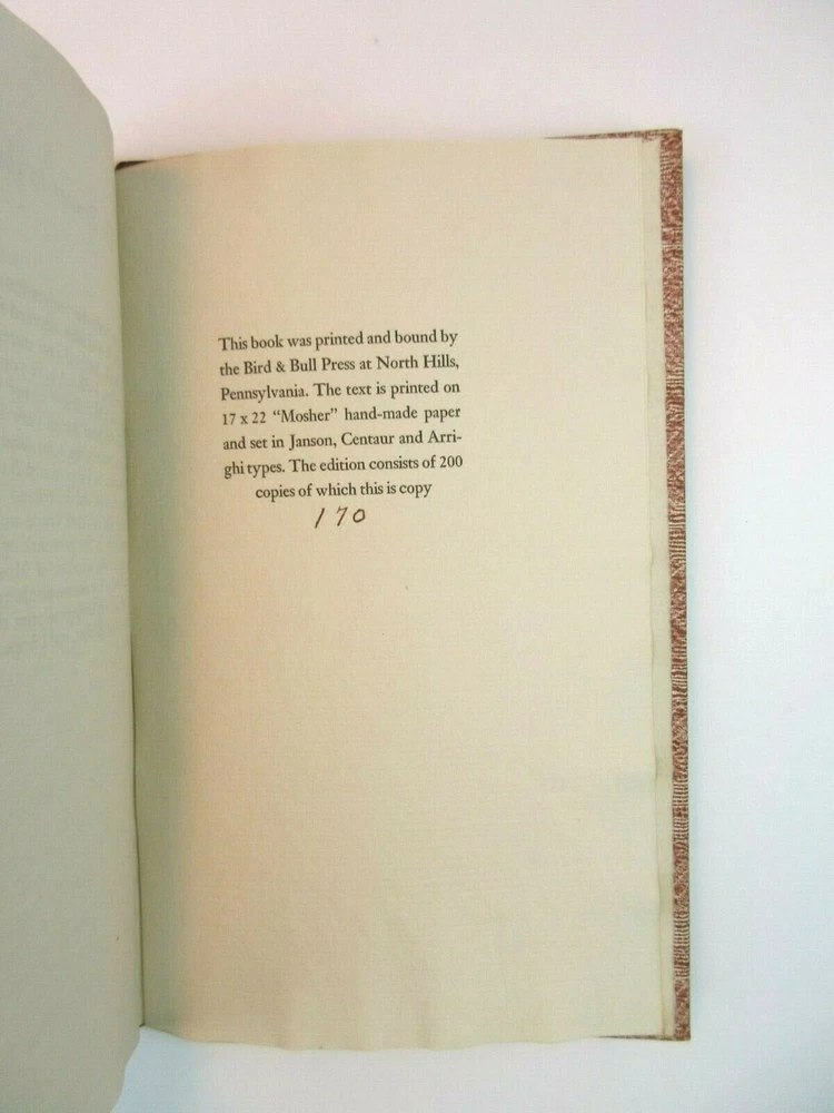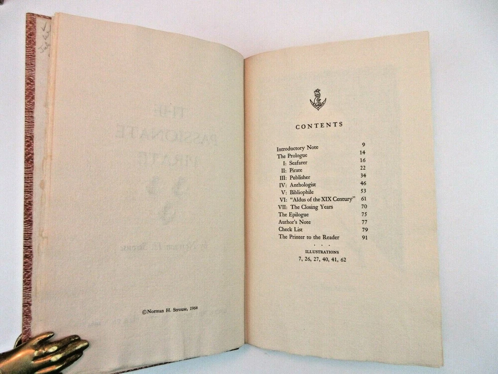 The Passionate Pirate by Norman H. Strouse. North Hills, PA: Bird & Bull Press, 1964. 91 pages. No. 170 of an edition limited to 200 copies. INSCRIBED by Strouse to Bill Targ, editor-in-chief of G.P. Putnams Sons and fellow bibliophile and small press aficionado . About the life and work of publisher Thomas Bird Mosher.