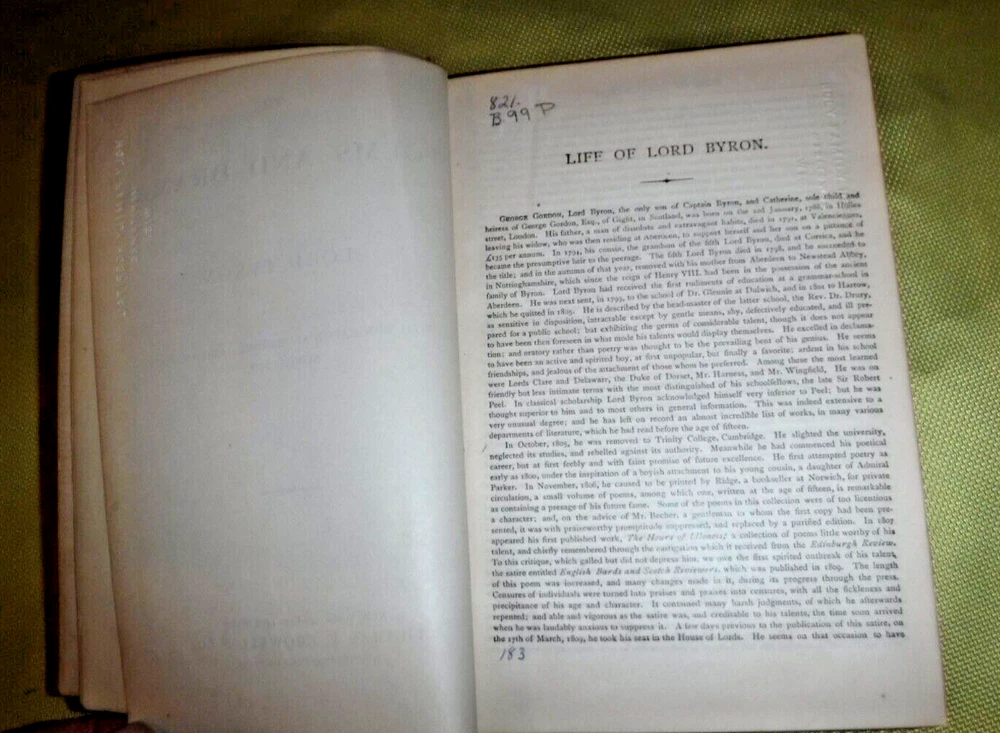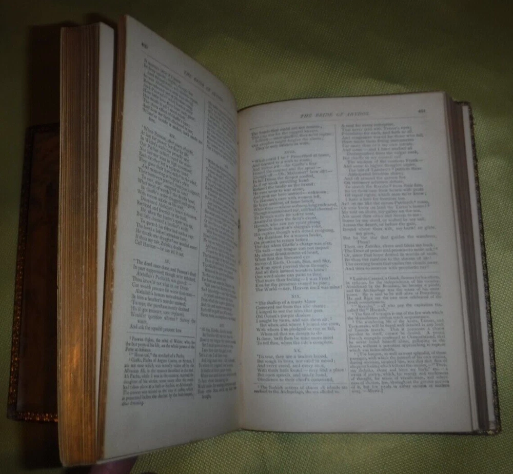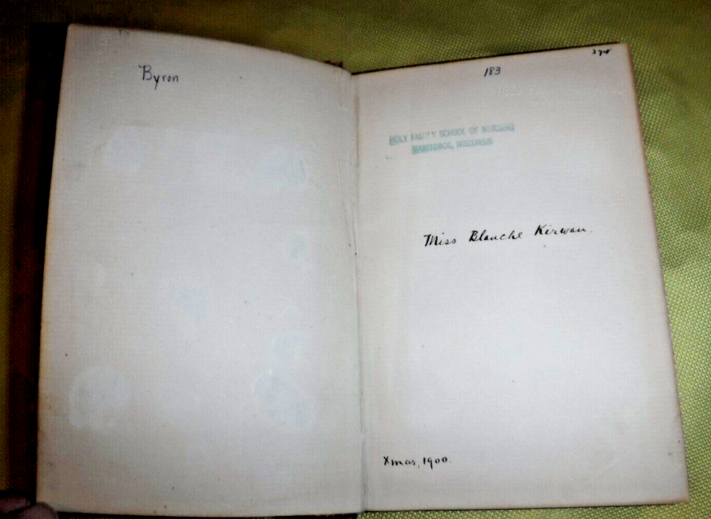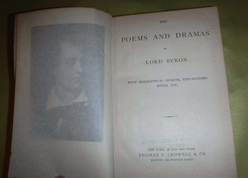 The Poems and Dramas of Lord Byron. With Biographical Memoir, Explanatory Notes, etc. Lord Byron Published by Thomas Y. Crowell & Co., New York - LEATHER NO DATE IN BOOK BOOK SIZE 7 5/8 X 5 1/4-- CONDITION GOOD EX-LIBRARY BOOK SIGNED BY PREVIOUS OWNER MISS BLAUCHE KIRWAN XMAS 1900 - GOLD GILT PAPER EDGES - 855 PAGES - BEAUTIFUL VINTAGE BOOK