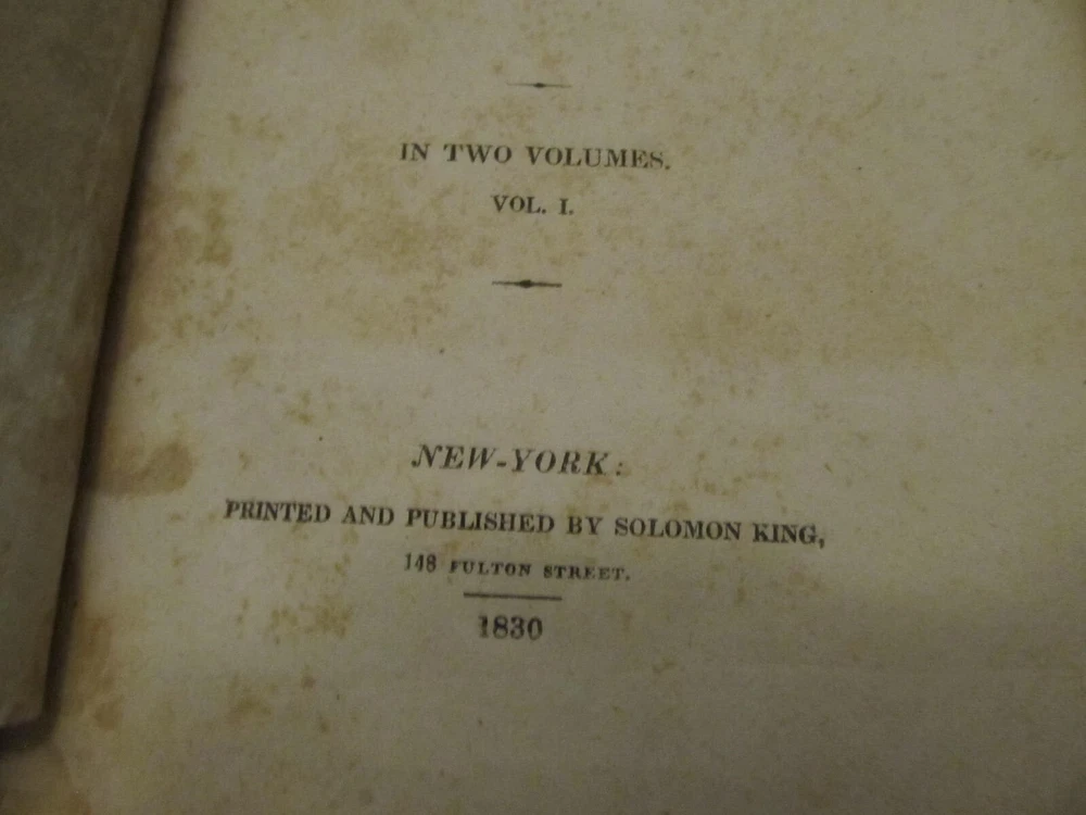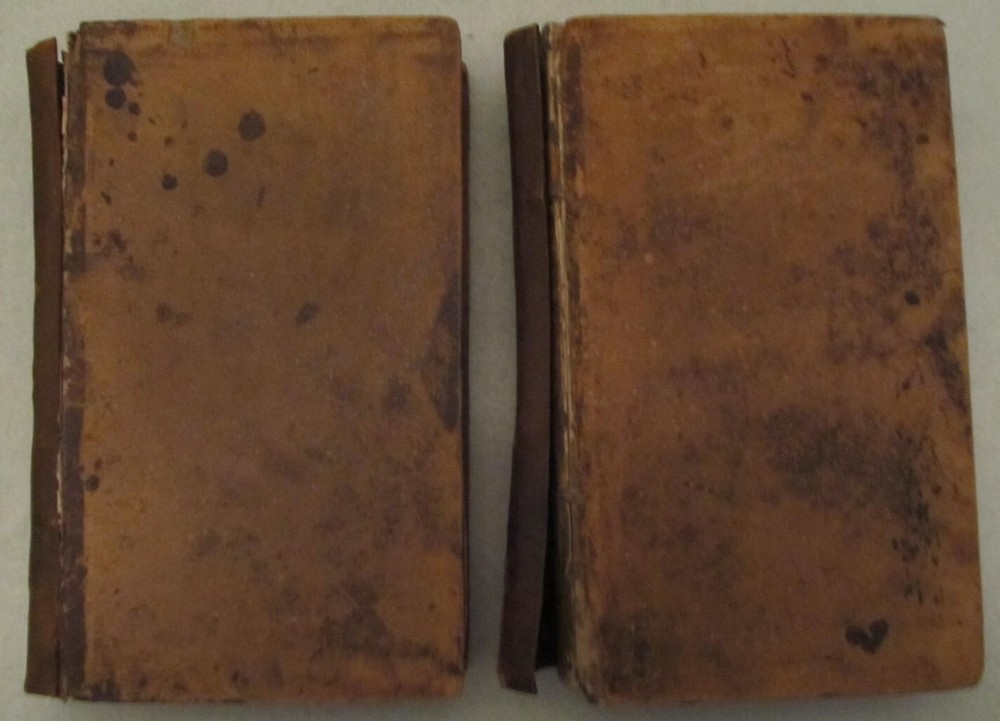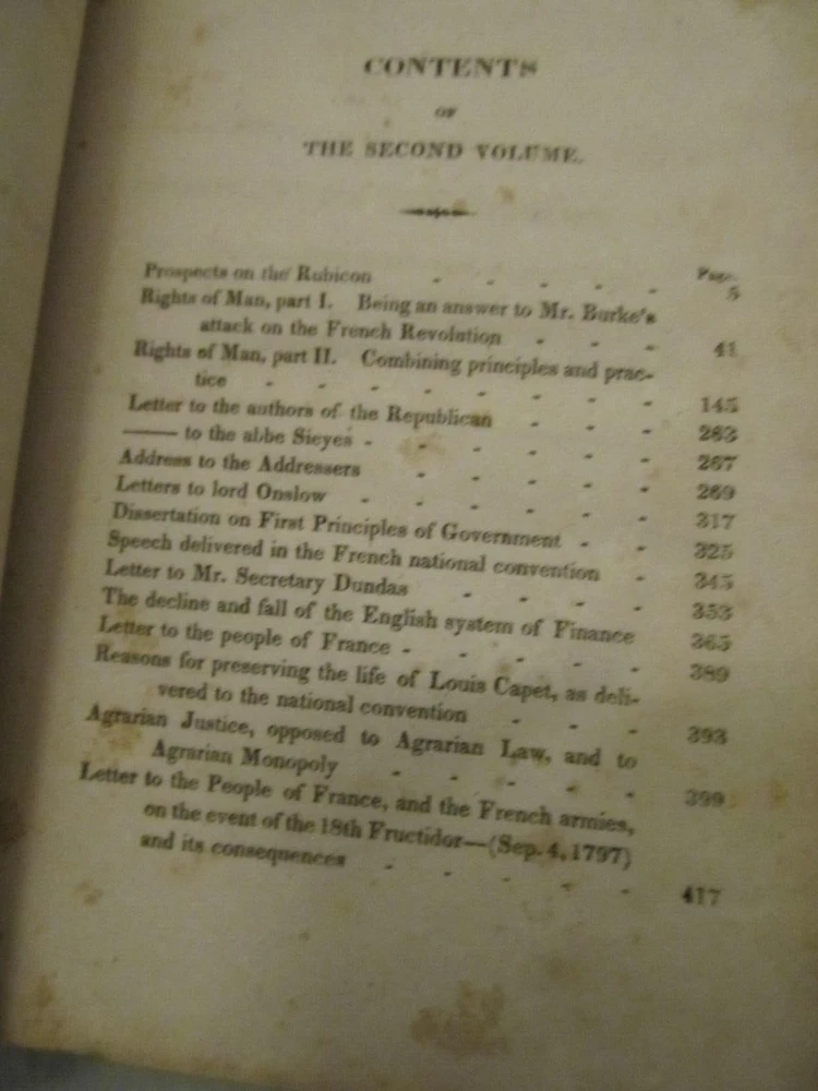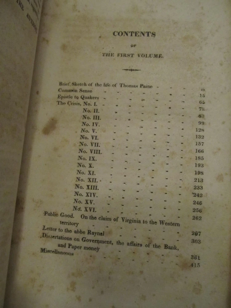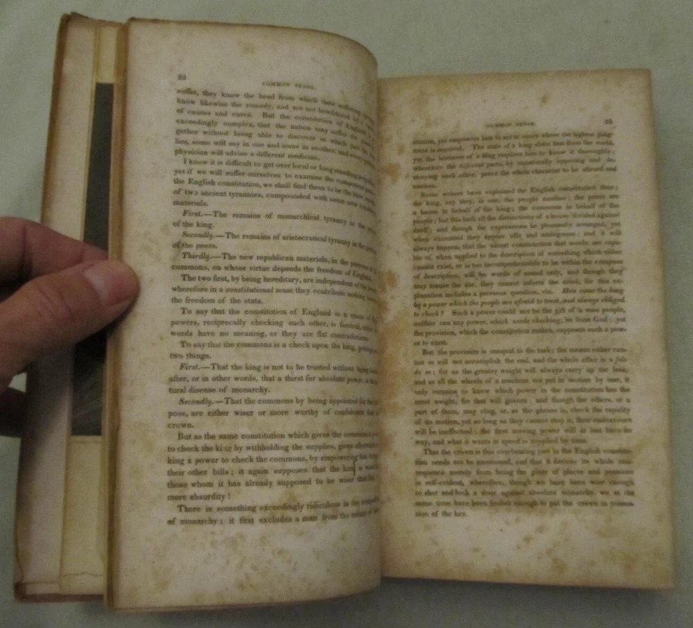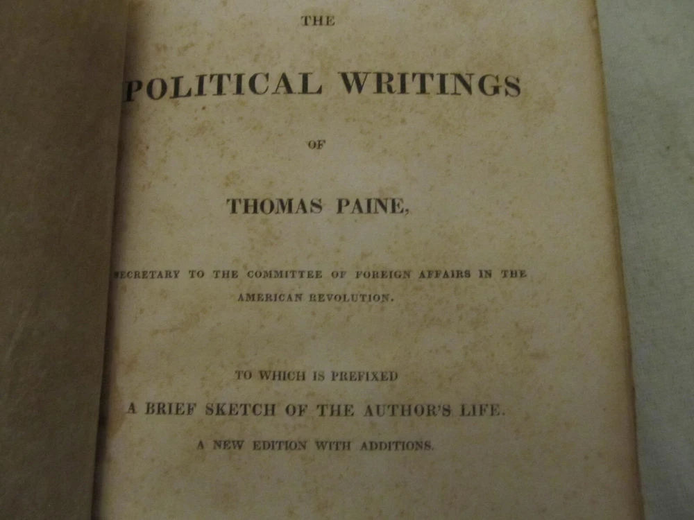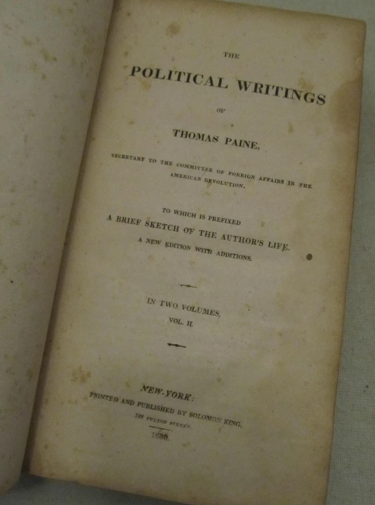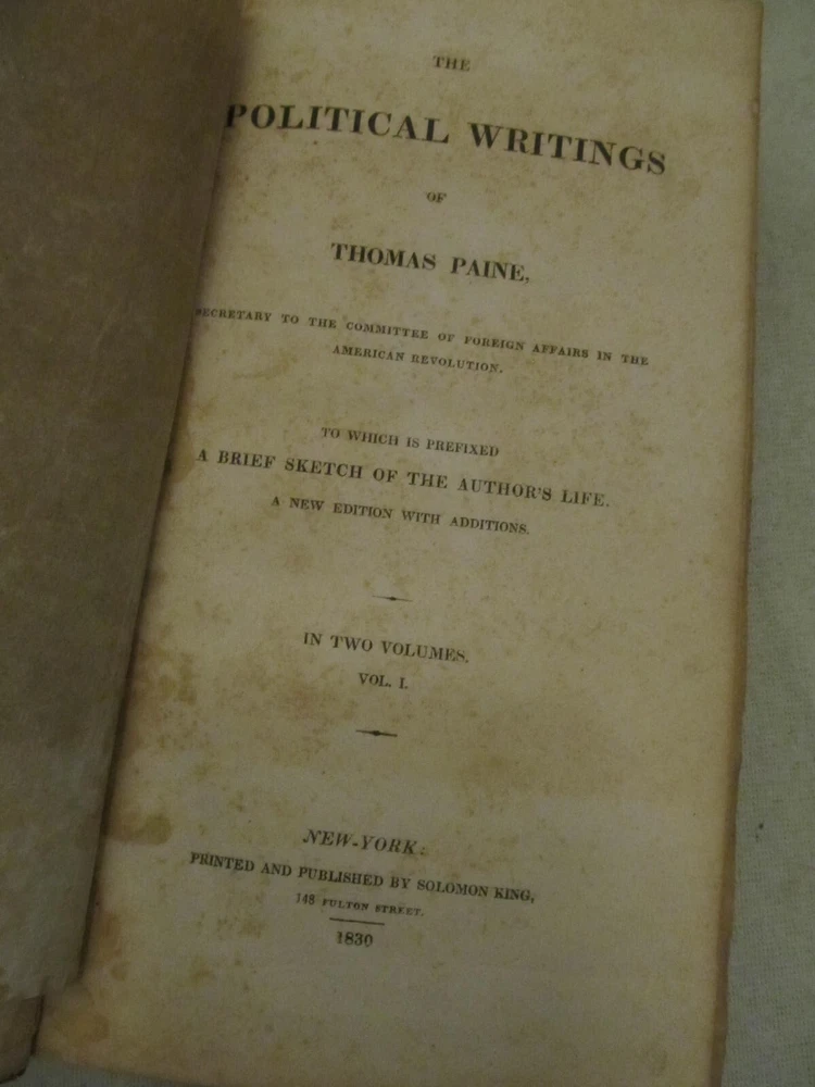 "The Political Works of Thomas Paine" 2 Volume Set Published in 1830 by Solomon King (New York) "To which is prefixed a brief sketch of the author's life." "A New Edition with Additions" (This is not the first edition of this collection) Approx. 6" x 9" Vol. 1 is 432 pages Vol. 2 is 436 pages Condition is FAIR: The leather spine wraps are working loose The front cover on Vol. 1 is nearly detached The front cover on Vol. 2 is very loose The front free end paper is torn out of Vol. 2 Heavy moisture spots (foxing) throughout Significant water stains on last 20 pages of Vol. 2