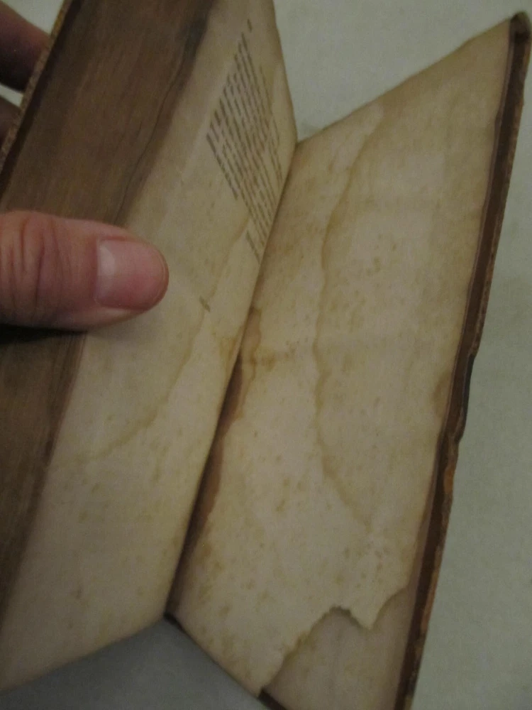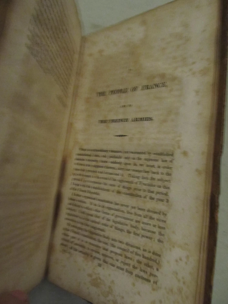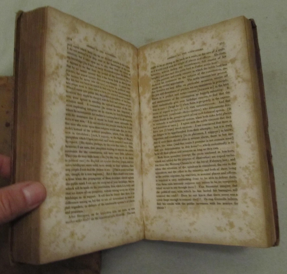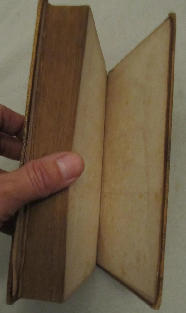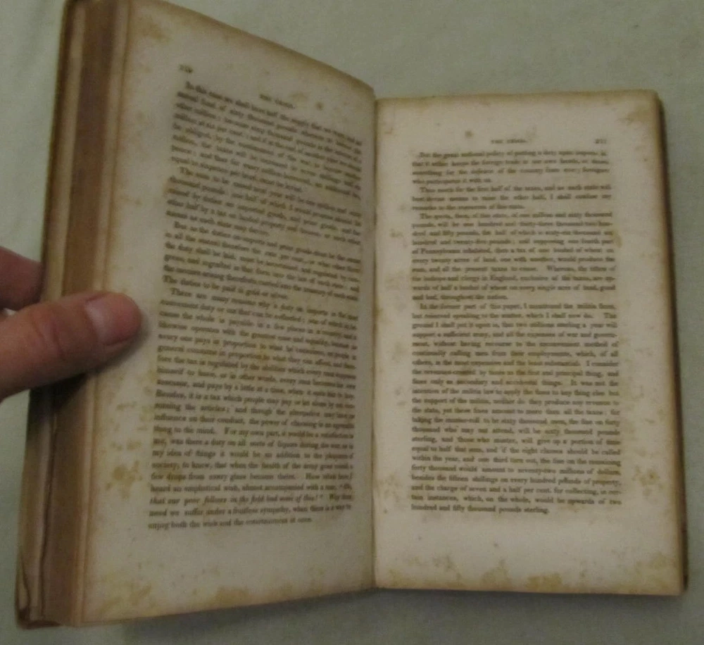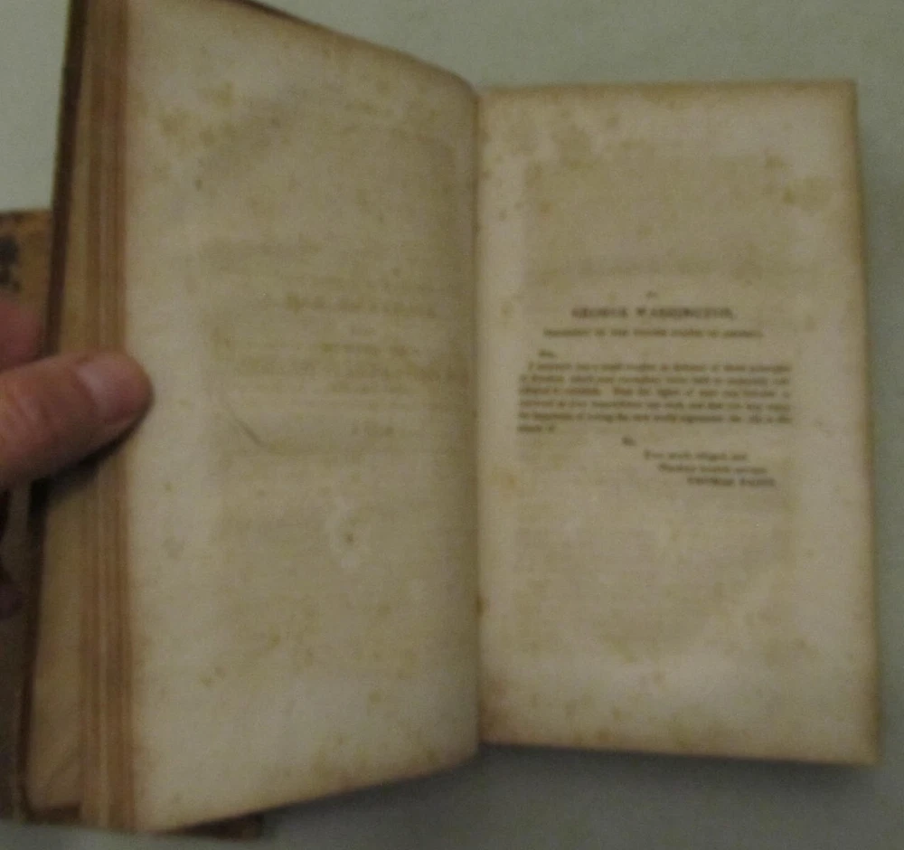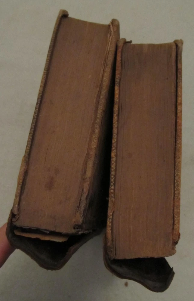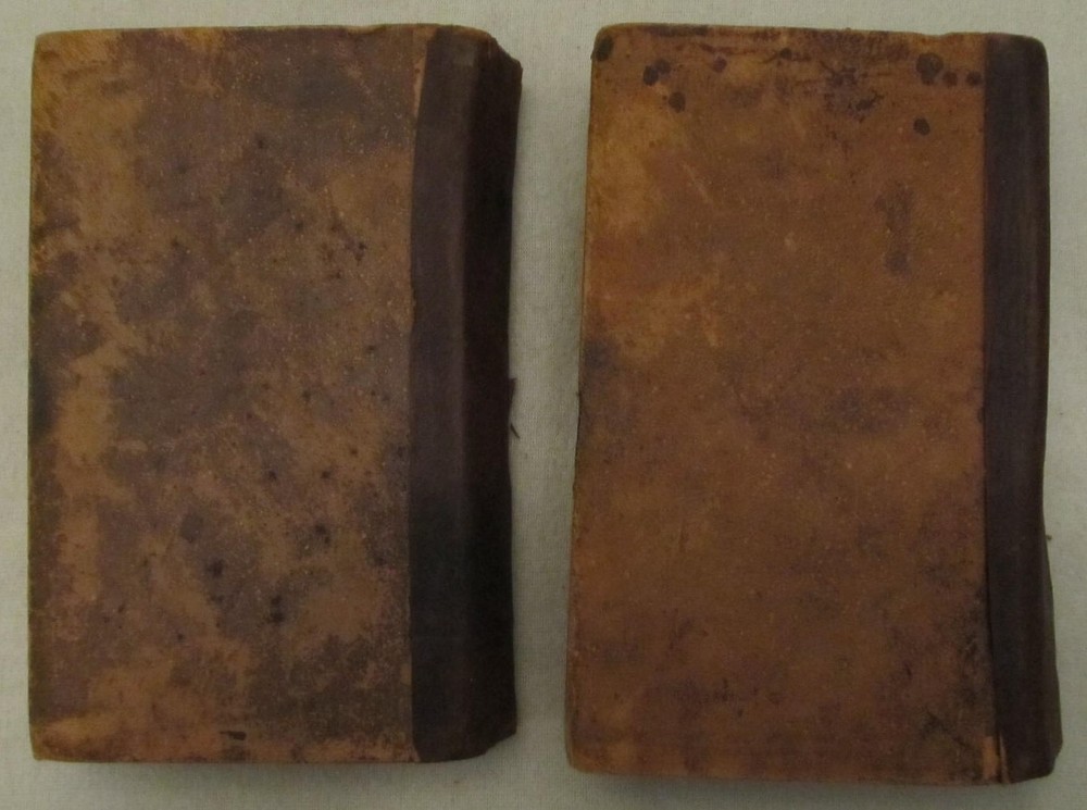 "The Political Works of Thomas Paine" 2 Volume Set Published in 1830 by Solomon King (New York) "To which is prefixed a brief sketch of the author's life." "A New Edition with Additions" (This is not the first edition of this collection) Approx. 6" x 9" Vol. 1 is 432 pages Vol. 2 is 436 pages Condition is FAIR: The leather spine wraps are working loose The front cover on Vol. 1 is nearly detached The front cover on Vol. 2 is very loose The front free end paper is torn out of Vol. 2 Heavy moisture spots (foxing) throughout Significant water stains on last 20 pages of Vol. 2