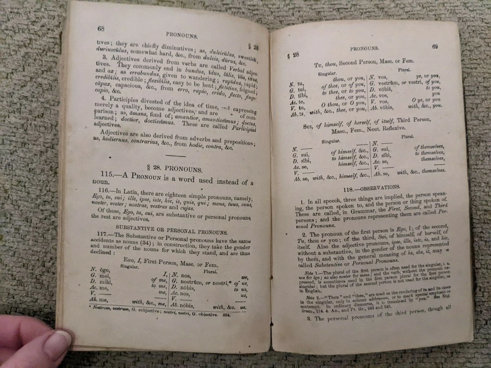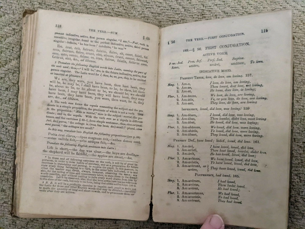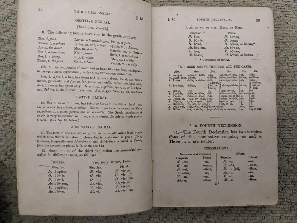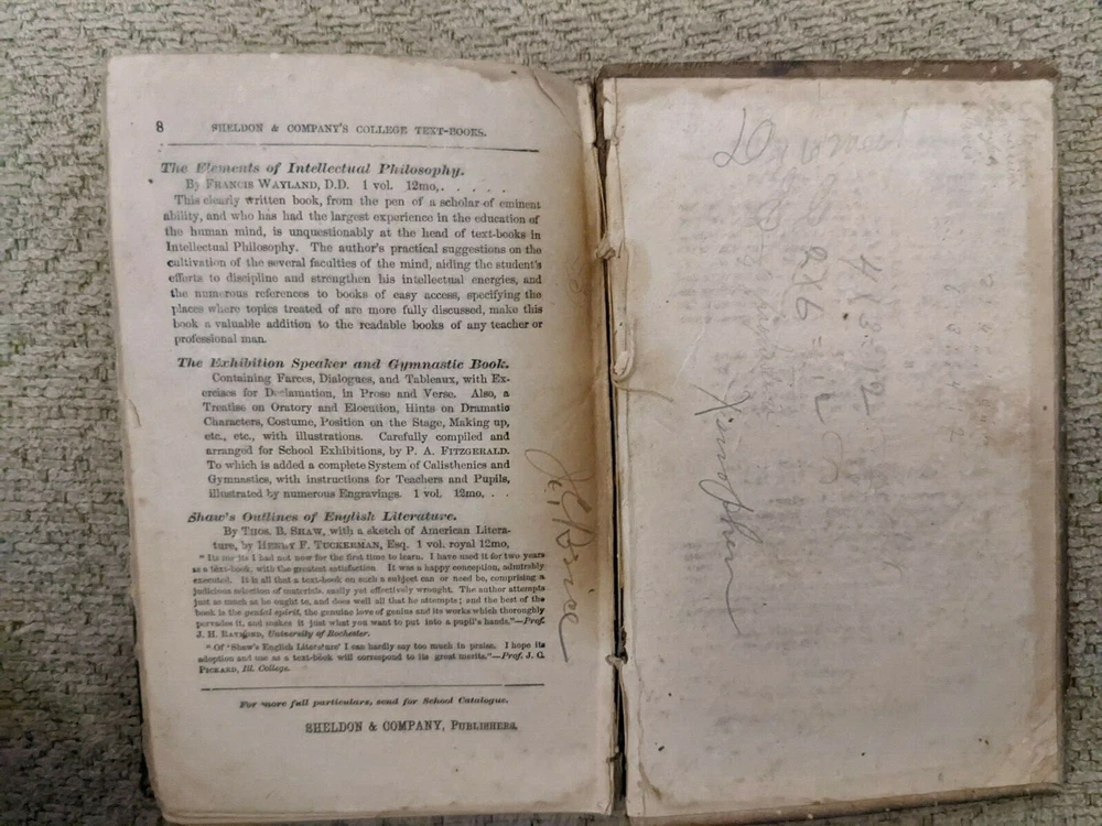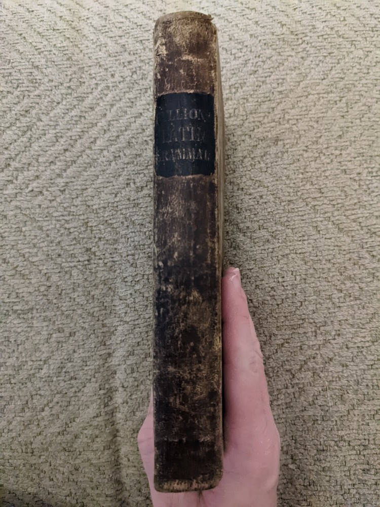 The Principles of Latin Grammar An Appendix for the Use of Schools and Colleges by Rev. Peter Bullions, D.D. 1880 This is an antique, leatherbound book. It has some writing inside the front few pages (some in beautiful script), and sprinkled throughout. The leather is scuffed and worn. There might be a few pages missing at the end, but I'm not sure. The rest are holding on. Neat book and piece of history. Please check out the photos. Sold as is, no returns. Thanks for your interest.