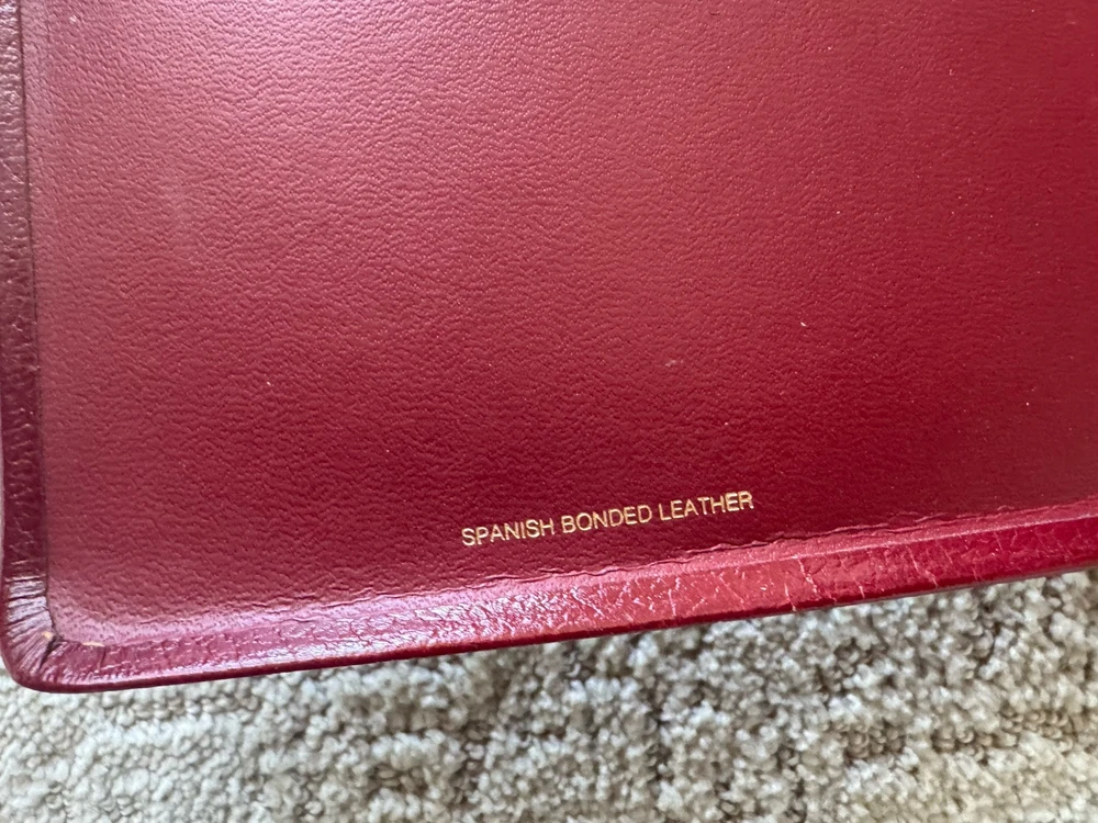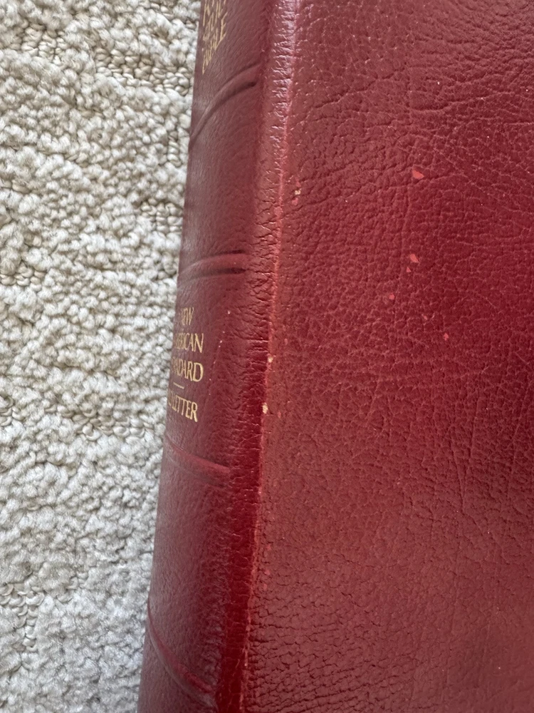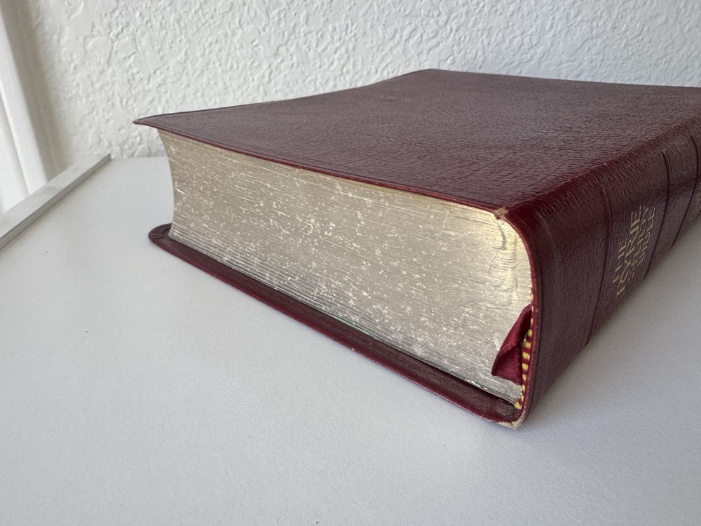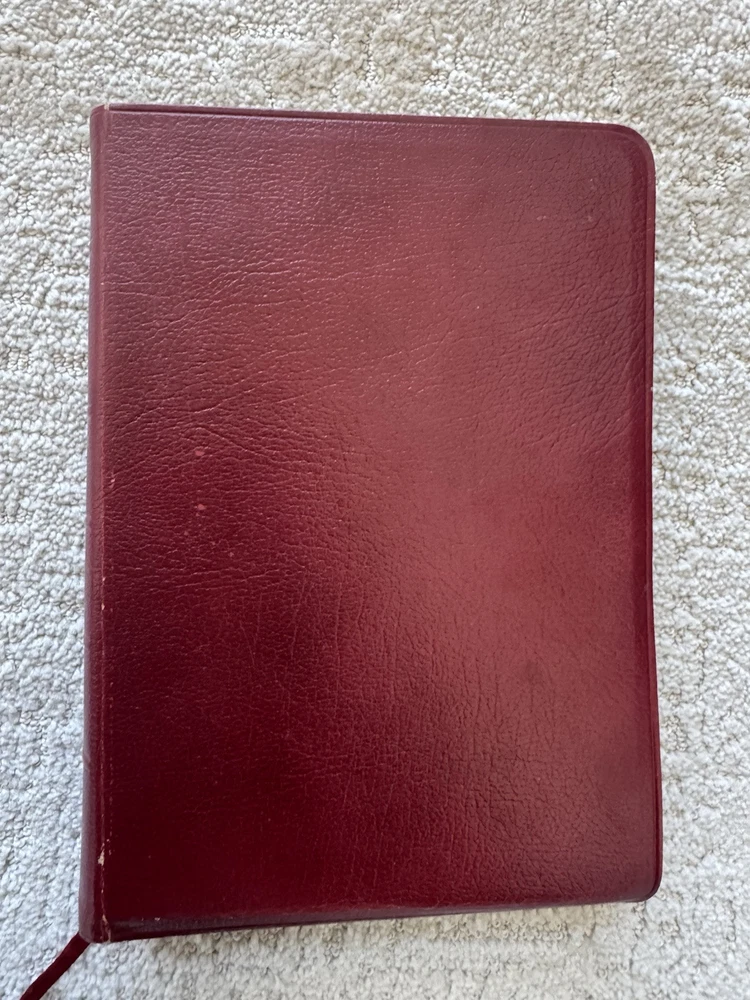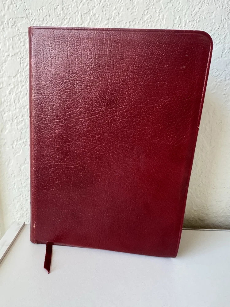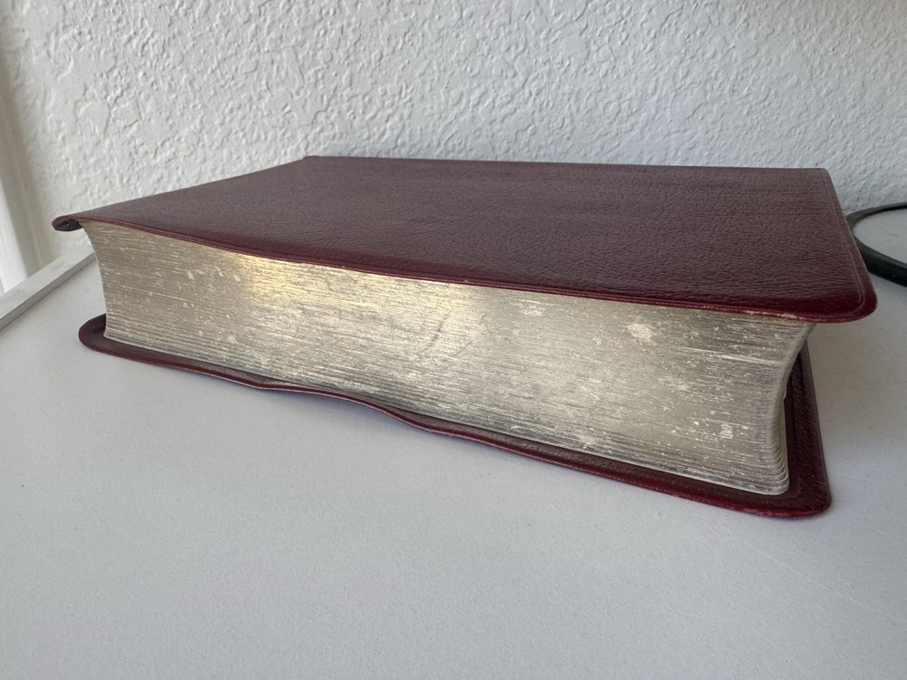 Has some pen notes in margins and some ink underlining as shown in photos This is very minimal on a page if so. I would guess maybe there are 20 or so pages with these markings inside, just by flipping through. Leather binding has some scuff marks see photos for this please No highlights No odors Ships in box with bubble wrap BIBLBX