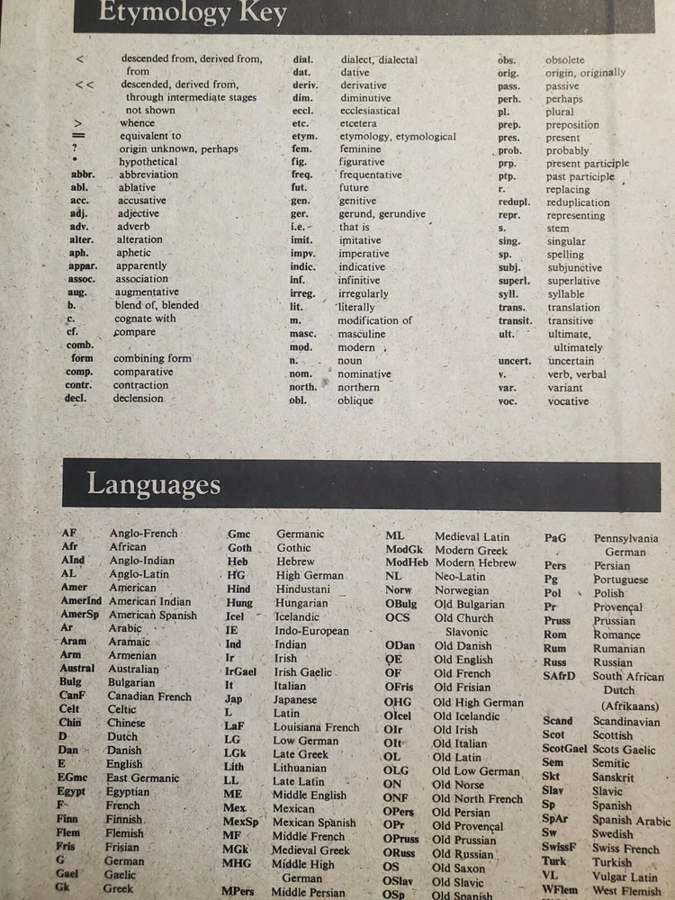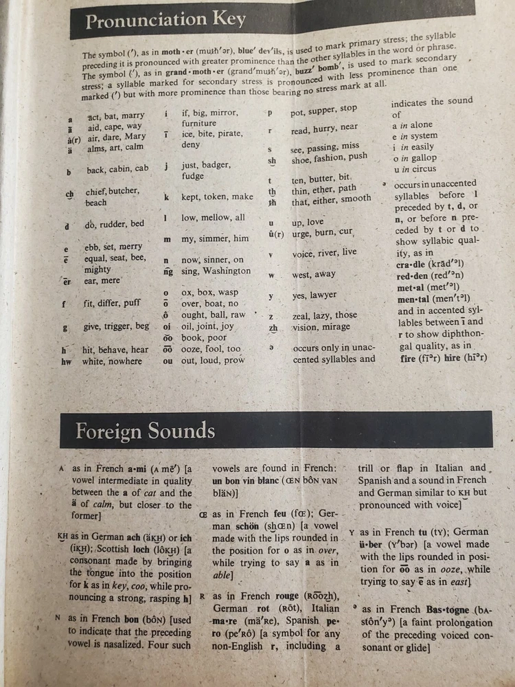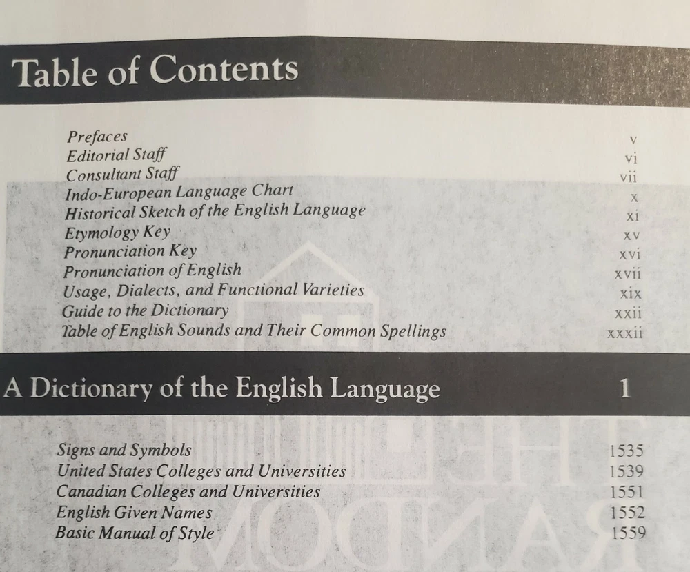 Table of Contents: Prefaces Editorial Staff Consultant Staff Indo-European Language Chart Historical Sketch of the English Language Etymology Key Pronunciation Key Pronunciation of English Usage, Dialects, and Functional Varieties Guide to the Dictionary Table of English Sounds and Their Common Spellings Signs and Symbols United States Colleges and Universities Canadian Colleges and Universities English Given Names Basic Manual of Style