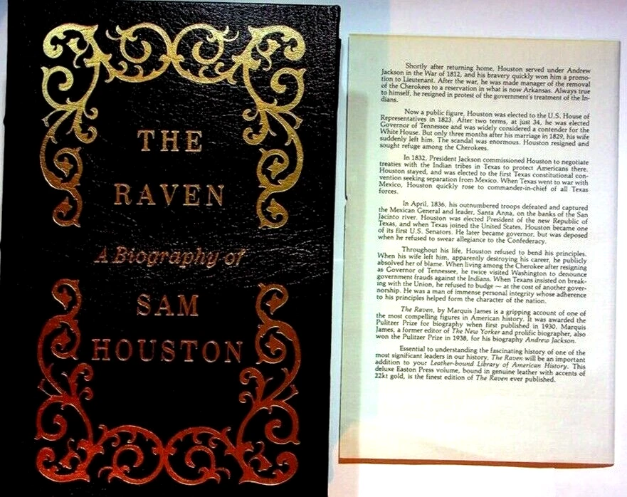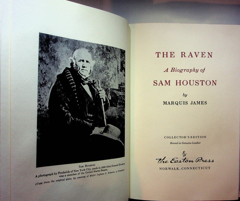 The Raven; A Biography of Sam Houston ( Easton Press Genuine Leather, Like New) by Marquis James Originally written in 1929, The Raven is the colorful story of Sam Houston (nicknamed the Raven) governor of two states, president of the Republic of Texas, U.S. senator, military hero, and one of the most controversial figures of 19th-century America.