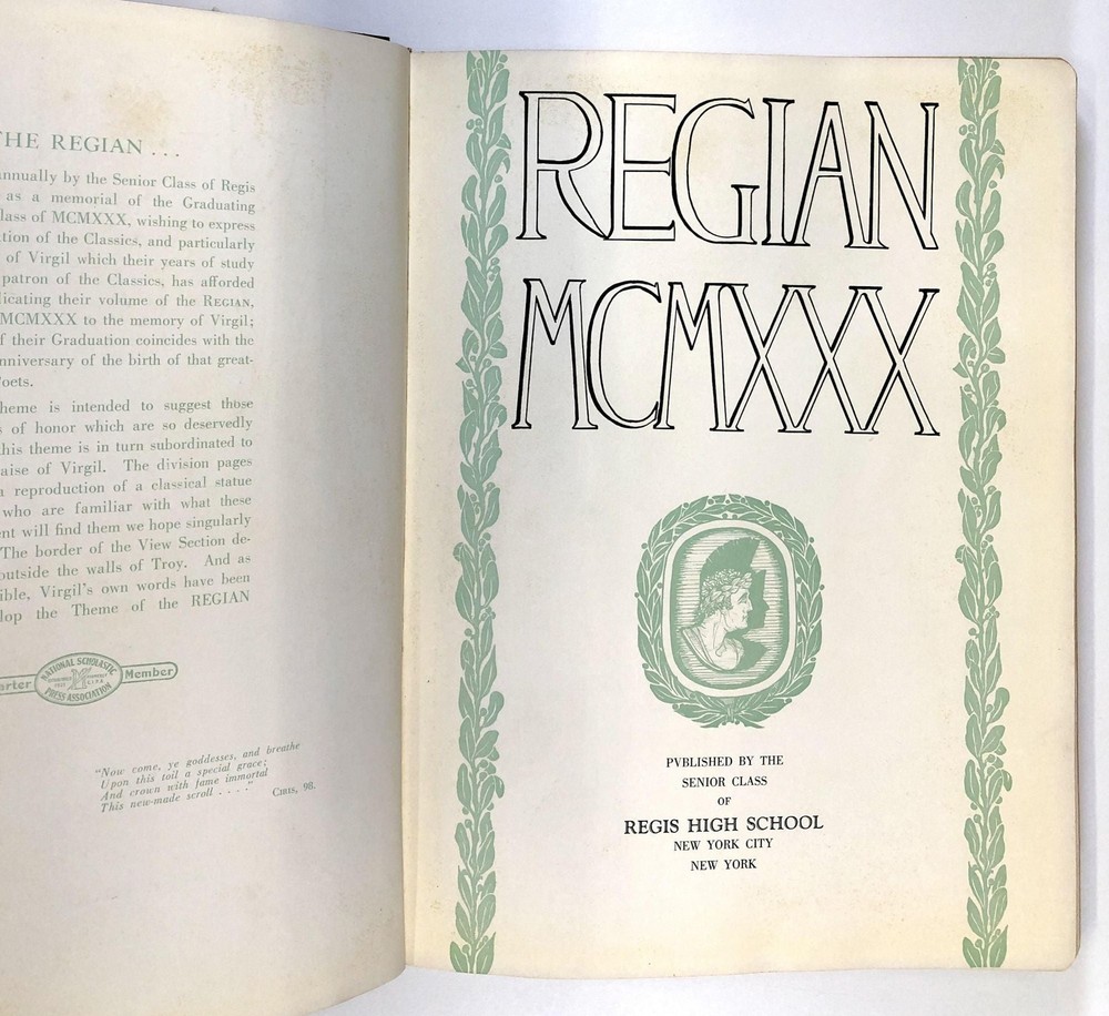 The Regian MCMXXX [Regis High School Yearbook, 1930] Author: Regis High School Title: The Regian MCMXXX [Regis High School Yearbook, 1930] Publication: New York: Regis High School, 1930 Description: Leather bound. 1930 yearbook from Regis High School in New York City. Quarto, leather wraps, unpaginated, illustrated in b&w. Book is very good plus with general shelfwear and rubbing to leather, all pages intact, binding tight. Ephemera from Regis High School and subsequent reunions laid in. Rare! Very Good +. Seller ID: s00037454 Subject: Yearbooks RAREBOOKSTORE RareBookStore is a long-established eBay seller specializing in used and rare books in all fields—plus prints, ephemera, maps, music, photography, and the occasional painting. We sell good books at good prices and want you to be satisfied with your purchase. Be sure to add us to your “favorite” sellers and check back to see new items listed daily! We pride ourselves on our high standards, high eBay ratings, and helpful staff, so please contact us directly if you encounter any issues. Standard shipping is via USPS Media Mail. Expedited options are available at checkout. Payment is expected within 2 business days unless otherwise arranged. Our warehouse is staffed Monday-Friday and we respond to inquiries as quickly as possible. We hope you enjoy browsing our selection of great books. Happy reading! This listing was created by Bibliopolis.