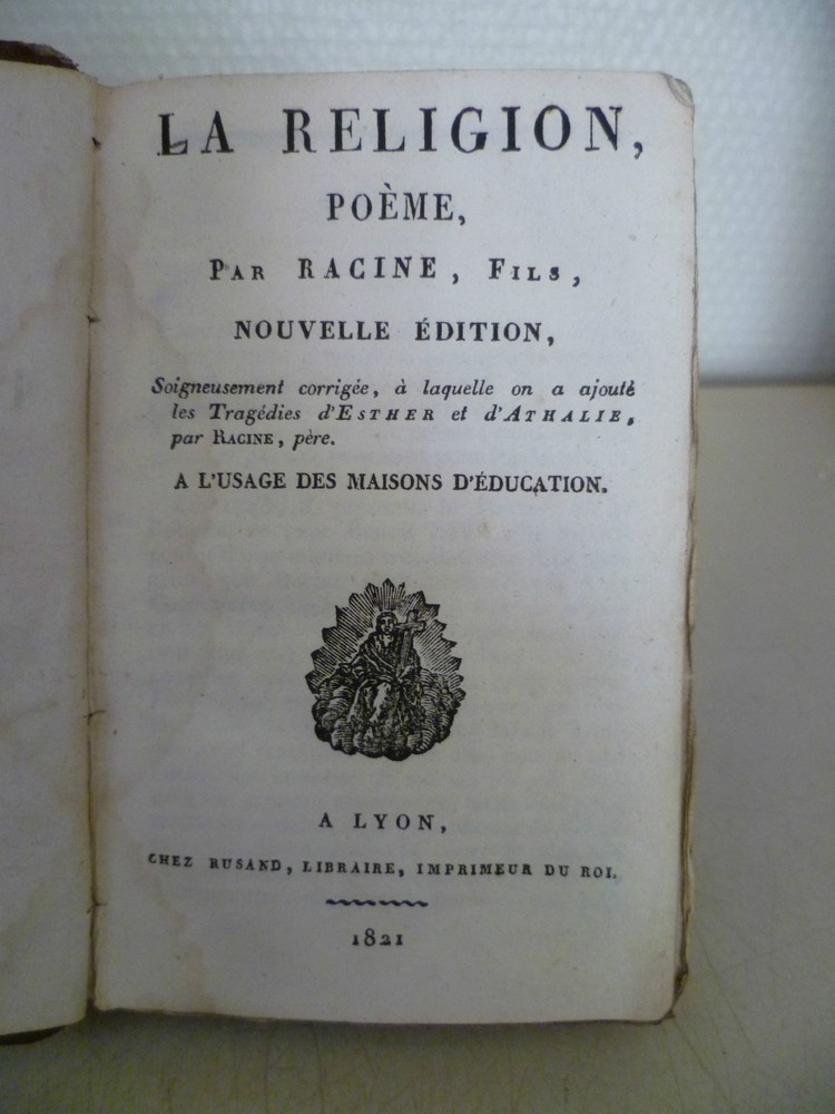 The poem religion by Racine, son For the use of education houses Carefully corrected, to which we added the tragedies of Esther of Athalie by Racine, father. 1821 Rusand bookseller King's printer Correct condition Very damaged coverage Format 8.5 x 13 316 pages The poem religion by Racine, son For the use of education houses Carefully corrected, to which we added the tragedies of Esther of Athalie by Racine, father. 1821 Rusand bookseller King's printer Correct condition Very damaged coverage Format 8.5 x 13 316 pages