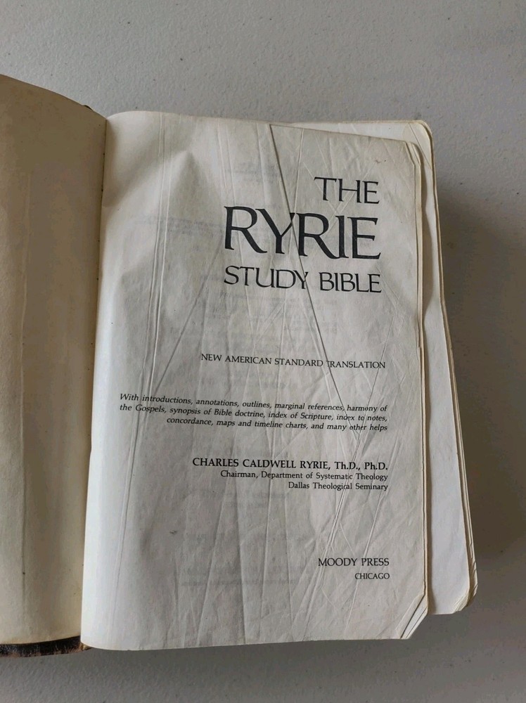 The Ryrie Study Bible 1978 Moody Press New American Standard Has some flaws please refer to pictures I tried to ship earlier but cannot always guarantee that please allow the allotted handling time for item to be shipped out.