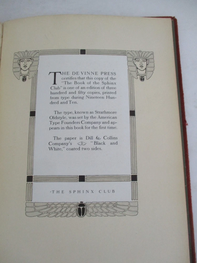 The Sphinx Club was founded in 1896 for the benefit of advertising men. I later became known as the Advertising Club of New York. Book measures 9 3/4 x 6 1/2 inches with flexible suede covers, all page edges gilt, lists of officers, constitution, resident and non-resident members, many b&w photos of members. Rare, Thank you.