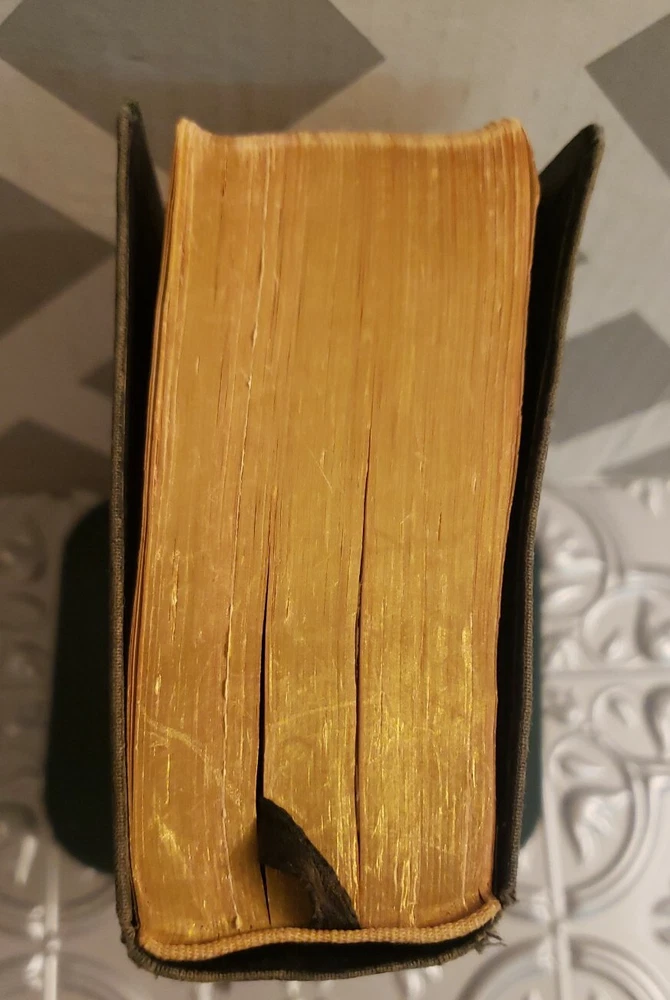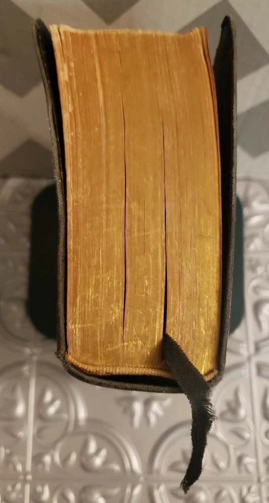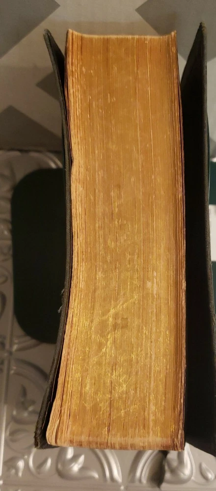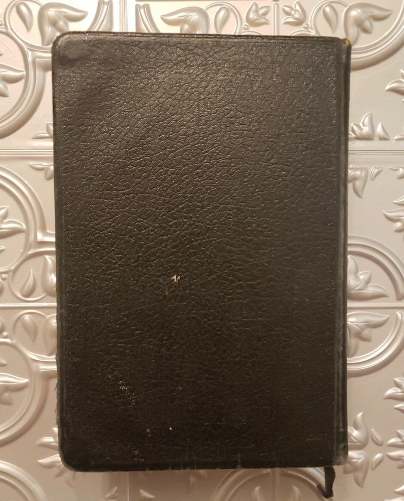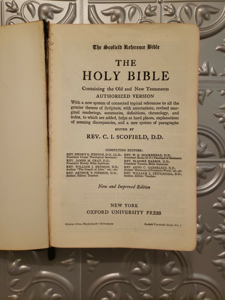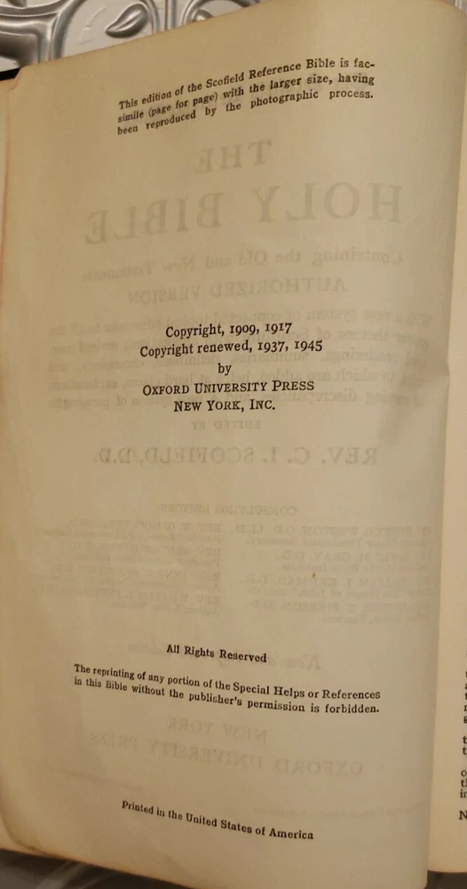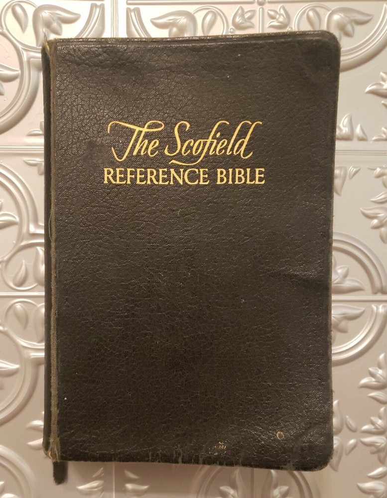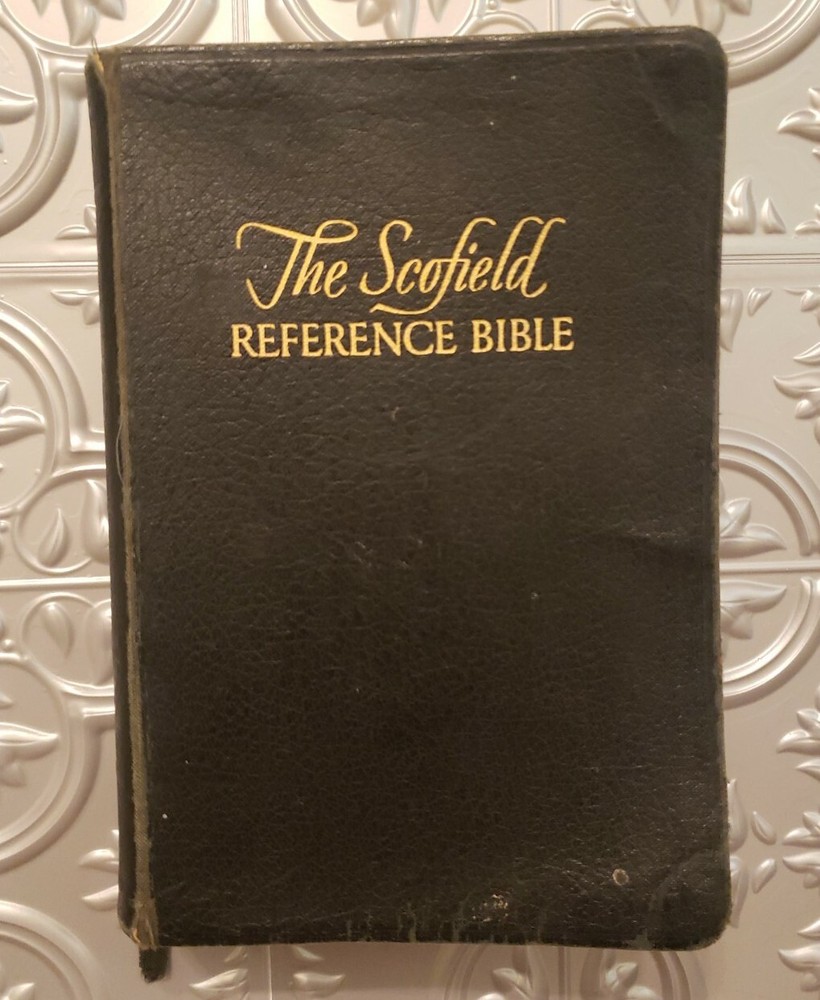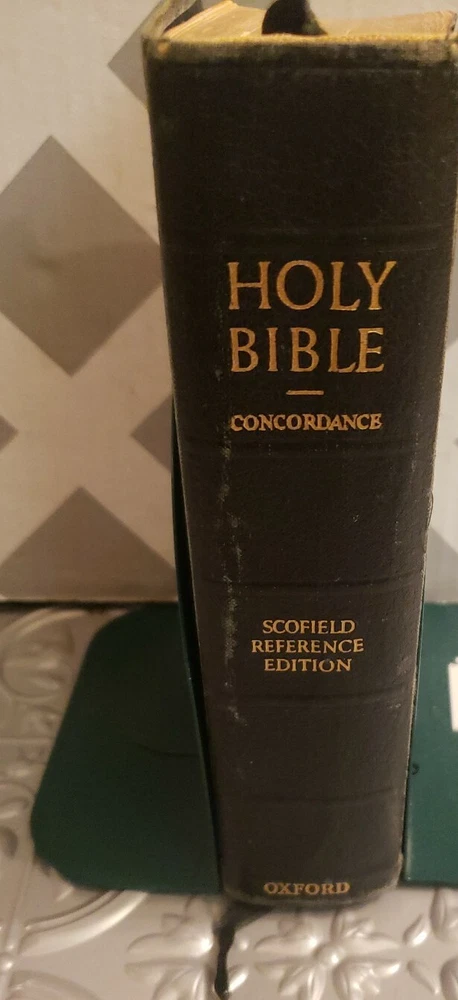 The Scofield Reference Edition 1945 Bible. Oxford University Press Holy Bible. Leather covers. Sewn Binding. The Bible is in good overall vintage condition for being 75 years old. The cover has normal wear and tear and some marks/spots. The binding appears a little loose but the pages are all intact. There is a persons name/address written on the inside cover but it is not very visible. I do not see any other writing in this Bible nor do I see any torn pages. There are some pages with the corners folded..The Bible measures about 7" x 5" x 1 3/4" thick. Please see photos as they are part of the description.