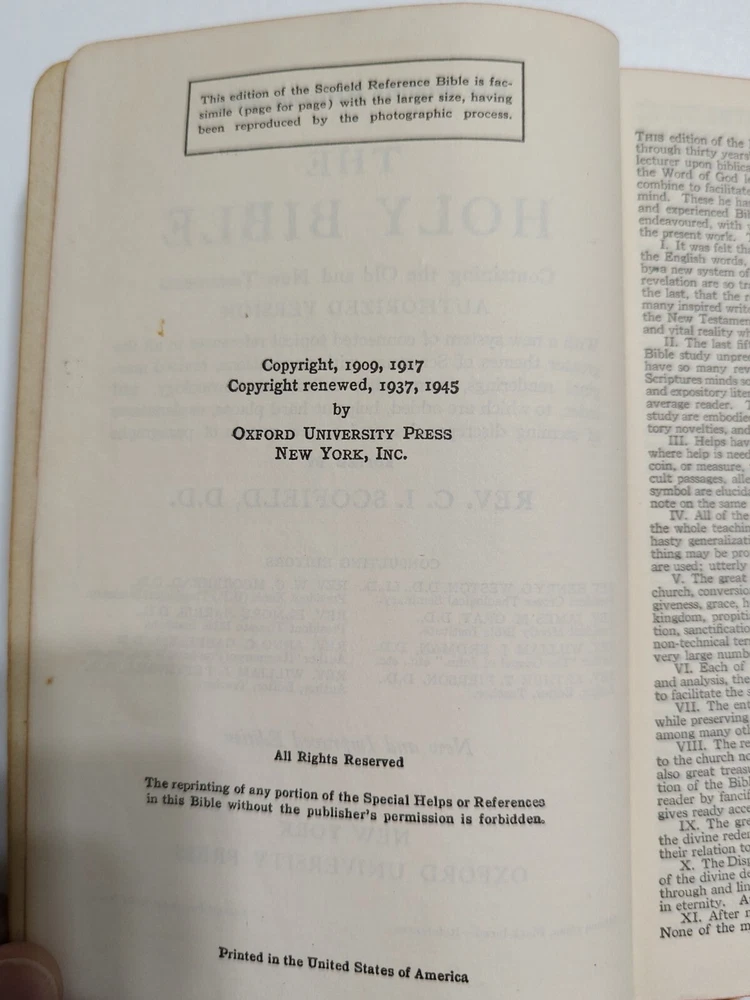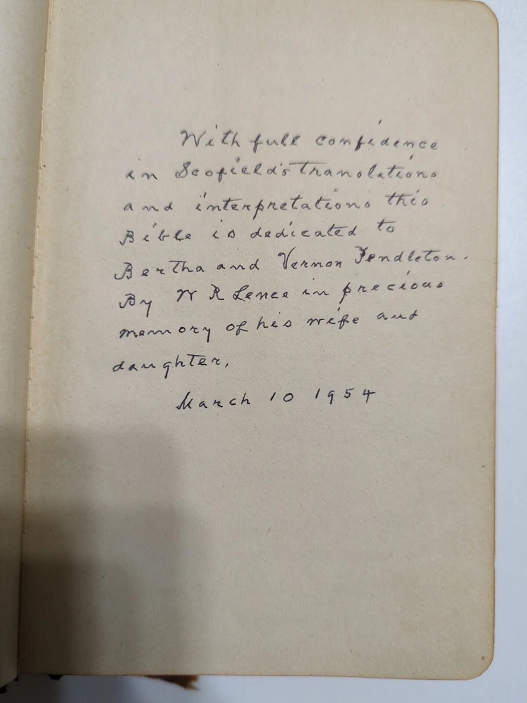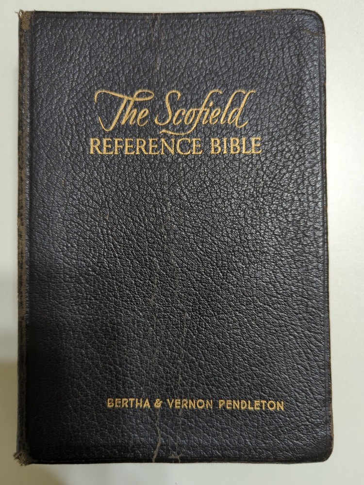 The Scofield Reference Bible Holy Bible Concordance Rev. C.I.SCOFIELD,D.D.T 1945. Condition is fair to good. Pictures show all the hand writing I found when thumbing through the pages. The Bible has been well used and does have wear and worn areas. See pictures for condition.