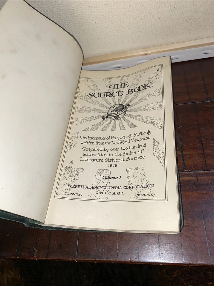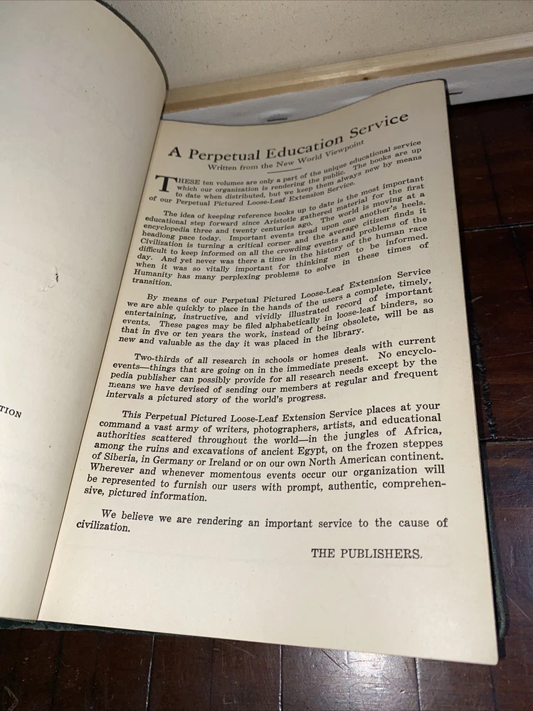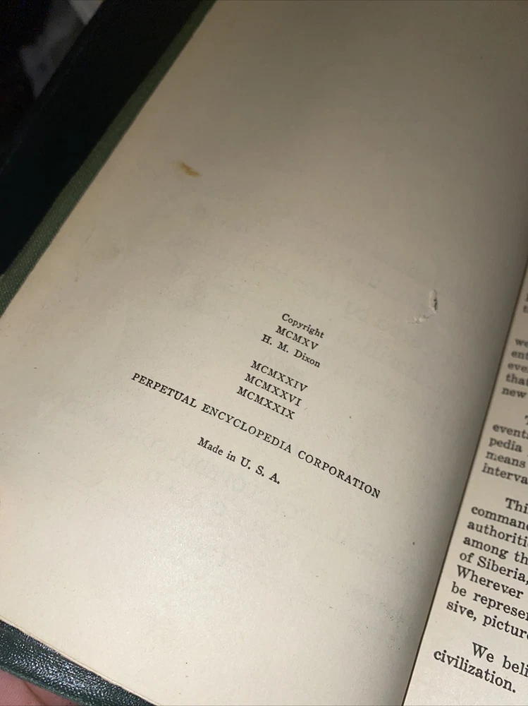 Has a curve/warp from storage Discover a timeless piece of history with this vintage hardcover encyclopedia. Published in 1924 by Perpetual Encyclopedia, this book is an original and authentic source of knowledge on a wide range of topics. The embossed leather cover and illustrated pages add a touch of antique charm to any collection. With contributions from various authors, this encyclopedia covers subjects in North America and beyond. The intricate details on the cover and special attributes of this book, such as its vintage hardcover and illustrations, make it a valuable addition to any bookshelf. This antique embossed leather book is a must-have for collectors and enthusiasts alike.