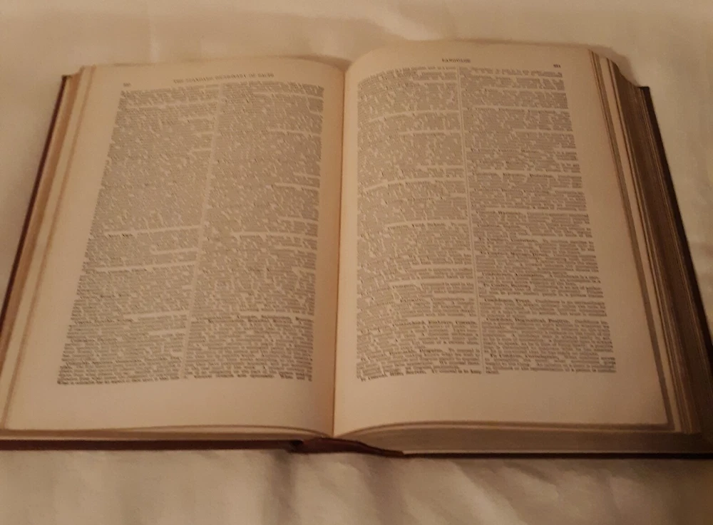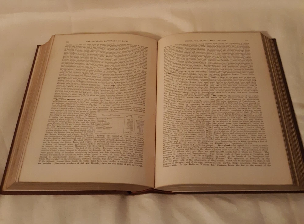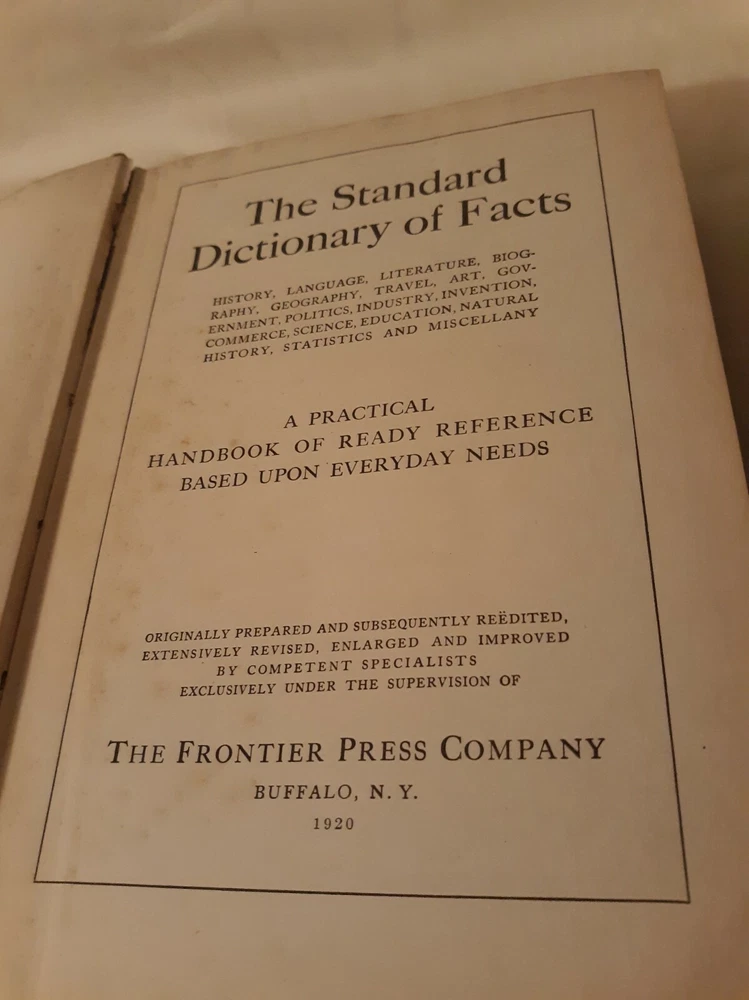 This 1920 Standard Dictionary of Facts is in Good Condition overall. Other than the title page (see last pic) which shows some yellowing age spots and has a page break near binder, the rest of the book is in Very Good condition with crisp and clean pages. This 100 year old book is beefy weighing 4.2 Pounds. The book is 10" tall x 7" wide x 2.25" thick. Free shipping in US.