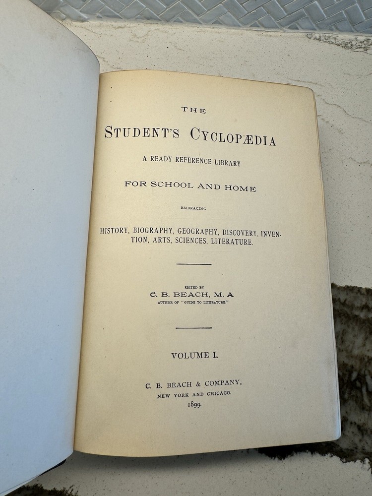 This vintage copy of The Student's Cyclopedia Volume 1 from the 1899 edition is a treasure trove of reference information for any reader. The leather bound book, published by C.B. Beach & Co. in New York, contains a wealth of knowledge on various topics, making it a great addition to any collection. The book is in its original form and has not been modified, making it a rare find for collectors. It features illustrations and is written in English. The unit type is a unit and the region is North America. This book is perfect for anyone interested in encyclopedias and reference materials.