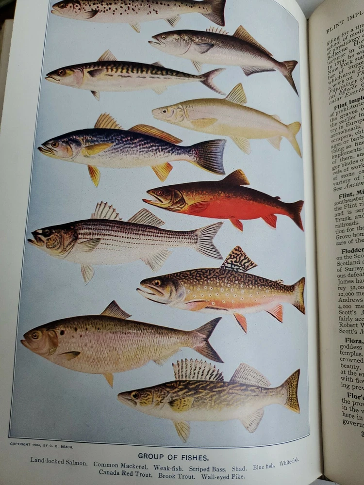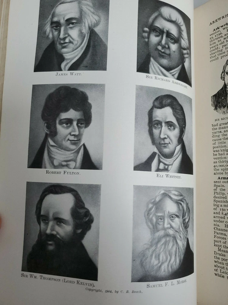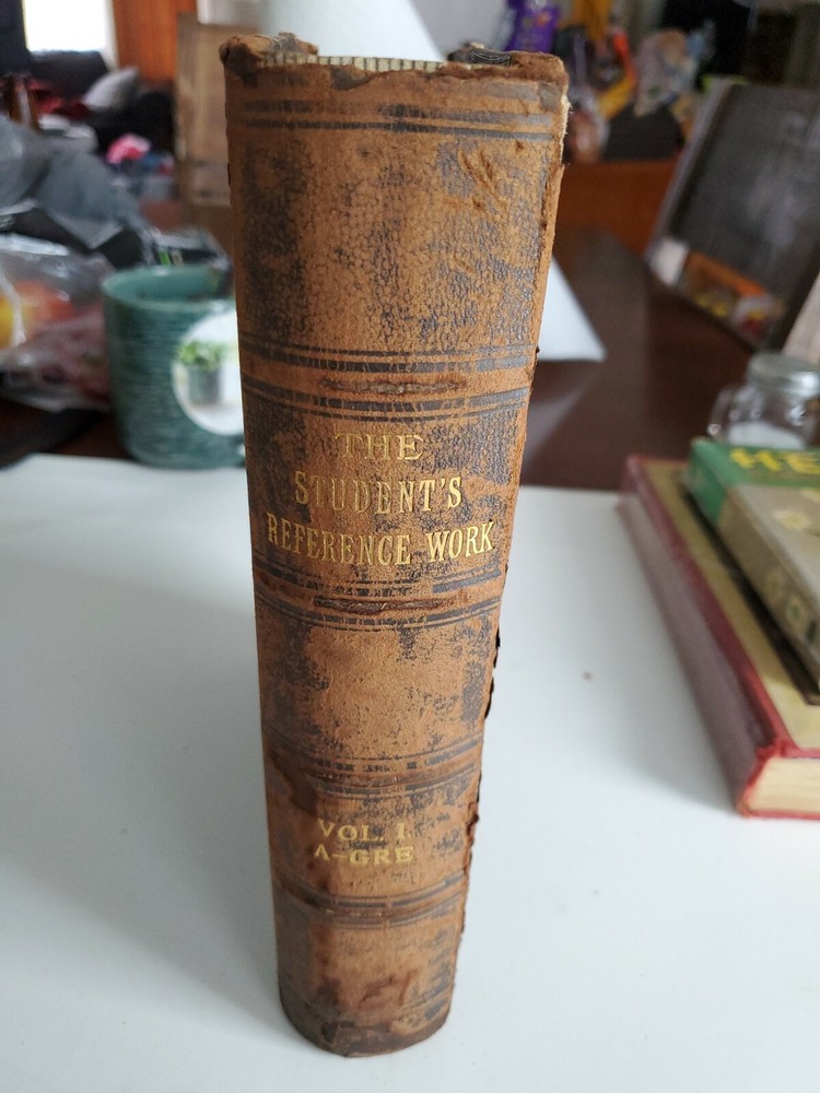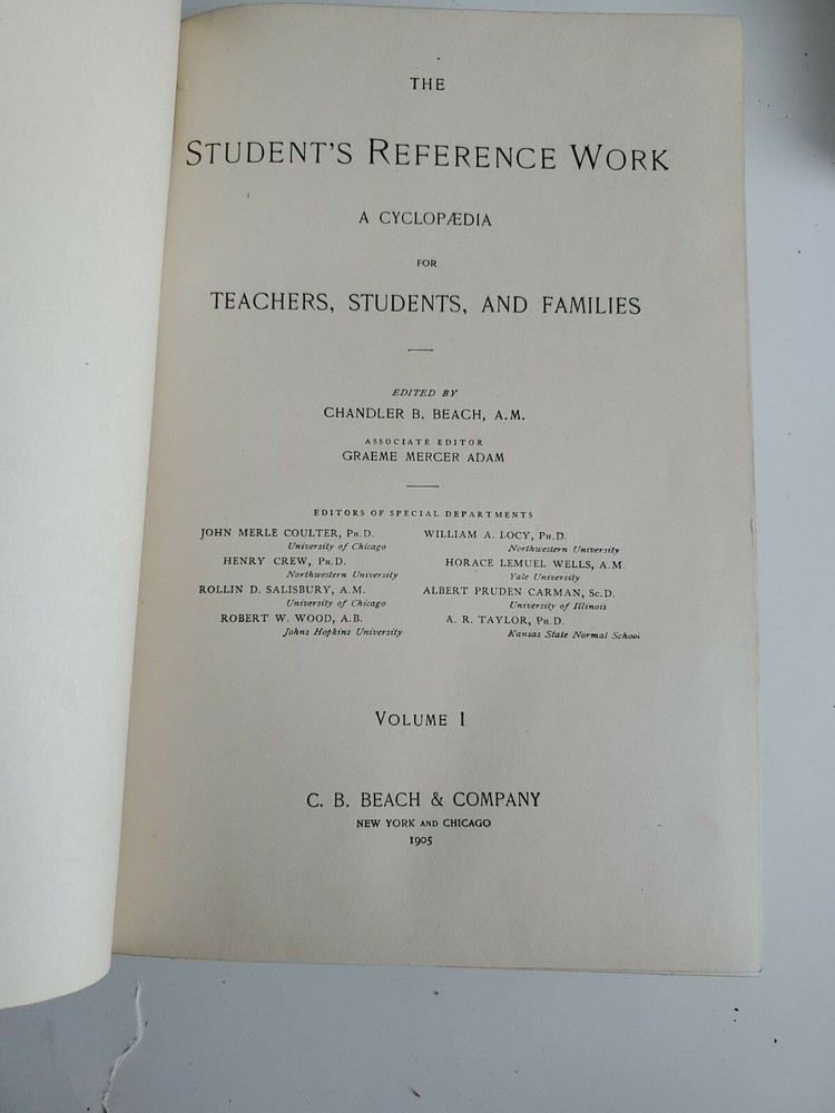 The Students Reference Work A Cyclopedia For Teachers, Students, and Families Edited by Chandler B. Beach, A.M.Associate Editor Graeme Mercer Adam. Published by C. B. Beach & Co. In 1905- Vol. 1 (A-GRE). Leather binding with fabric covered boards. Marbled on all edges of pages. Colored plates along with black and white pictures. Vume 1 of a 3 Volume set. In great condition. If any questions, please ask. D6
