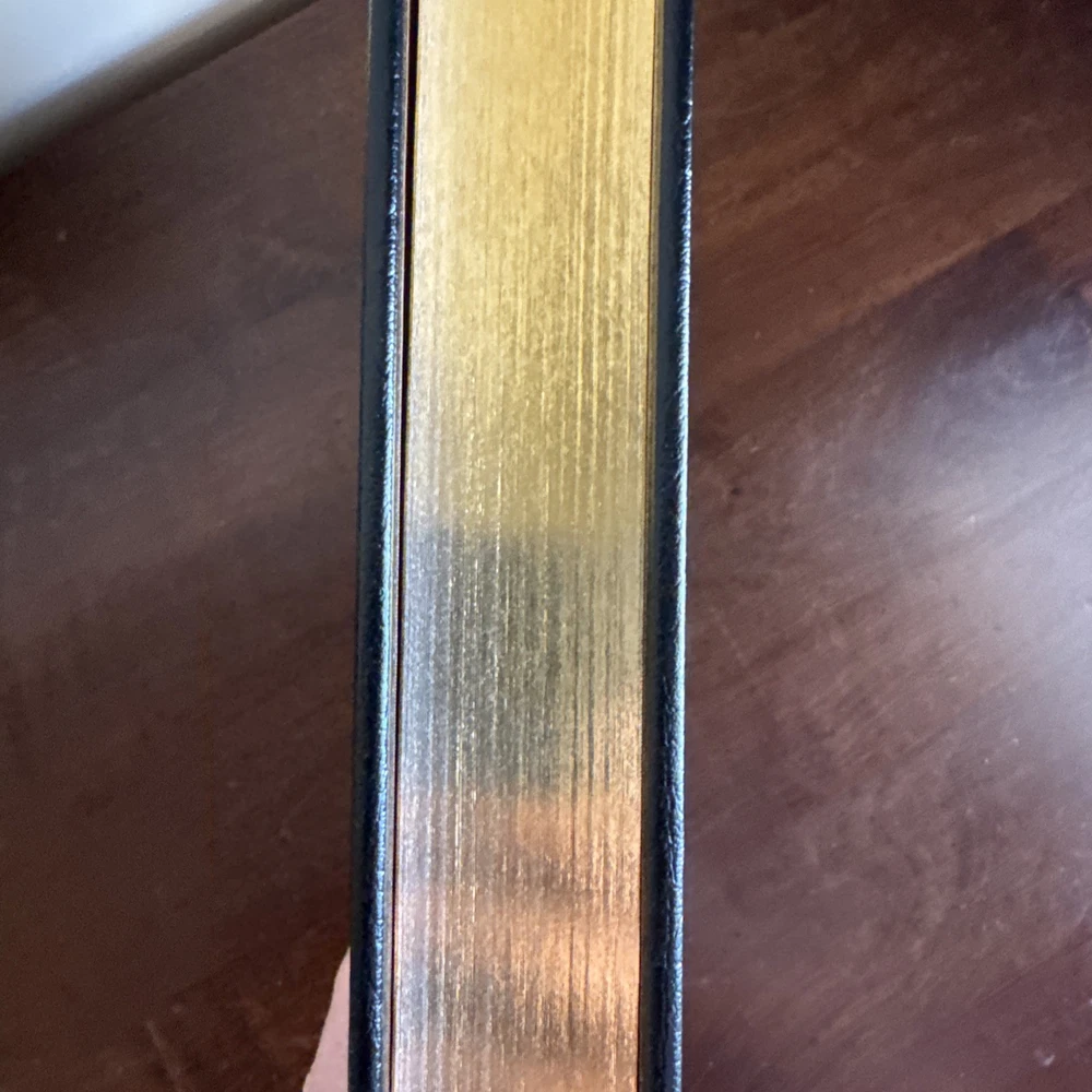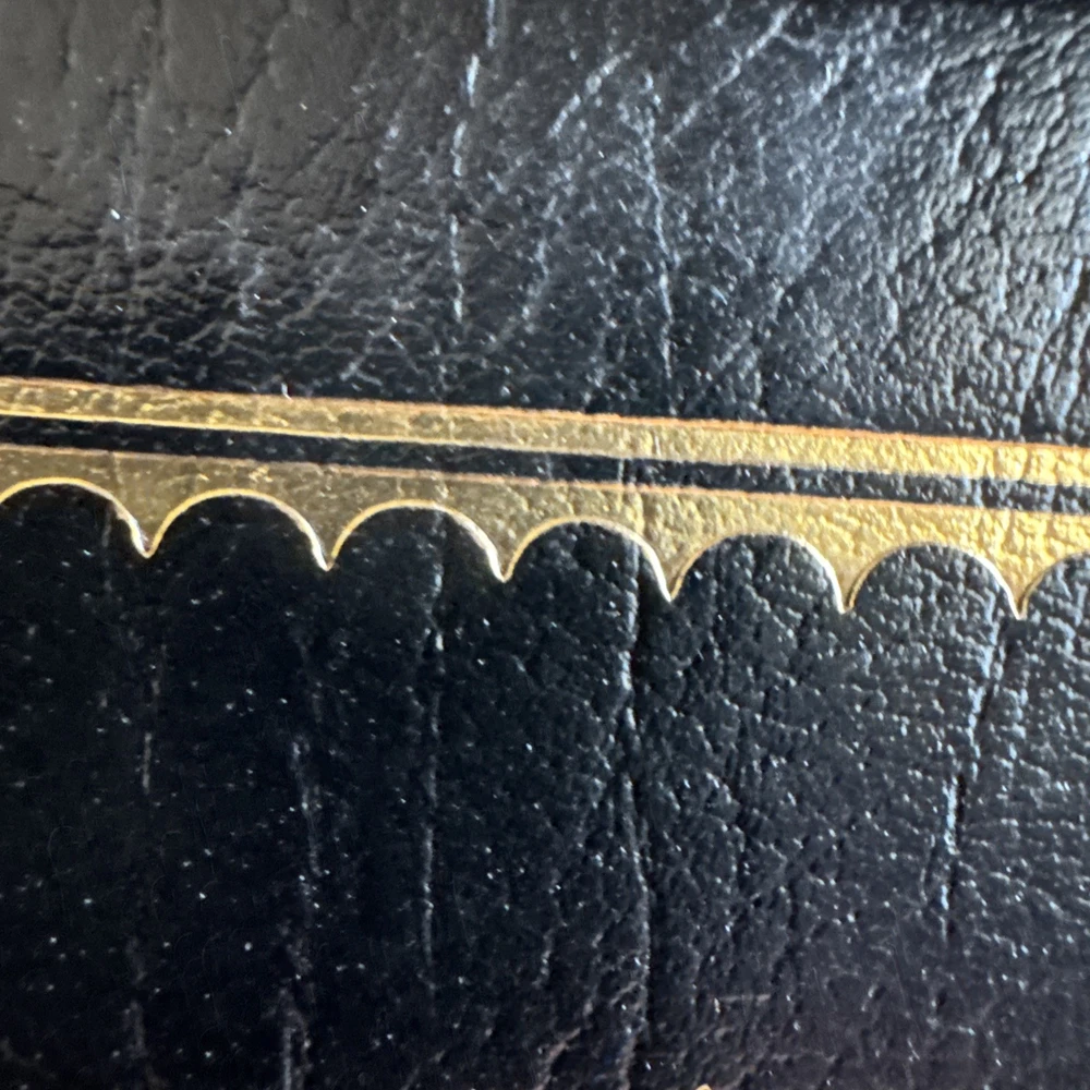 See pictures. Damage to leather in right bottom corner. Scuffs on top gold edging.