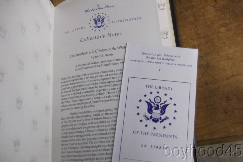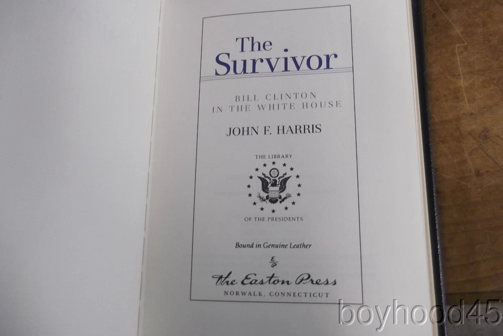 The Survivor: Bill Clinton in the White House-J.F. Harris-EASTON PRESS LEATHER The Survivor: Bill Clinton in the White House-J.F. Harris-EASTON PRESS LEATHER Click images to enlarge Description I have acquired a very extensive collection of lovely Easton Press Leatherbound books from The Library of the Presidents series. The books are in wonderful condition--clean, scarcely-worn, unmarked, and no bookplates attached!! Some might have very light/very minimal scuffing to gilt on page edges and any significant flaws/issues will be noted. Most have the original editor Notes from the publisher. This is "The Survivor: Bill Clinton in the White House" by John F. Harris. Published by Easton Press, Norwalk, Connecticut, 2008. Binding is only scarcely-worn and gilt page edges show no significant wear. THE FORMER OWNER OF THESE BOOKS ATTACHED A CLEAR PLASTIC ENVELOPE TO FRONT ENDPAPER WHERE HE INSERTED PRESIDENTIAL AUTOGRAPHS THAT HE HAD ACQUIRED. THIS COPY IS LACKING THE AUTOGRAPH ALTHOUGH THE ENVELOPE REMAINS. Editor Notes are present. A SCARCE FEW copies of this book can be found on other internet booksites for $200 to upwards of $250!! I will offer this lovely copy for only $150.00 plus $5.00 S&H in the US. PLEASE CHECK ALL OF MY LISTINGS FOR MORE EASTON PRESS LEATHERBOUND BOOKS. I WILL PROVIDE REDUCED, COMBINED SHIPPING RATES FOR MULTIPLE PURCHASES. Condition Notes: Scarcely-worn copy that looks near new!! Payment Paypal Shipping Domestic shipping: Fixed Shipping Charges. International shipping: Fixed Shipping Charges. Shipping Carrier Domestic International Shipping Locations Usps Book Rate $5.00 - - Usps Priority Intl - $39.70 Worldwide I will ship to: United States, Worldwide Vendio Images: More than just a pretty image. 250+ Mobile Responsive & Active Content Free Listing Templates with Vendio Sales Manager. Vendio provides powerful selling automation for sellers of all sizes. Get business information that counts! - Vendio Counters are active content free.
