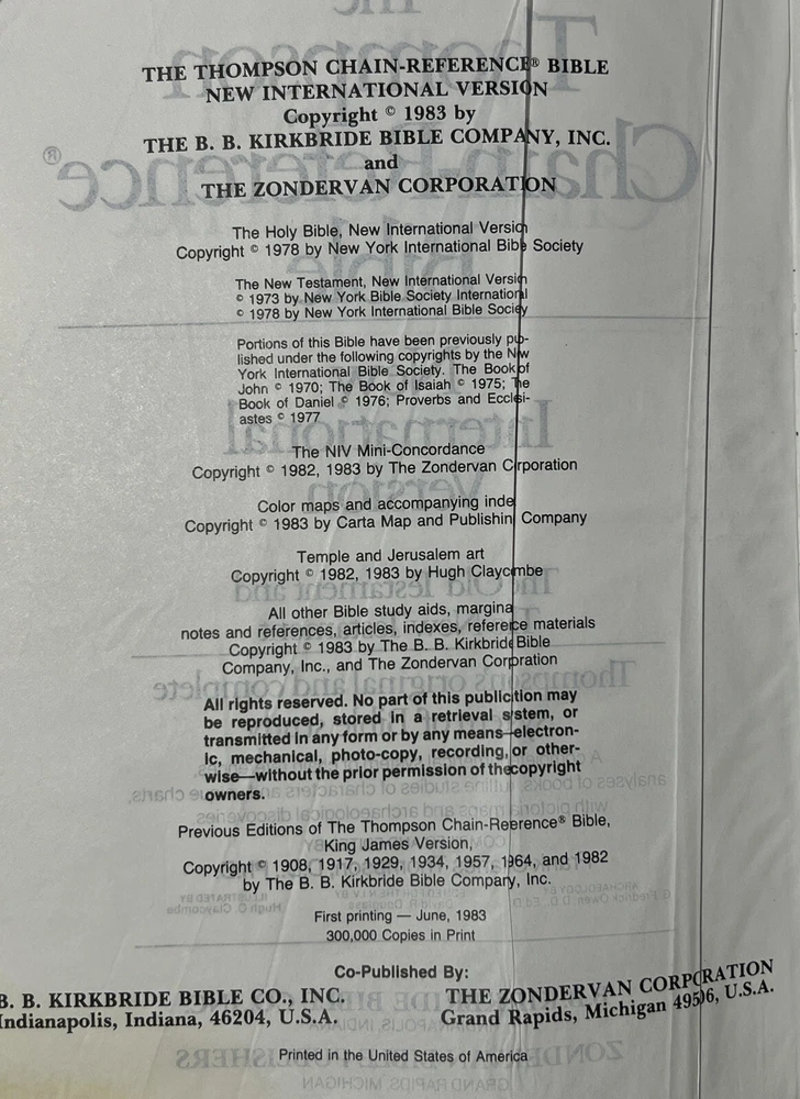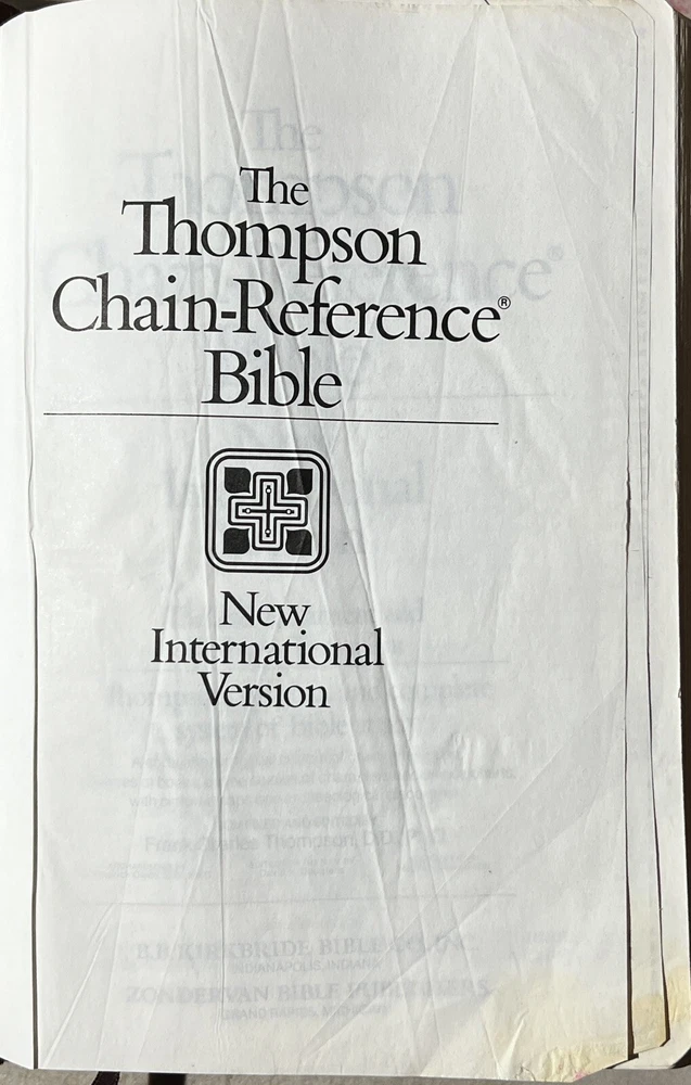 The Thompson Chain-Reference Bible New International Version B.B. Kirkbride 1983 Leather Zondervan Publishing Good condition, see pictures for additional information and condition. Some stating on bottom corner of first few pages.