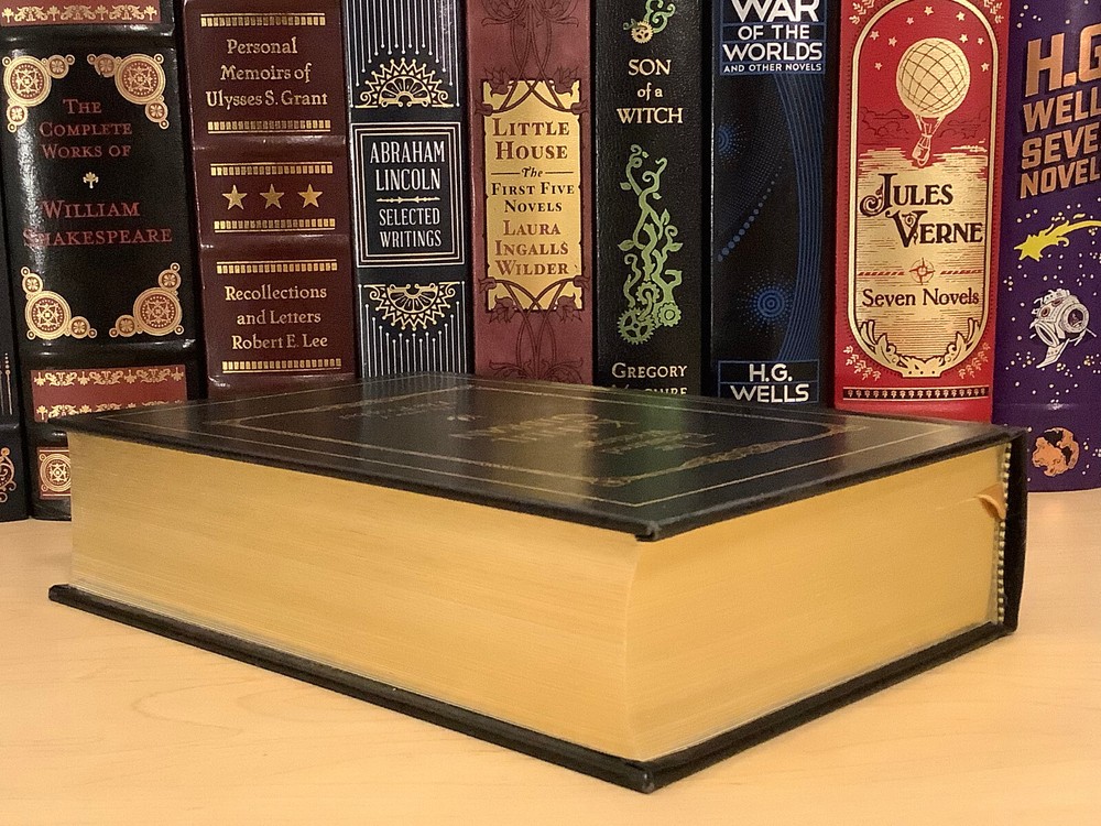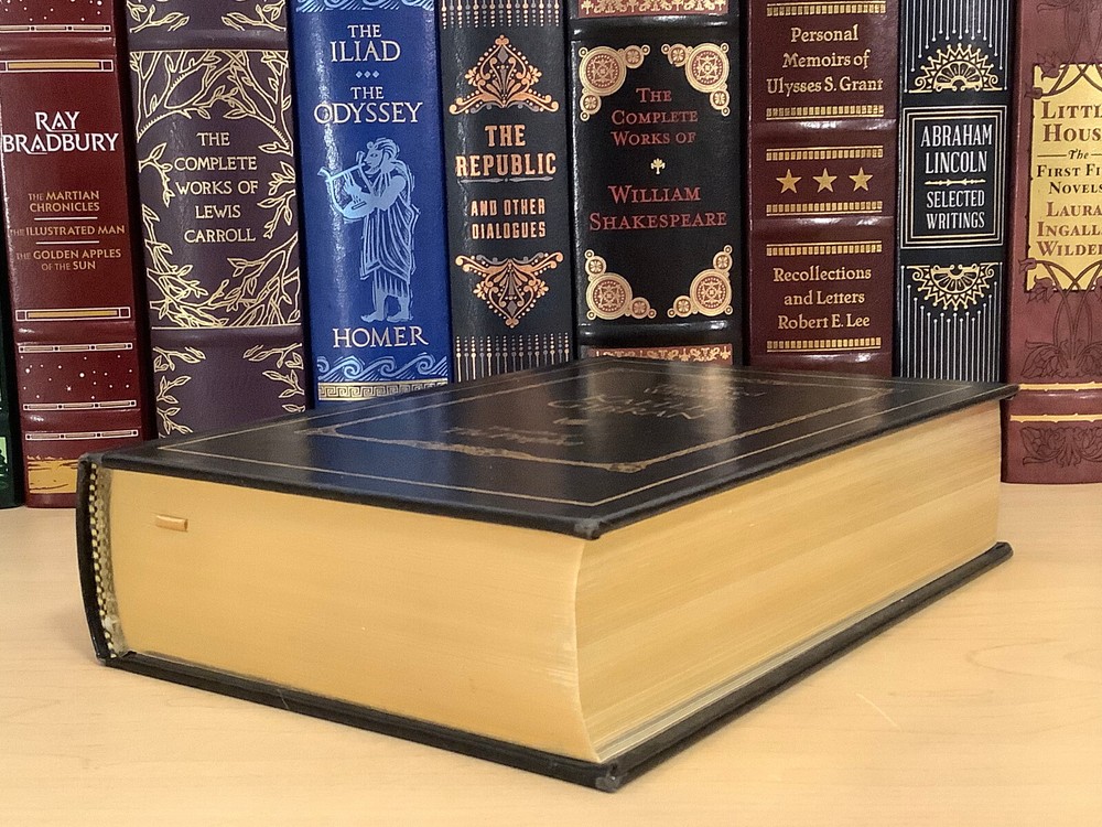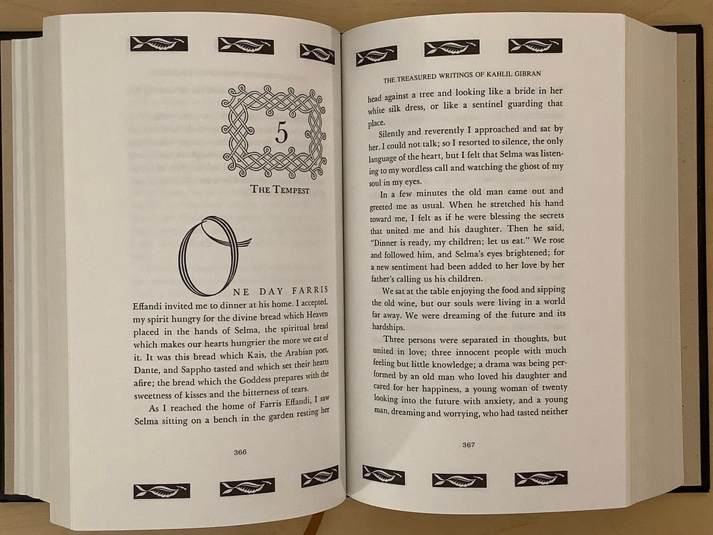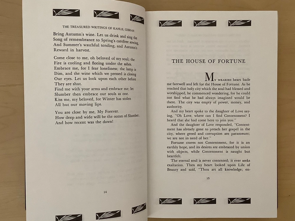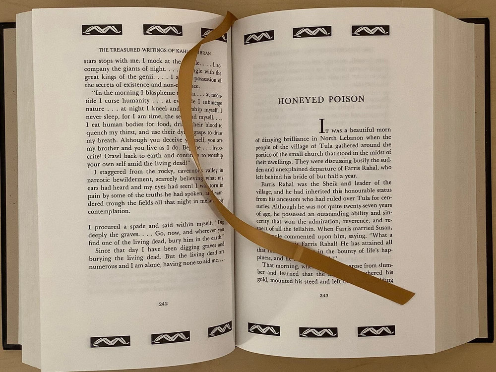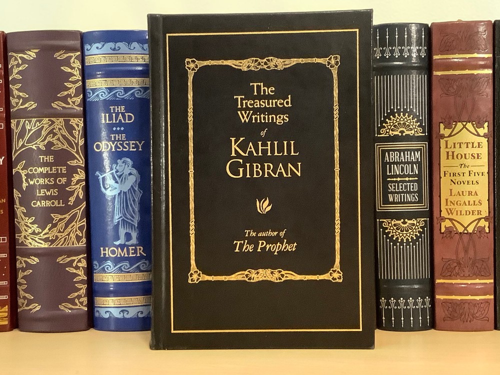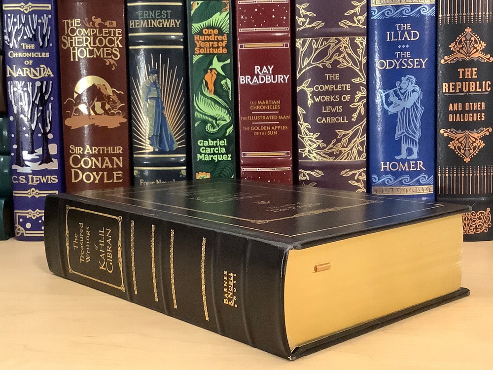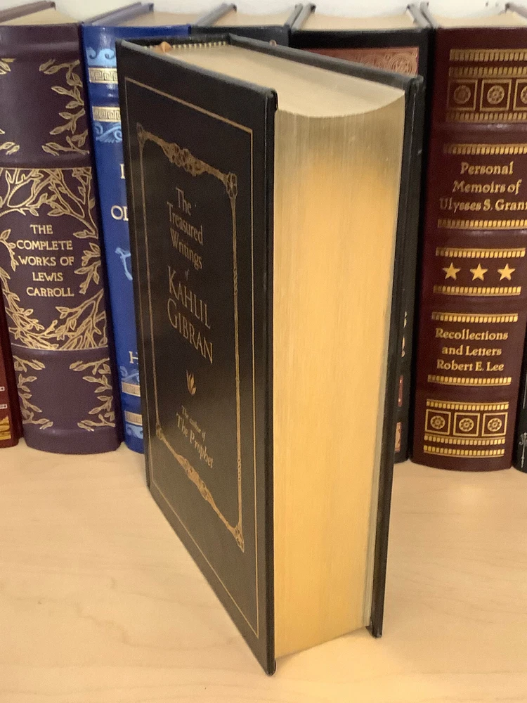 The Treasured Writings of Kahlil Gibran bound in leather, with gilt-edged pages and a ribbon marker. Item Condition: T his is a leatherbound hardcover in Very Good condition. There are no names, bookplates, or stamps from previous owners inside. The binding is tight, with a slight sag to the printblock (see last photo), and the pages are clean. The gilt page edging is shiny with some marks and dings to it. The leather is in nice condition with some wear to the spine and corners which are mildly bumped with rubbing, and there are a couple of marks on the back cover (see photo #2). Dimensions are approx: 9.25" x 6.25" x 2.25" This book will ship in a box with bubble wrap. Photos are of the actual book that will be shipped.