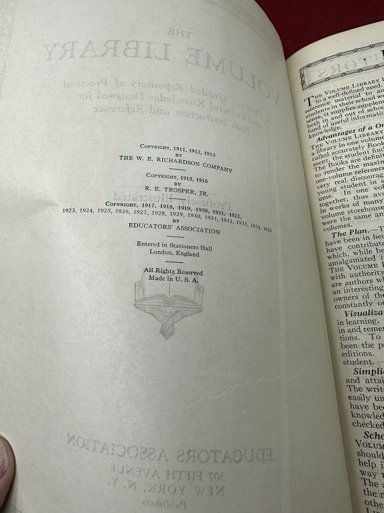 This is an original The Volume Library from Vintage 1935 a Leather Bound History Book from Profusely Illustrated by the Educators Association. A concise, graded repository of practical and cultural knowledge designed for both instructions and reference.
