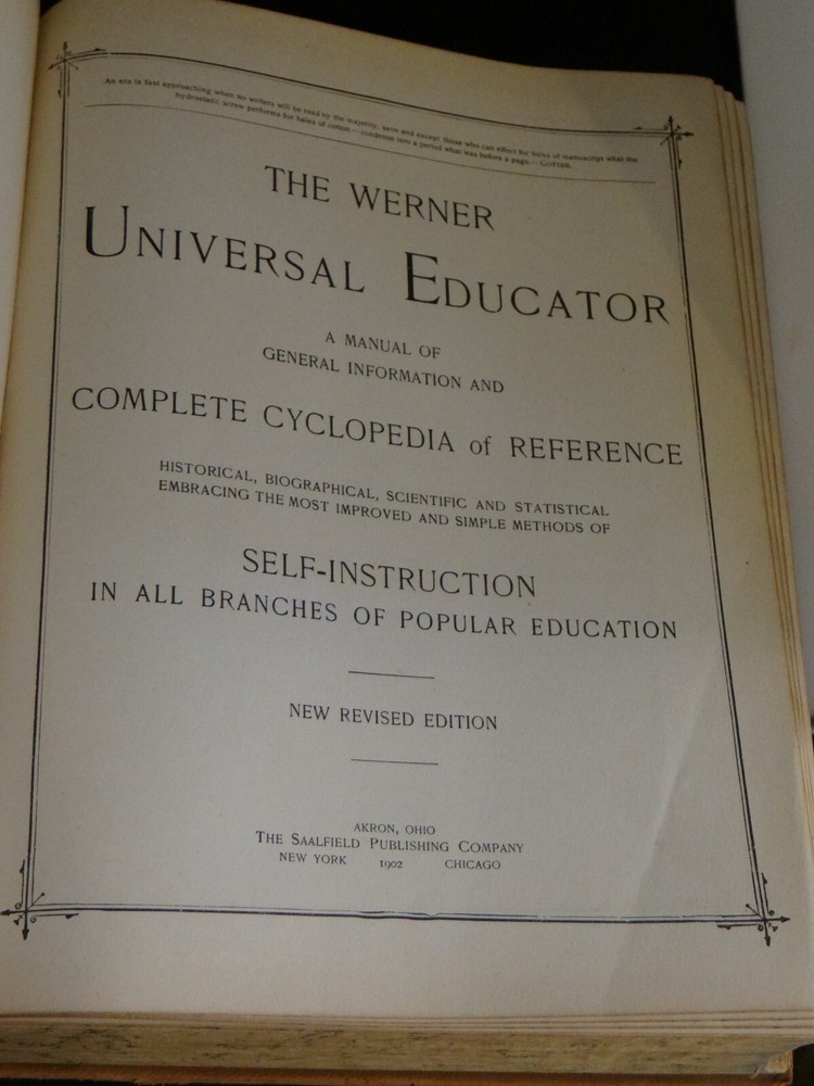 The Werner Universal Educator Complete Cyclopedia Reference 1902 by Saalfield OVERALL GOOD CONDITION. NO TORN OR MISSING PAGES. THE LEATHER COVERS EXHIBIT EDGE WEAR We are Spahrsautographs aka Spahr's Archives. Our job is to liquidate various estates, offices and even storage facilities. Most of the items we sell are from these estates. We strive to make every transaction on eBay a positive one for our buyers! We have been selling on eBay since January 1998, so we've seen our share of unique items! Please check back often as we visit estates frequently and post new items on a daily basis! We combine (reduce) shipping for multiple purchases (United States buyers only) except for sports and trading cards priced below $10.00.