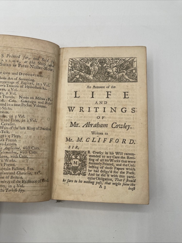This is a rare and collectible book titled "The Works Of Mr. Abraham Crowley In Two Volumes" published in 1721. The book is bound in leather and was published in London by W. Taylor At The Ship And Black Swan. The author is listed as the Right Reverend Dr. Sprat Late Lord Bishop, and the book is categorized as a biography and autobiography. The book is an original copy and was printed in the United Kingdom. Volume 1 & 2 have 829 pages tight binding and clean interior / front board is detached on volume 1 Volume 2 is sound with tight binding Nice condition for age