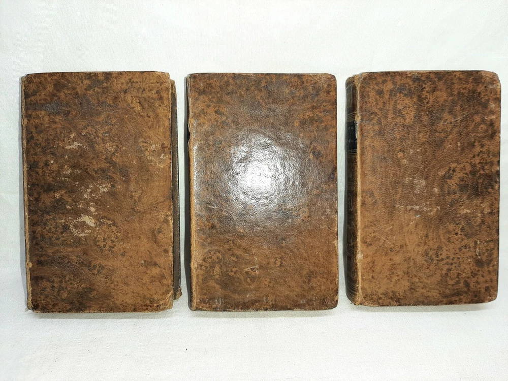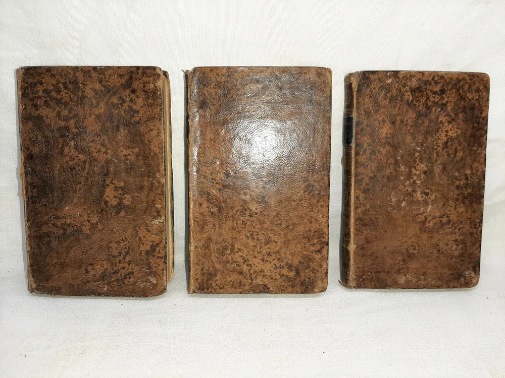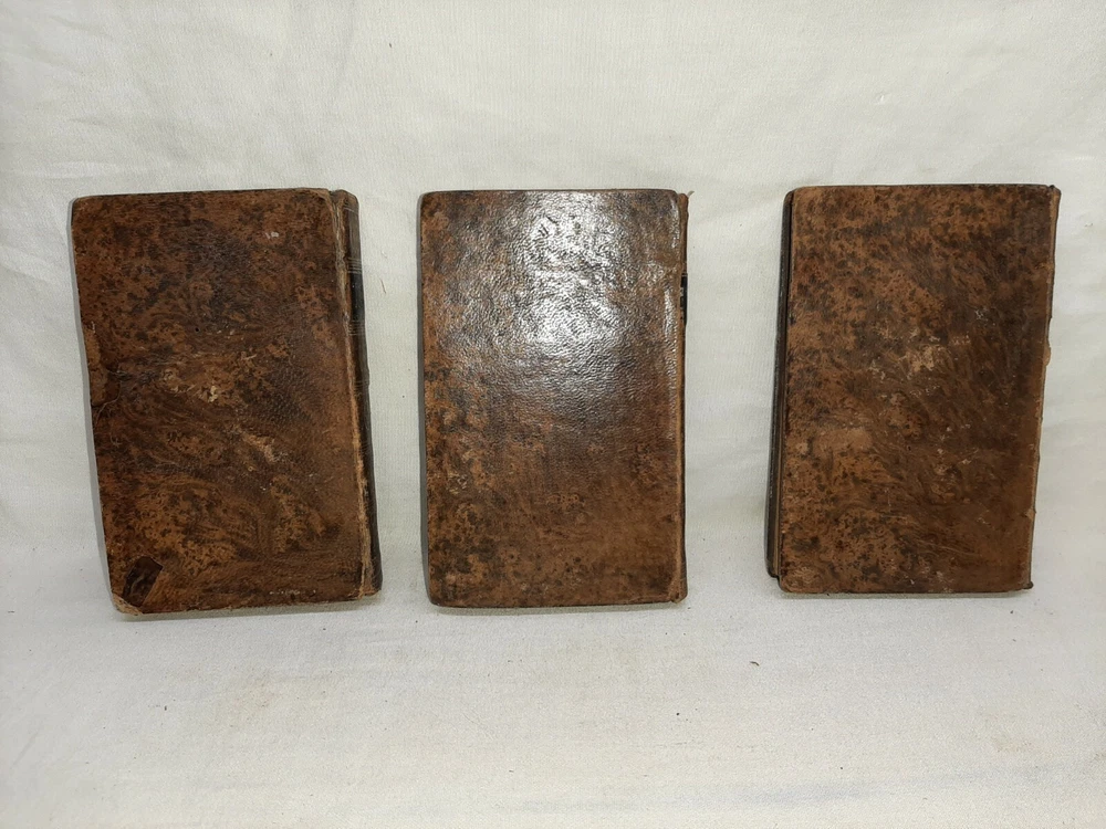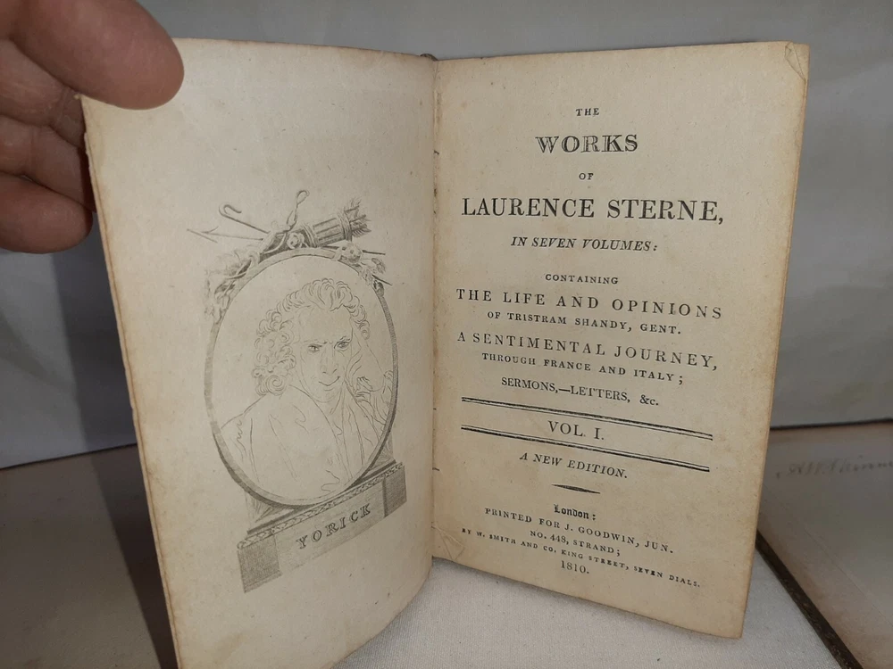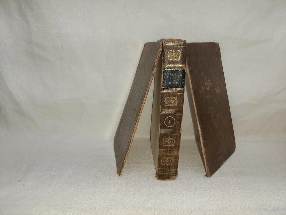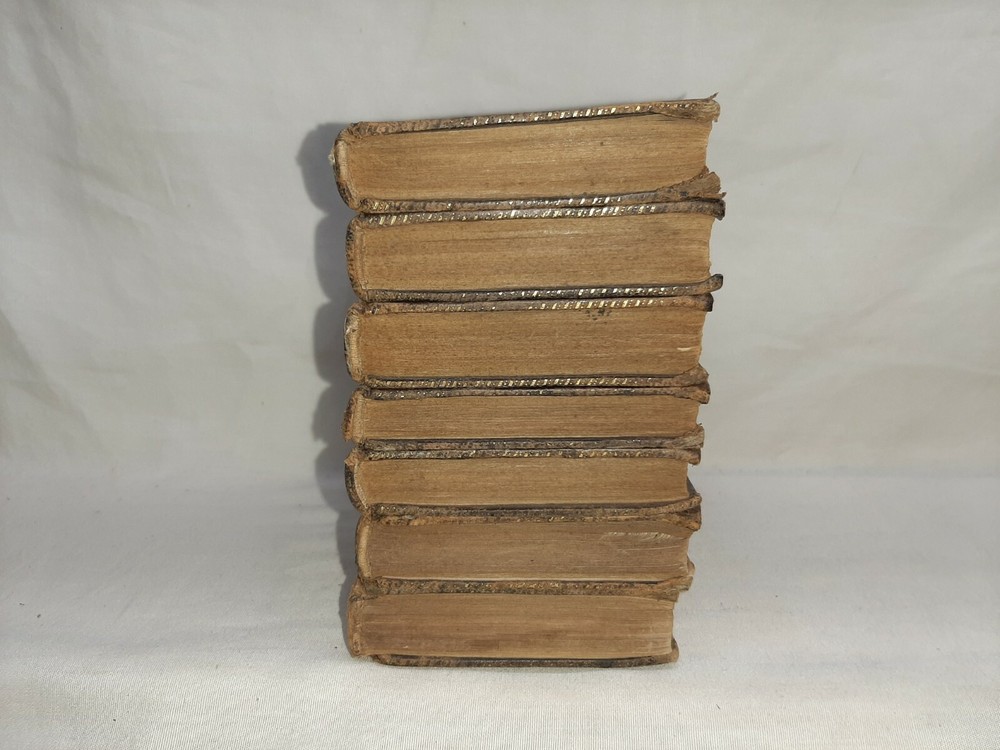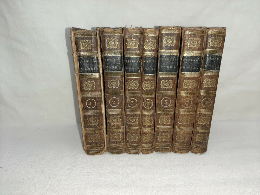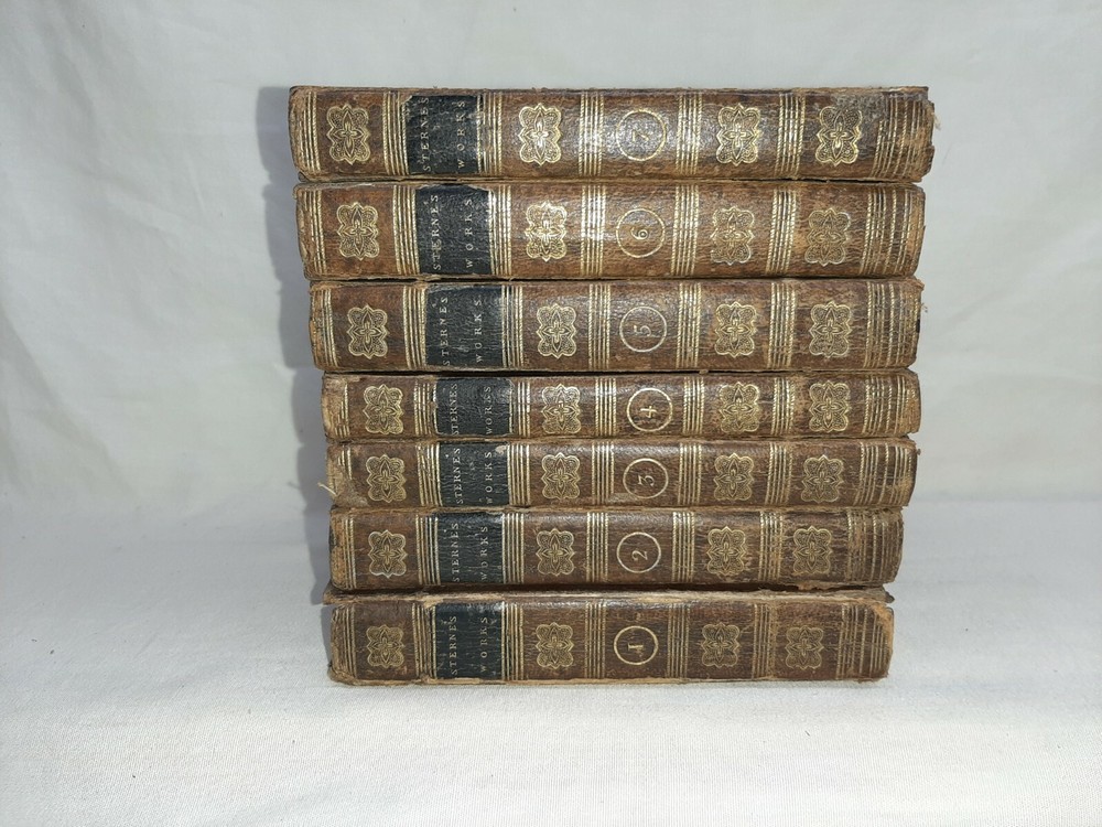 This is the complete 7 volume set and each book is about 4 1/2 inches tall. Under the title is printed "The life and opinions of tristram shandy, gent a sentimental journey through France and Italy; sermons, letters, etc." All the books have edge wear to the covers and spine and scuffed corners and there is soiling to the page edges. Both boards for volume I are no longer attached when can be seen in photo # 6, the rest of the books still have both boards attached. In photo #10 you can see there is a white paper attached to the front pastedown with a name on it, each book has a similar paper with the name on it attached to the front pastedown. Overall this is a nice set. Shipping includes insurance and tracking. Thank you for looking!