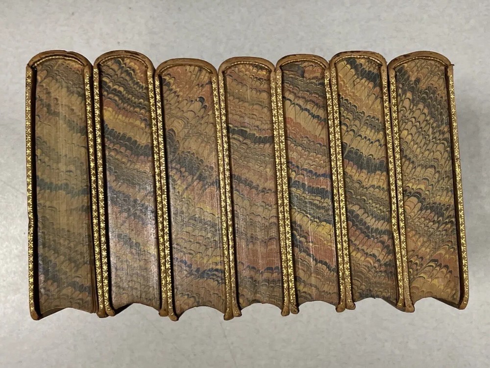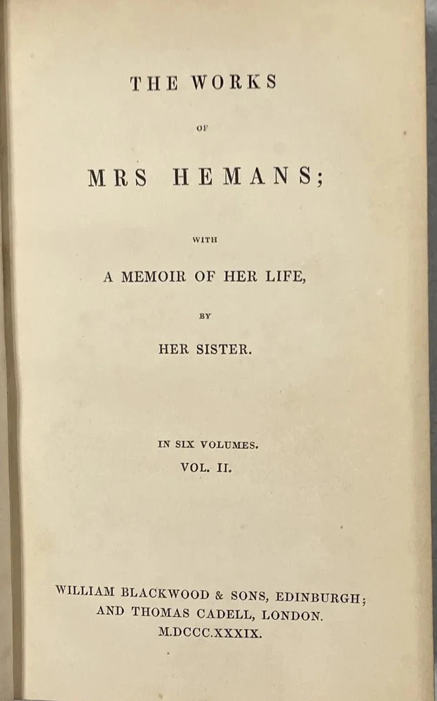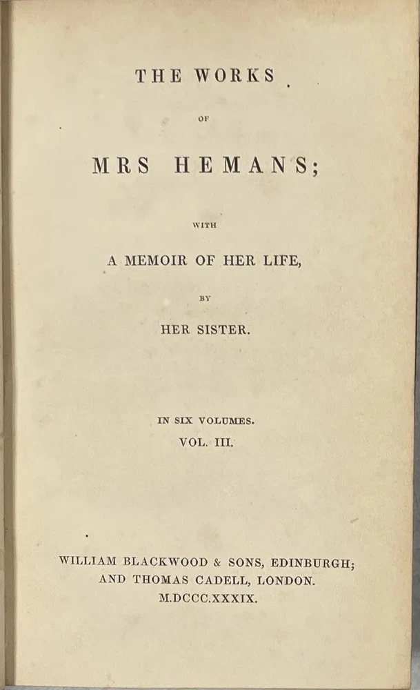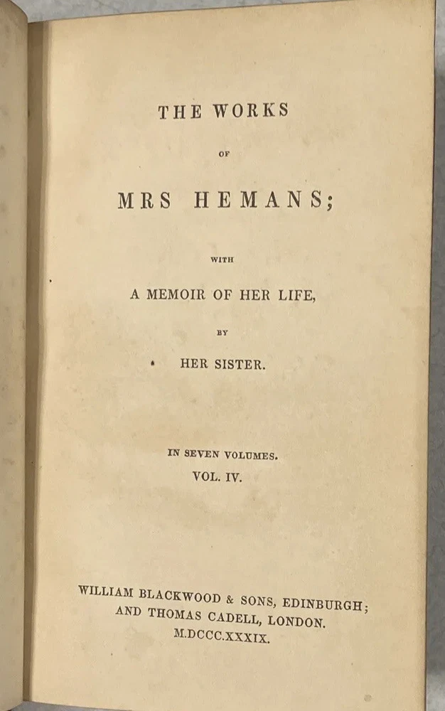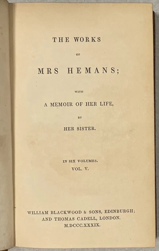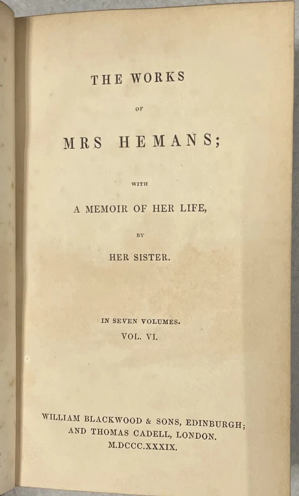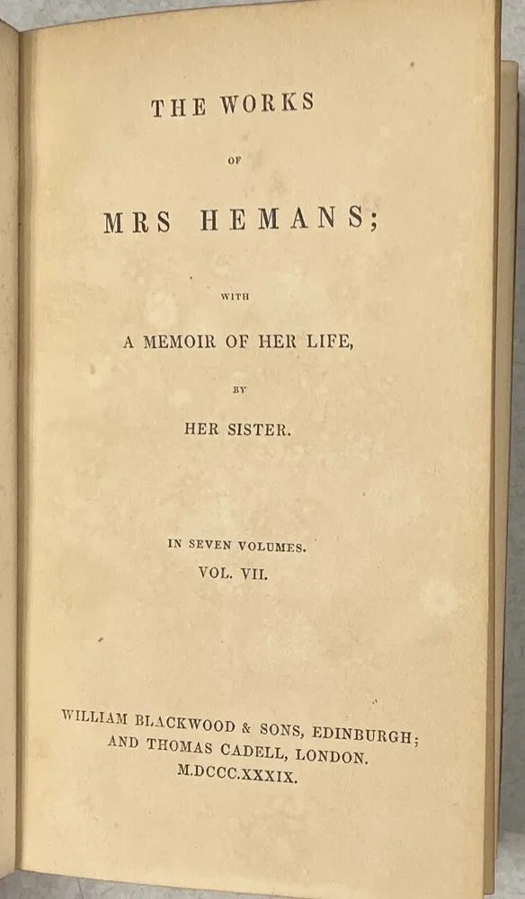 Listing includes complete set (7 volumes) of The Works of Mrs. Hermans; with a Memoir of Her Life, by Her Sister. All items are leather bound with gilt on the boards and marbled edges. Volume I: Memoir of Mrs Hemans, Wallace's Invocation to Bruce, England and Spain; or Valour and Patriotism... Item is in acceptable condition. Wear to the boards and spine including scratches, tears, and staining. Wear to edges; lighter marbling as a result. Scuffing and staining along top edge. Staining due to age from front paste-down endpaper through title page and final page through free endpaper. Tears in spine between front and back paste-down endpapers and free endpa pers. Loose spine; exposed spine between pages 112-113 and 194-195. Detached section from page 351 to the back free endpaper. Volume II: Tales and Historic Scenes, The Restoration of the Works of Art to Italy, Modern Greece... Item is in acceptable condition. Wear to the boards and spine including scratches, tears, and staining. Small stain along top edge. Staining due to age from front paste-down endpaper through title page. Tears in spine between front and back paste-down endpapers and free endpa pers. Loose spine. Volume III: The Sceptic, A Tale of the Secret Tribunal, Superstition and Revelation, The Caravan in the Deserts... Item is in acceptable condition. Wear to the boards and spine including scratches, tears, and staining. Scratch along top edge that has caused small tears and creases on pages 170-222. Staining due to age from front paste-down endpaper through title page. Tear in spine between front paste-down endpaper and front free endpaper. Slightly loose spine; exposed spine between pages 222-223. Volume IV: The Forest Sanctuary, Lays of Many Lands, Miscellaneous Pieces, Dartmoor, Welsh Melodie... Item is in acceptable condition. Wear to the boards and spine including scratches, tears, and staining. Small white stain along top edge. Staining due to age from front paste-down endpaper through title page. Tears in spine between front and back paste-down endpapers and free endpa pers. Loose spine; exposed spine between pages 146-147 and 158-159. Volume V: The Verses of Palermo, Songs of the Cid, On A Flower from the Field of Grutli, On a Leaf from the Tomb of Virgil... Item is in acceptable condition. Wear to the boards and spine including scratches, tears, and staining. Staining due to age from front paste-down endpaper through title page. Slight tears in spine between front and back paste-down endpapers and free endpapers. Slightly loose spine. Volume VI: Songs of the Affections, Miscellaneous Poems, National Lyrics. Item is in acceptable condition. Wear to the boards and spine including scratches, tears, and staining. Staining due to age from front paste-down endpaper through title page. Tears in spine between front and back paste-down endpapers and free endpa pers. Slightly loose spine. Crease on page 304. Volume VII: Songs of a Guardian Spirit, Songs of Spain, Songs for Summer Hours... Item is in acceptable condition. Wear to the boards and spine including scratches, tears, and staining. Staining due to age from front paste-down endpaper through title page. Tear in spine between front paste-down endpaper and front free endpaper. Slightly loose spine; exposed spine between pages 146-147.