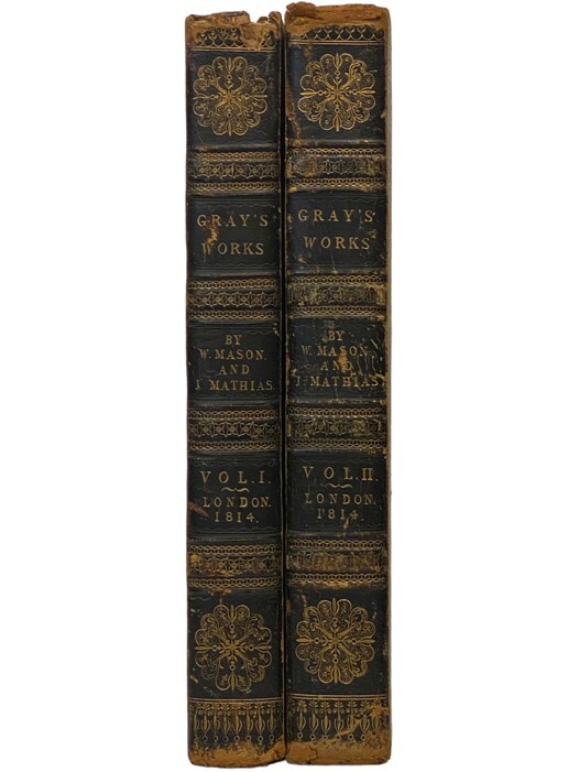 Yesterday's Muse, Inc. presents ... The Works of Thomas Gray, with Memoirs of His Life and Writings, to which are subjoined Extracts Philological, Poetical, and Critical from the Author's Original Manuscripts, in Two Volumes [Large Paper Edition] Author: Gray, Thomas; Mason, William; Mathias, Thomas James Publisher: William Bulmer and Co. / Shakspeare Press for John Porter in Pall-Mall Bookseller to Her Royal Highness the Princess Charlotte Release Date: 1814 Seller Category: -- Qty Available: 1 Condition: Used: Good Sku: 2341091 Notes: Large paper edition. Boards rubbed with some surface tears to leather, ink gift note on front flyleaf ('George Frederick James his father Frederick Dimsdale LL.D, judge of county courts. a present on his birth-day January 29th 1863.'), owner bookplate on front endpaper of each volume. 1814 Full-Leather. [xiv], 581, [5]; vii, [1], 634, [4] pp. Folio. Full black morocco, gilt titles, decorations and dentelles on turn-ins, all edges gilt. A collection of Gray's verse and other writings, including his most well-known poem, Elegy Written in a Country Churchyard, which was originally written in 1751. This edition is notable for the facsimiles of manuscript material, engraved frontispieces in each volume, and Gray's thoughts on the philosophical writings of Plato. Don't forget to check out other great deals in our eBay Store!!