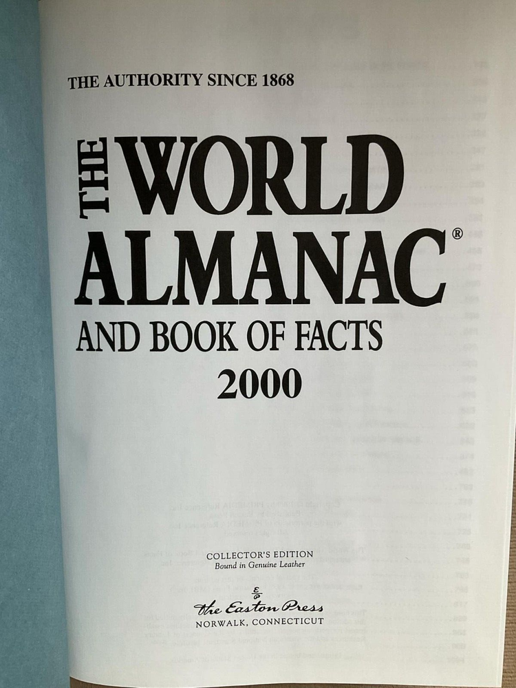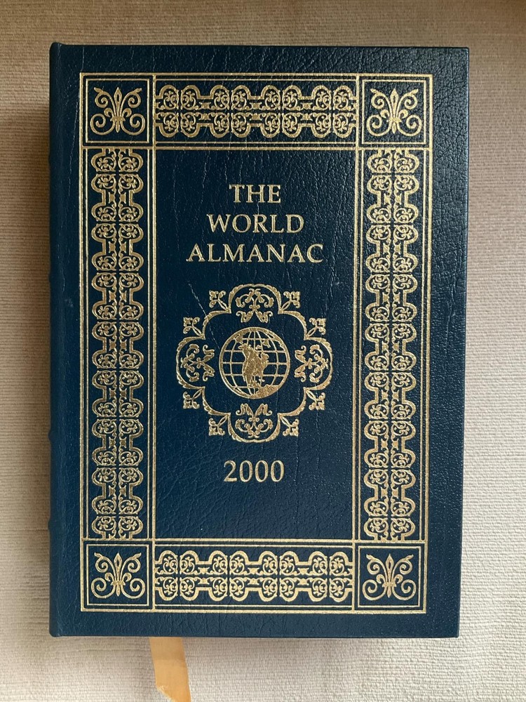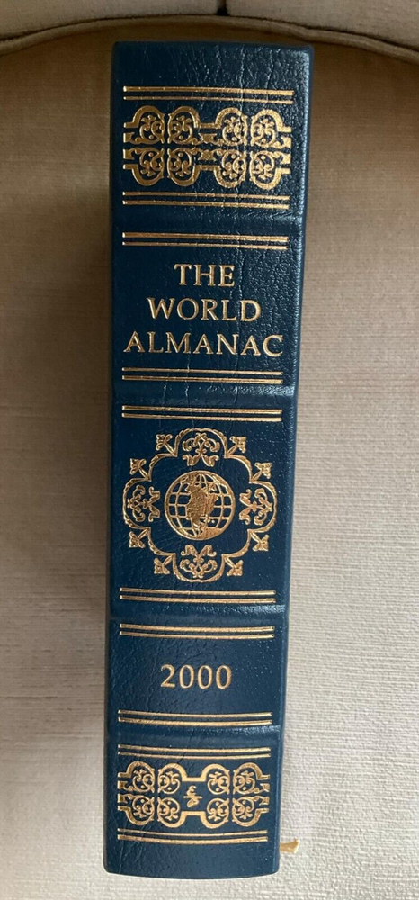 You are bidding on a magnificent book titled World Almanac 2000. Published by The Easton Press. This book is from the Collector's Edition Bound in Genuine Leather. It is a beautiful book! This book is a wealth of information with over 1,000 pages!!! Condition: On inside front cover is a gift inscription written on November 8, 2000. Aside from a tiny bit of discoloration to foredge (refer to picture), book remains in near-fine condition. Accented in 22kt gold, printed on archival paper with gilded edges, smyth sewing & concealed muslin joints. Bound In full leather with hubbed spines. Book is in near-fine condition. It's a beauty! Easton Press books are for people for whom the literary experience is enhanced by beholding, touching, and smelling magnificently-crafted masterpieces of literature. They become cherished books of a collection. Features of Easton Press books are: Very beautiful and collectible! Would make a terrific addition to a collection. (Inventory: 229) Track Page Views With Auctiva's FREE Counter