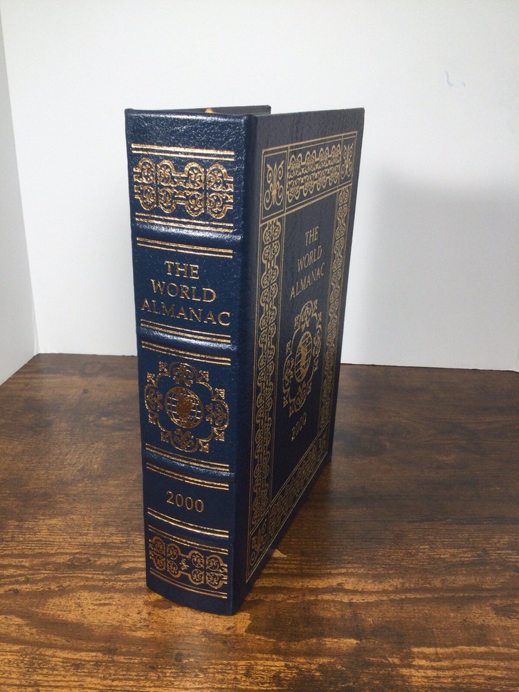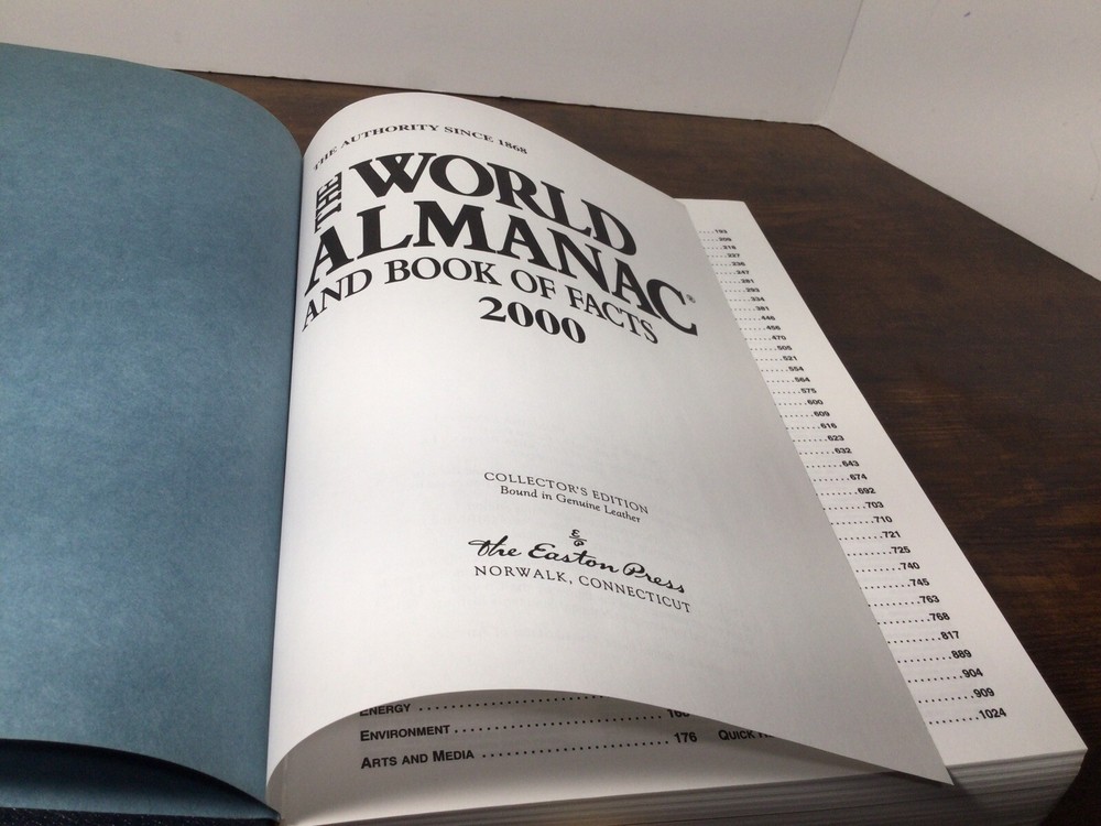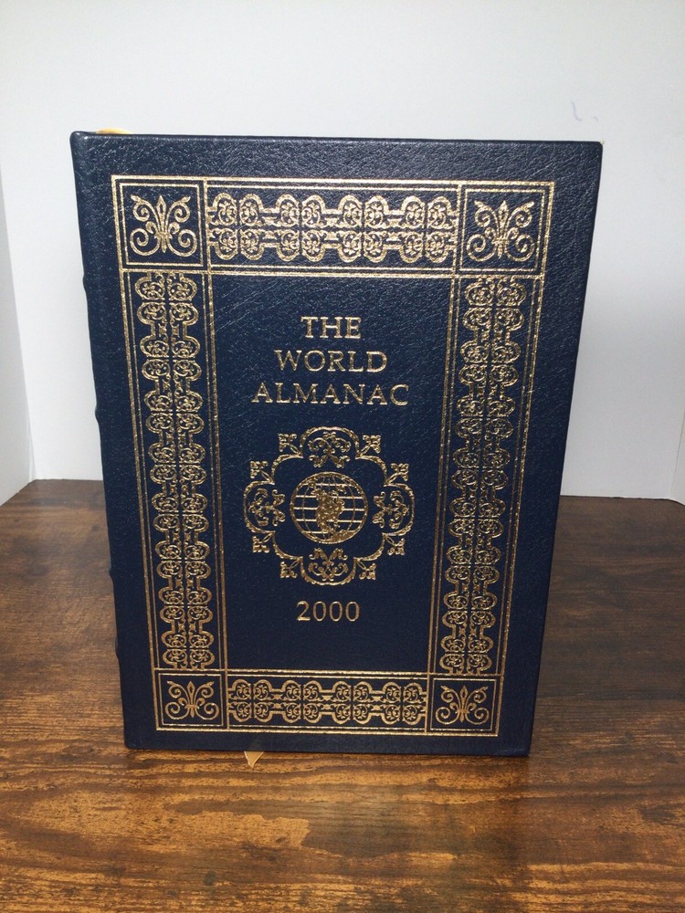 This is a collector's edition of The World Almanac and Book of Facts for the year 2000, published by Easton Press in 1999. It is leather-bound and printed in English. The book is a reference work and covers various topics including almanacs. It was printed in Connecticut and is in good condition. Great book exactly as pictured shipped quickly.