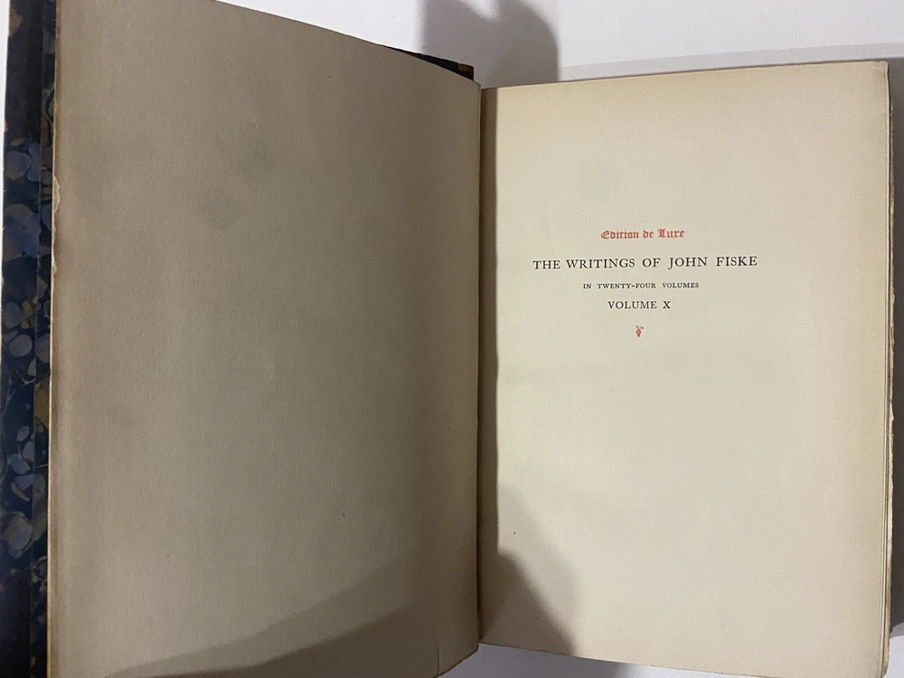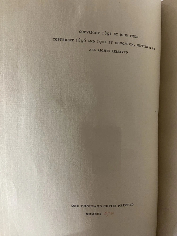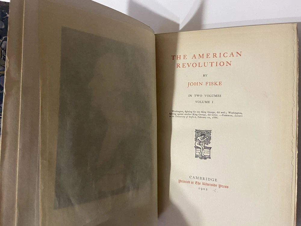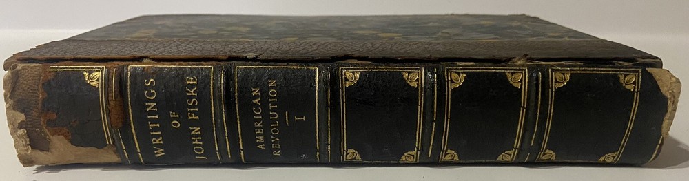 The Writings of John Fiske: American Revolution Vol 1 (1902 Leather Bound). An acceptable poor leather bound hardcover. No jacket issued. Boards have heavy shelf wear and scuffing throughout. Corners bumped. Front cover board starting to detach. Pages lightly age toned. Previous ownership plate on boards inner panel. Previous price penciled in on FEP. Lite water damage to rear end papers. Limited edition #274 of 1000. Always shipped with care.