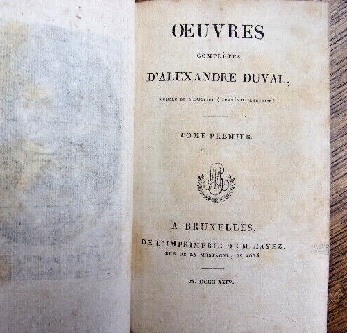 Theater. Complete Works of Alexandre Duval 16/16 Volumes. 1824 (RAE) The description of this item has been automatically translated. If you have any questions, please feel free to contact us. Complete works of Alexandre Duval portrait engraved on frontispiece Complete 16 volumes half leather bound, 140x90, rubbing, good interior condition. approximately 300 per volume. Christine, tragedy; True bravery, comedy; The Suspects, comedy; The Unforeseen Supper, comedy; The heirs, comedy; The youth of the Duke of Richelieu, comedy; The capitol saved, lyrical tragedy; The mania for being something, comedy; Marie, drama; Bella, comedy; The Prisoner, comedy; Montoni, drama; The old castle, comedy; The Courtesan, drama; Marriage plans, comedy; Uncle Valet, comedy; The thirty and forty, comedy; The guardians avenged, comedy; Béniowski, comic opera; The Marais House, comedy; Struense, drama; House for sale, comedy; An Adventure of Saint-Foix, comic opera; Edward in Scotland, historical drama; William the Conqueror, historical drama; Shakespeare in Love, comedy; The Hussists, melodrama; The Domestic Tyrant, comedy; The carpenter of Livonia, comedy; The willful mistake, comedy; The Youth of Henry V, comedy; Joseph, drama; Artists by occasion, comedy; The tapestry, comedy-madness; The Knight of Industry, comedy; The old amateur, prologue; the false Stanislas, comedy; The Misanthrope Woman, comedy; The troubadour prince, comic opera; The mania for grandeur, comedy; The Return of a Crusader, great melodrama; The Prodigal Son, 12th century comedy; The Maid of Honor, comedy; The fake guy, comedy; The kidnapped officer, comedy; The Young Lottery Man, comedy; The English Speaker, comedy; The Princess of Ursins, comedy; The family plot, comedy. With instructions for each part. Alexandre Duval is a French playwright, librettist and actor, born in Rennes on April 6, 1767 and died in Paris on January 9, 1842. A. Bruxelles, from the Imprimerie de M. Hayez, 1824. Rare Ref/34 Christine, tragedy; True bravery, comedy; The Suspects, comedy; The Unforeseen Supper, comedy; The heirs, comedy; The youth of the Duke of Richelieu, comedy; The capitol saved, lyrical tragedy; The mania for being something, comedy; Marie, drama; Bella, comedy; The Prisoner, comedy; Montoni, drama; The old castle, comedy; The Courtesan, drama; Marriage plans, comedy; Uncle Valet, comedy; The thirty and forty, comedy; The guardians avenged, comedy; Béniowski, comic opera; The Marais House, comedy; Struense, drama; House for sale, comedy; An Adventure of Saint-Foix, comic opera; Edward in Scotland, historical drama; William the Conqueror, historical drama; Shakespeare in Love, comedy; The Hussists, melodrama; The Domestic Tyrant, comedy; The carpenter of Livonia, comedy; The willful mistake Époque XIXème Reliure Cuir Type Lot de livres anciens Langue Français Langue Grec Auteur Duval Sujet Pièces, théâtre et scripts Date de publication 1830 Nom Roman