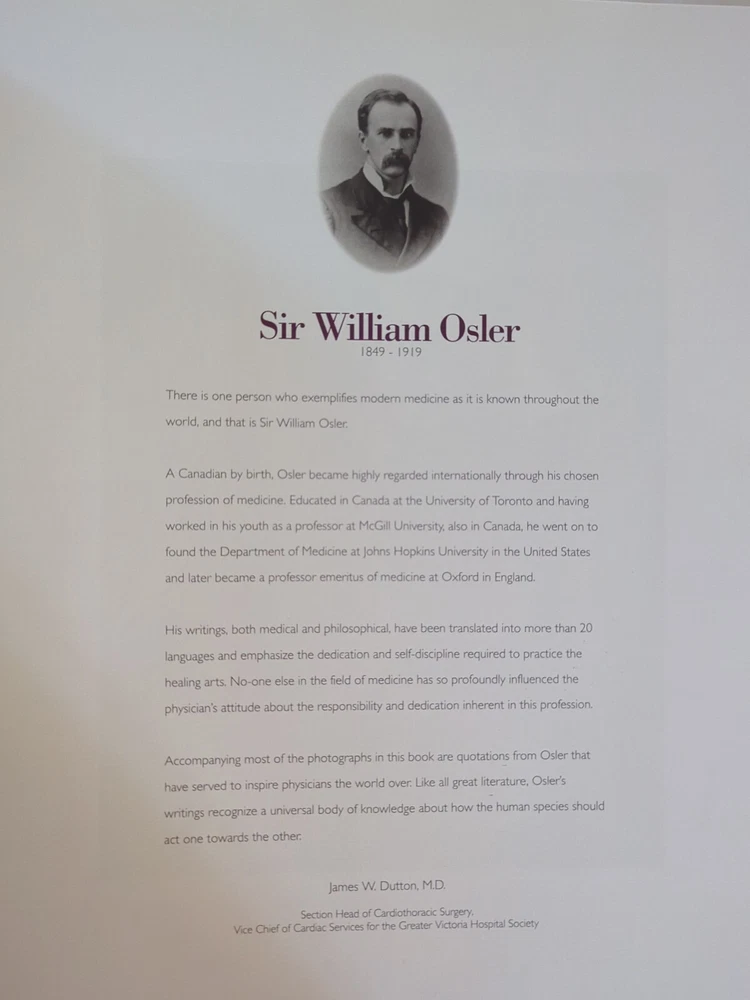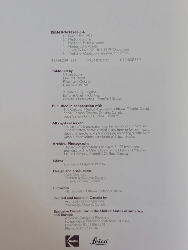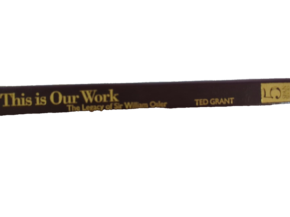 "This Is Our Work: The Legacy of Sir William Osler" by Ted Grant SIGNED BY TED GRANT, NUMBERED 241/250 Leather bound Hardcover Introduction by Douglas Waugh, M.D. Published by 5 Span Books, Pakenham, Ontario Canada, 1994 From the Book: "Sir William Osler 1849-1919 There is one person who exemplifies modern medicine as it is known throughout the world, and that is Sir William Osler. A Canadian by birth, Osler became highly regarded internationally through his chosen profession of medicine. Educated in Canada at the University of Toronto and having worked in his youth as a professor at McGill University, also in Canada, he went on to found the Department of Medicine at Johns Hopkins University in the United States and later became a professor emeritus of medicine at Oxford in England. His writings, both medical and philosophical, have been translated into more than 20 languages and emphasize the dedication and self-discipline required to practice the healing arts. No-one else in the field of medicine has so profoundly influenced the physician's attitude about the responsibility and dedication inherent in this profession. Accompanying most of the photographs in this book are quotations from Osler that have served to inspire physicians the world over. Like all great literature, Osler's writings recognize a universal body of knowledge about how the human species should act one towards the other." James W. Dutton, M.D.