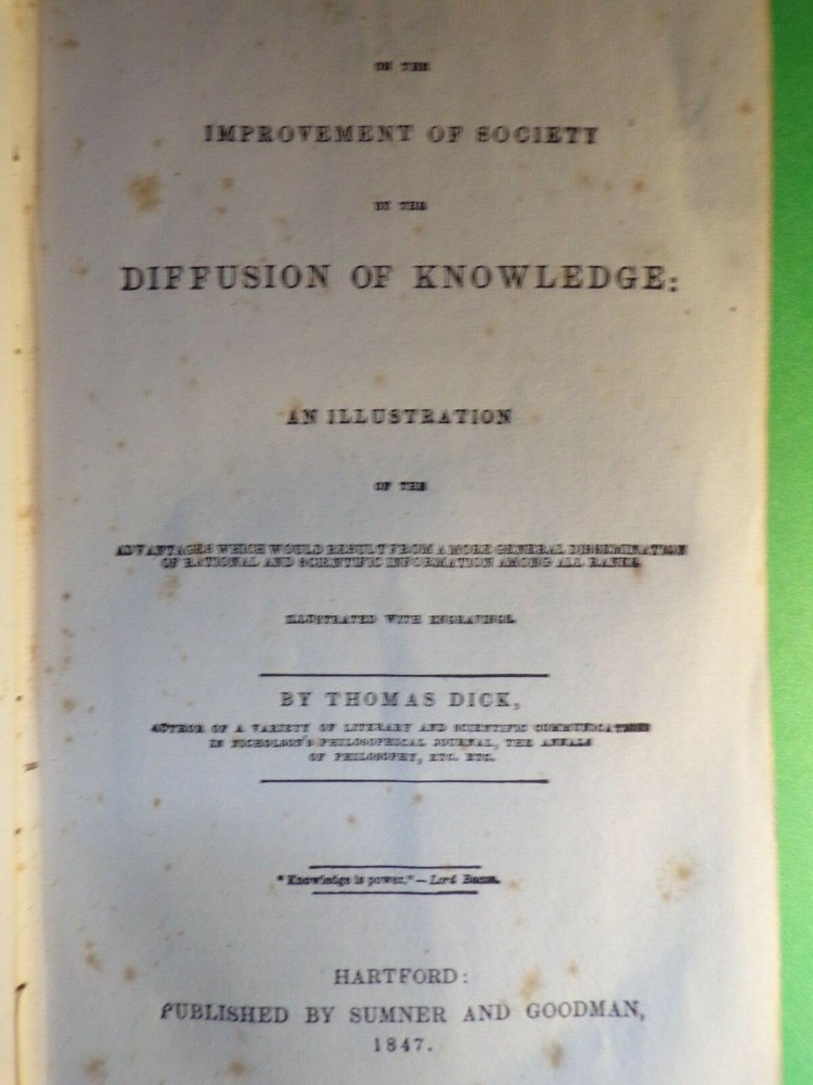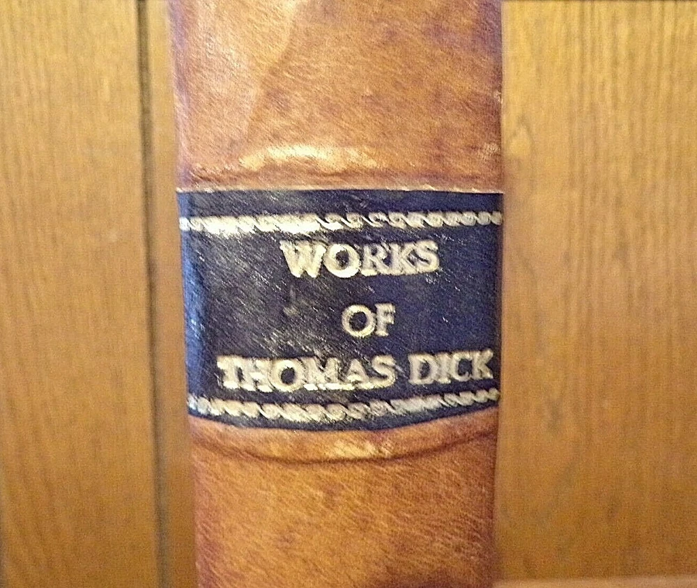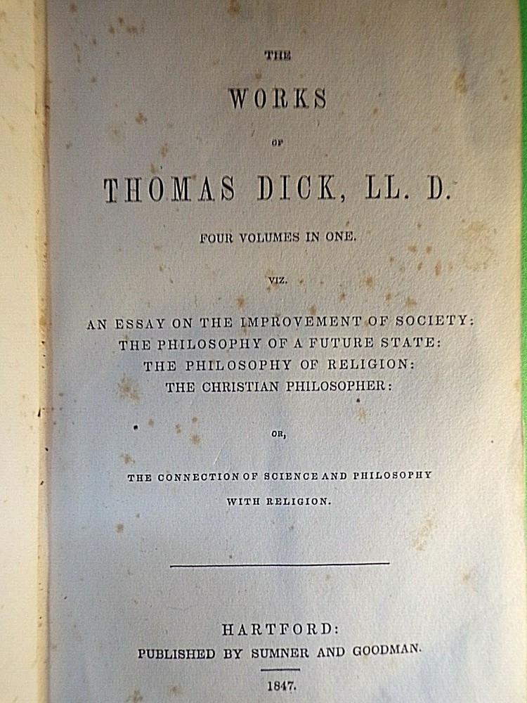 The Works - Four Volumes in One by Thomas Dick Published by Sumner & Goodman (1847) - Hardcover, no Dustjacket as issued Edition Info Not Provided Beautifully marbled top, fore and bottom page edges. Book is in very good condition, with wear due to the covers, especially to the edges, corners, and spine. Looks to be rebound. Foxing throughout.