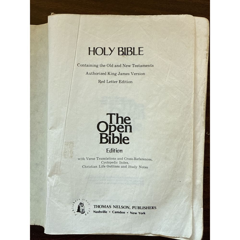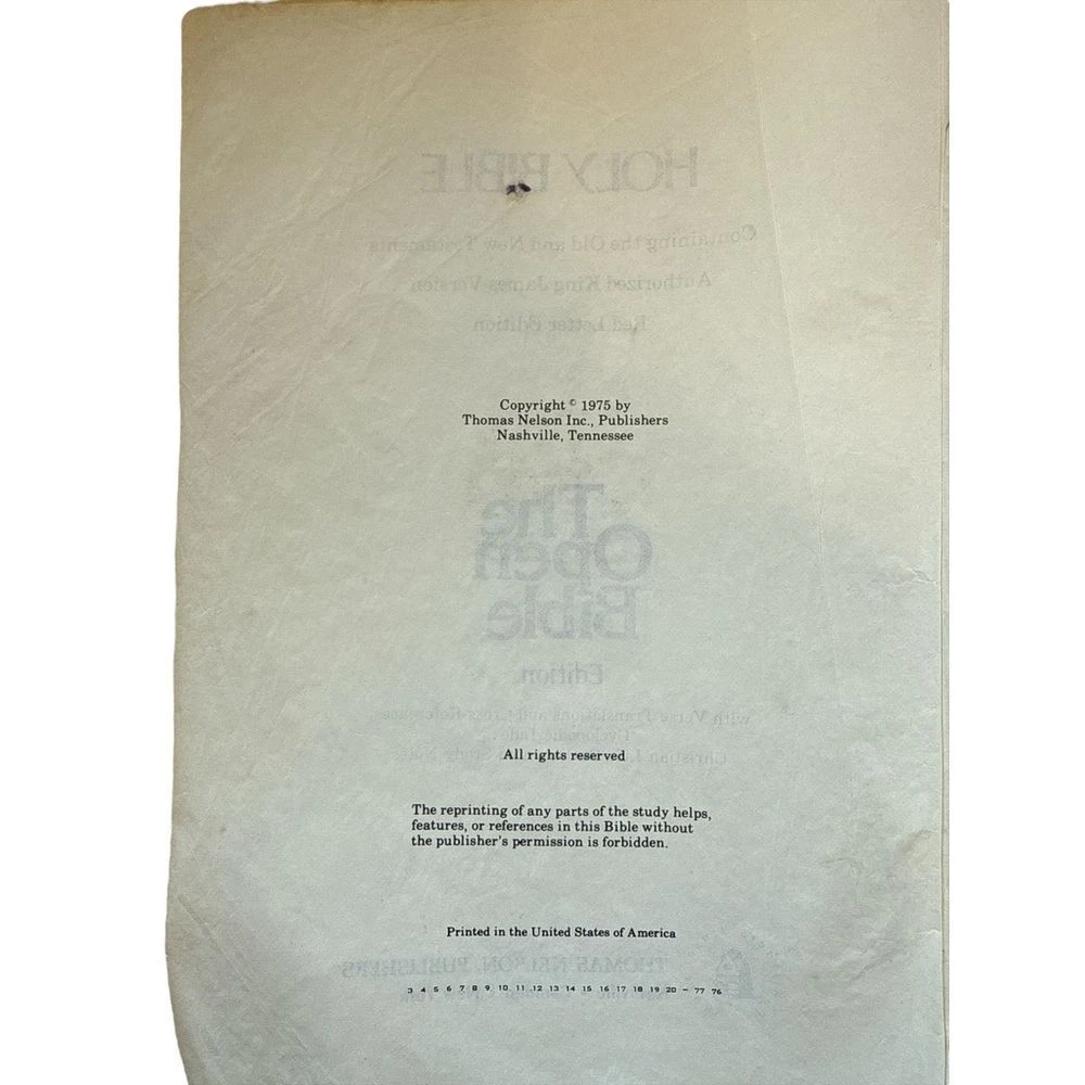 Vintage Thomas Nelson Holy Bible in burgundy bonded leather. This is The Open Bible Edition featuring the King James Version with red letter text. Includes verse translations, cross-references, cyclopedic index, and Christian life outlines and study notes. Perfect for daily devotionals, Bible study groups, church services, or as a meaningful gift for special religious occasions. Year: 1975 Book Title: The Open Bible - King James Version Language: English Topic: Christianity, Religious Studies, Biblical Studies, Scripture Publisher: Thomas Nelson Publishers Format: Leather Genre: Religious, Christian Literature, Biblical Reference, Sacred Texts, Religious Study Keywords: holy bible, king james version, kjv, red letter, open bible, thomas nelson, study bible, religious book, christian scripture, burgundy bible, leather bible, vintage bible, religious text, biblical reference