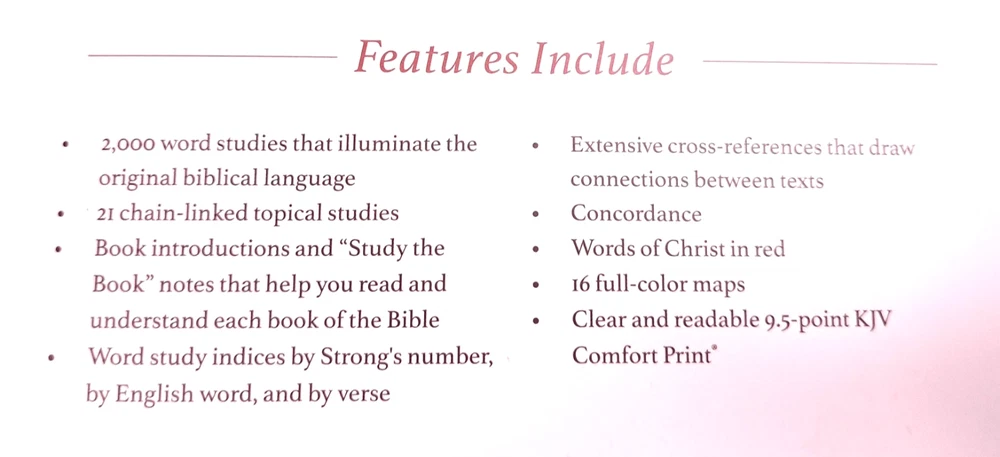 This Bible is absolutely beautiful—the pink Leathersoft cover is elegant and feels great in hand. The red-letter text and Comfort Print make reading so easy on the eyes. The 2,000 keyword studies are incredibly helpful for deeper understanding of Scripture. Perfect for personal study or as a meaningful gift—love it!